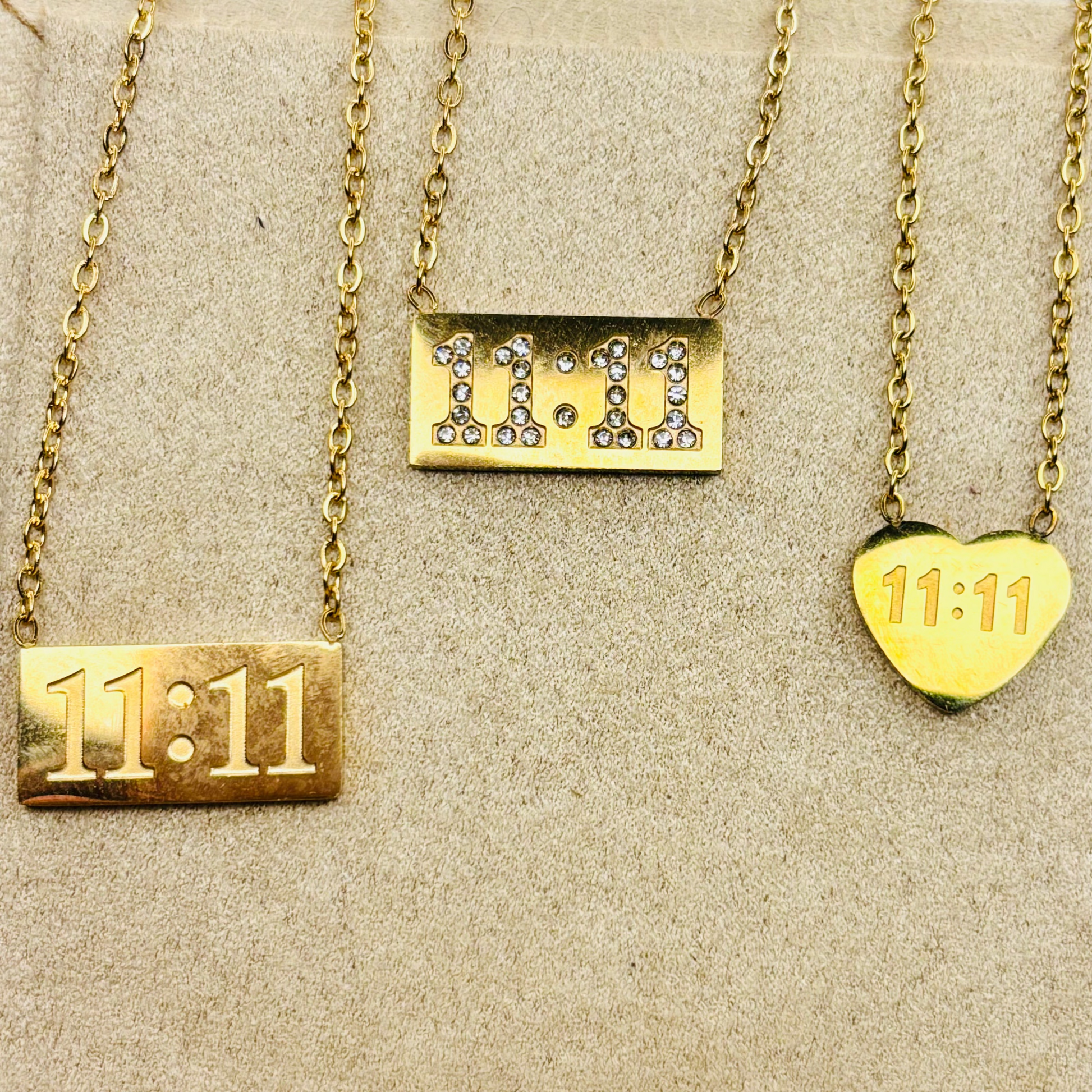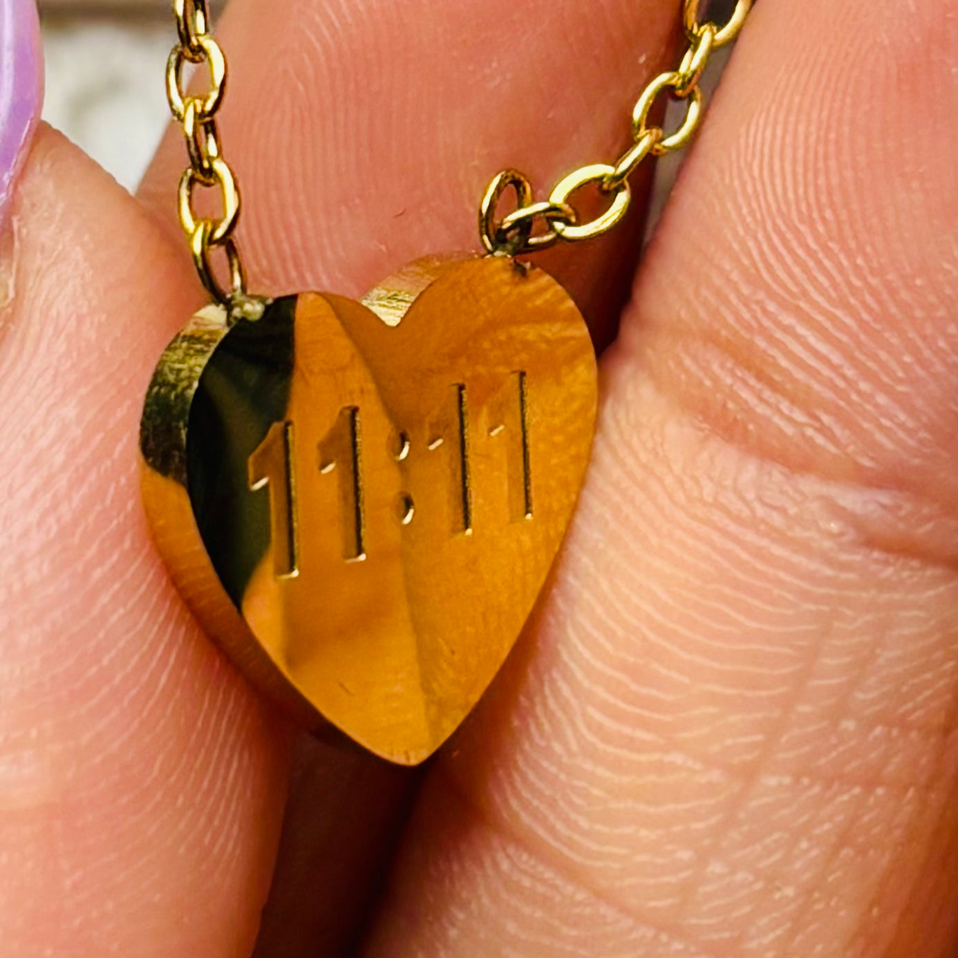 A gold heart pendant etched with 11:11, blending warmth and symbolism in one timeless piece. Perfect for gifting or as a personal reminder to trust your journey.