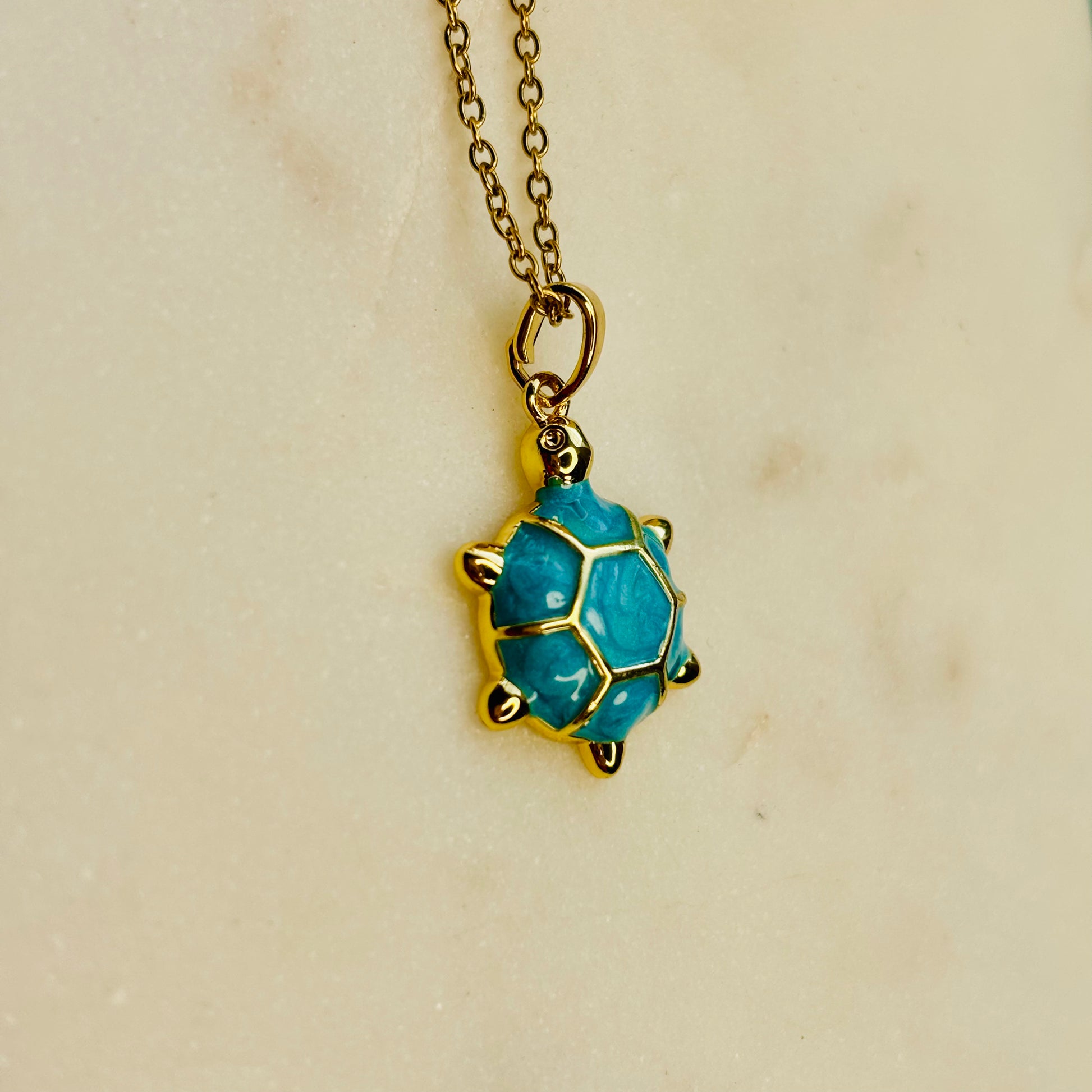A calming aqua-blue turtle with golden shell detailing symbolising protection, peace and slow-living energy. Its minimal but charming silhouette makes it a piece you'll reach for every day.