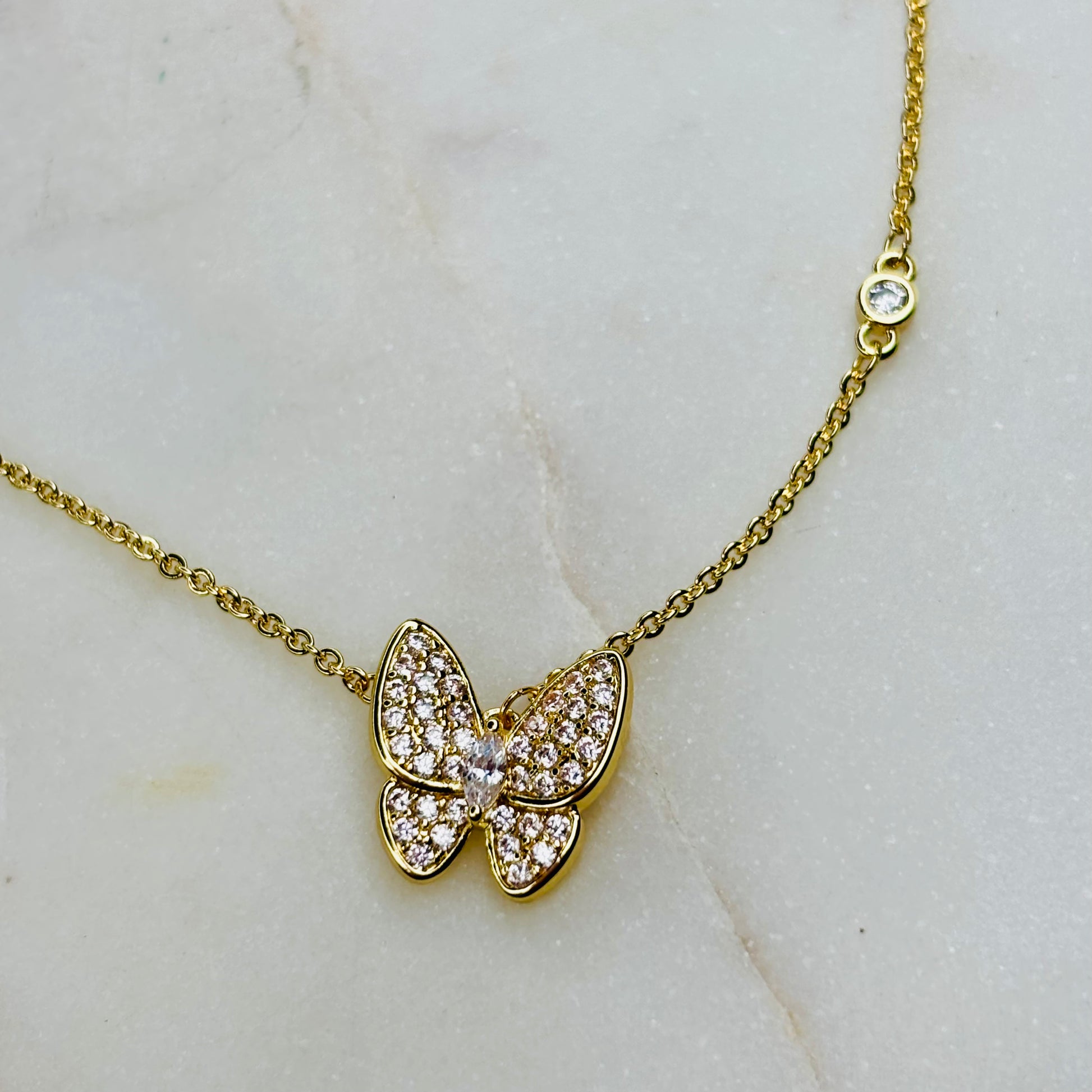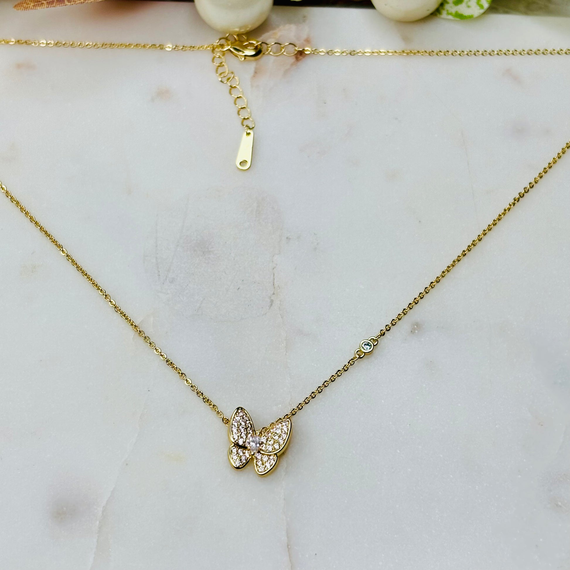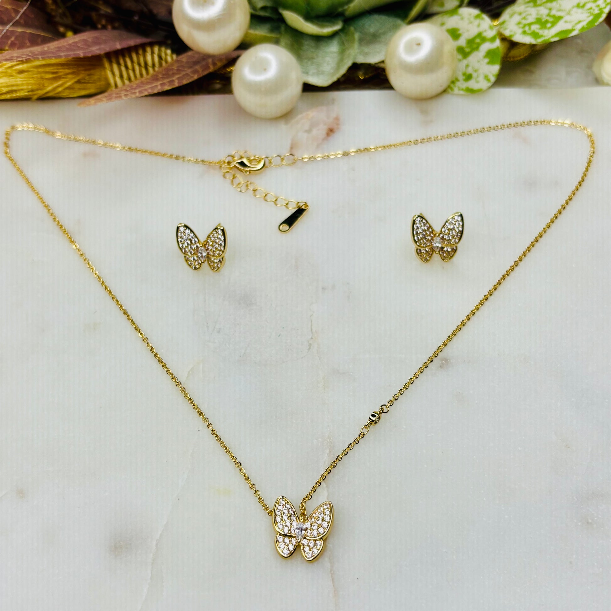 Add a touch of whimsy to your look with this golden butterfly jewelry set, featuring delicate zircon-infused butterflies on each earring and pendant. Its small, charming design makes it perfect for everyday sparkle or layering with your favorite pieces.