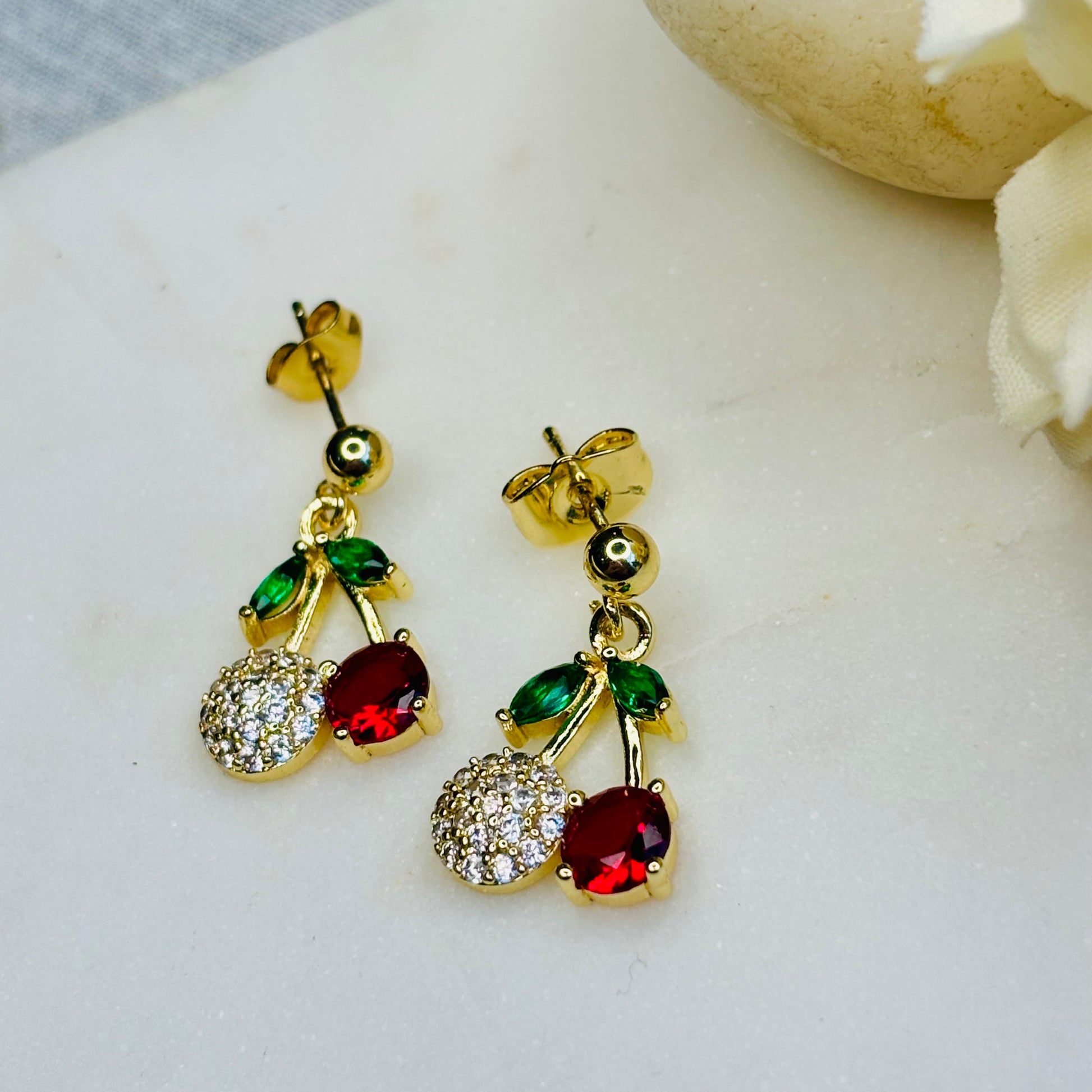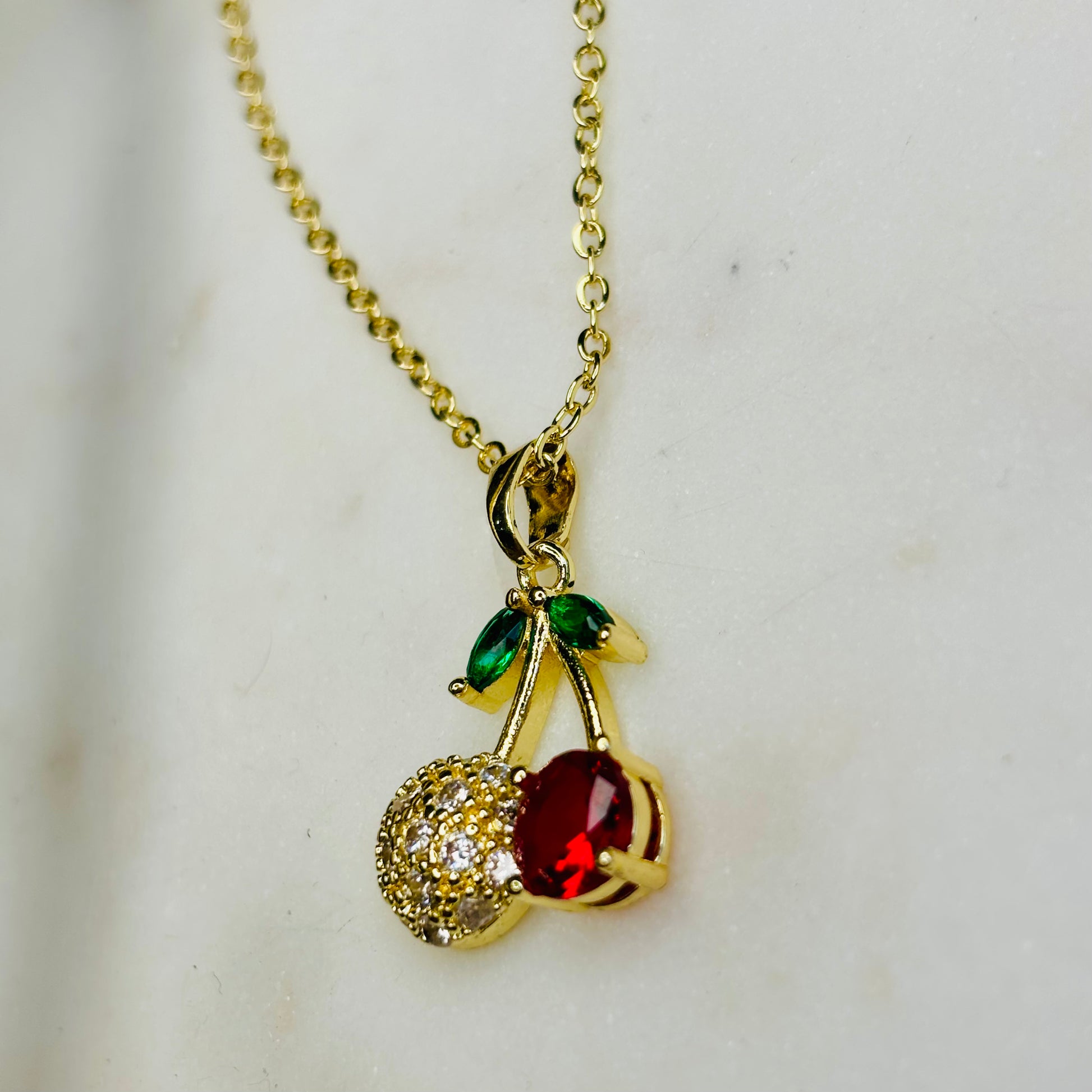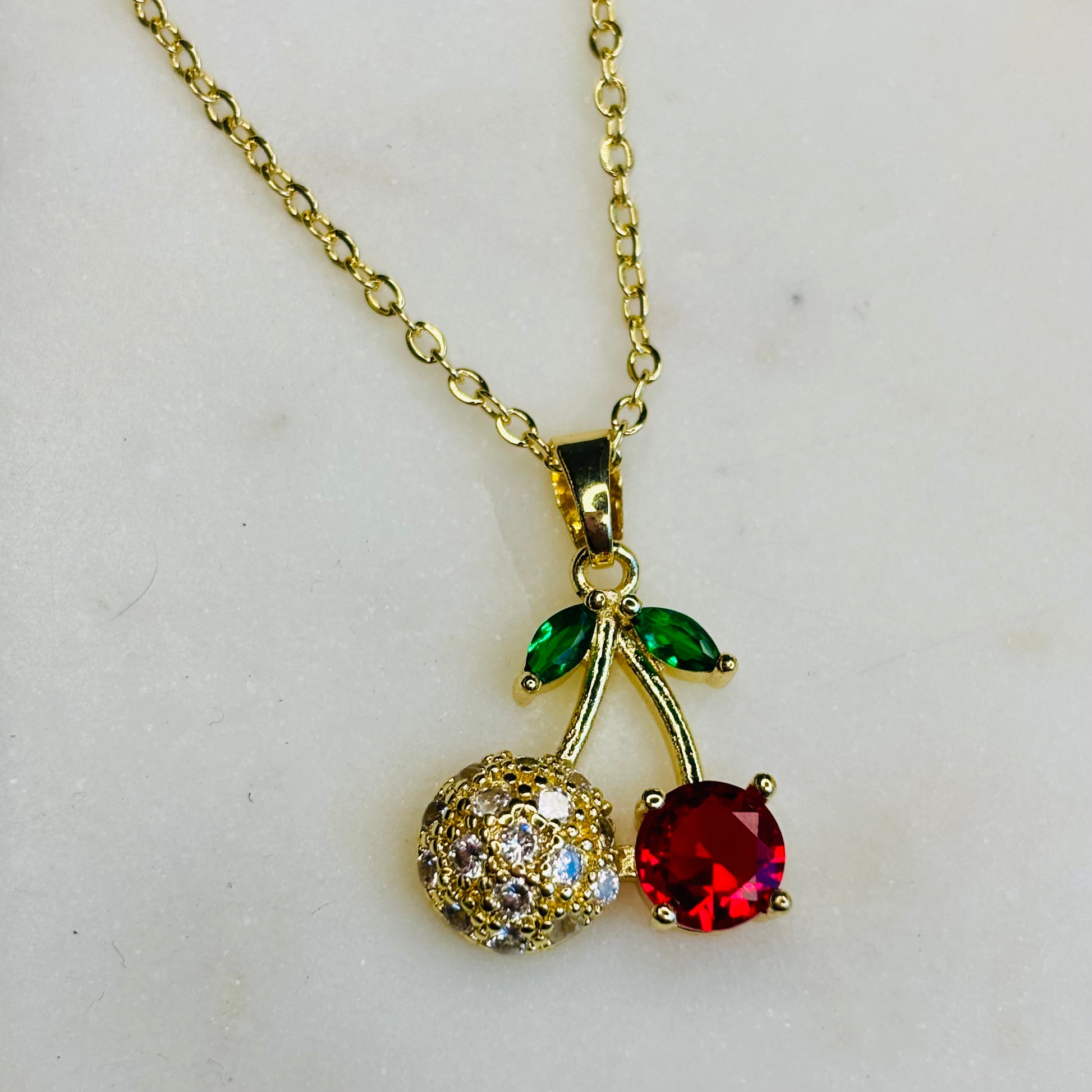 Introducing the Cherry Blossom Duo Necklace—a delightful golden treasure featuring two cherry-shaped charms. One cherry sparkles with dazzling zircons, while the other glows with a vibrant red crystal, both hanging from a gleaming golden branch accented by two green crystal leaves. This playful design adds a fresh pop of color and charm to any outfit.