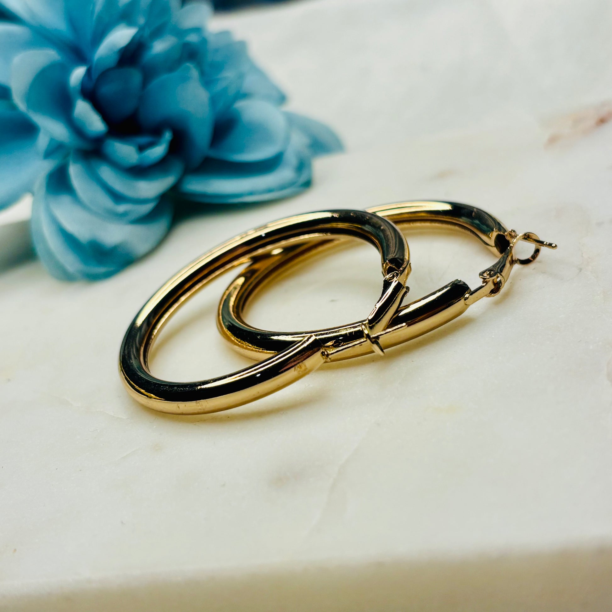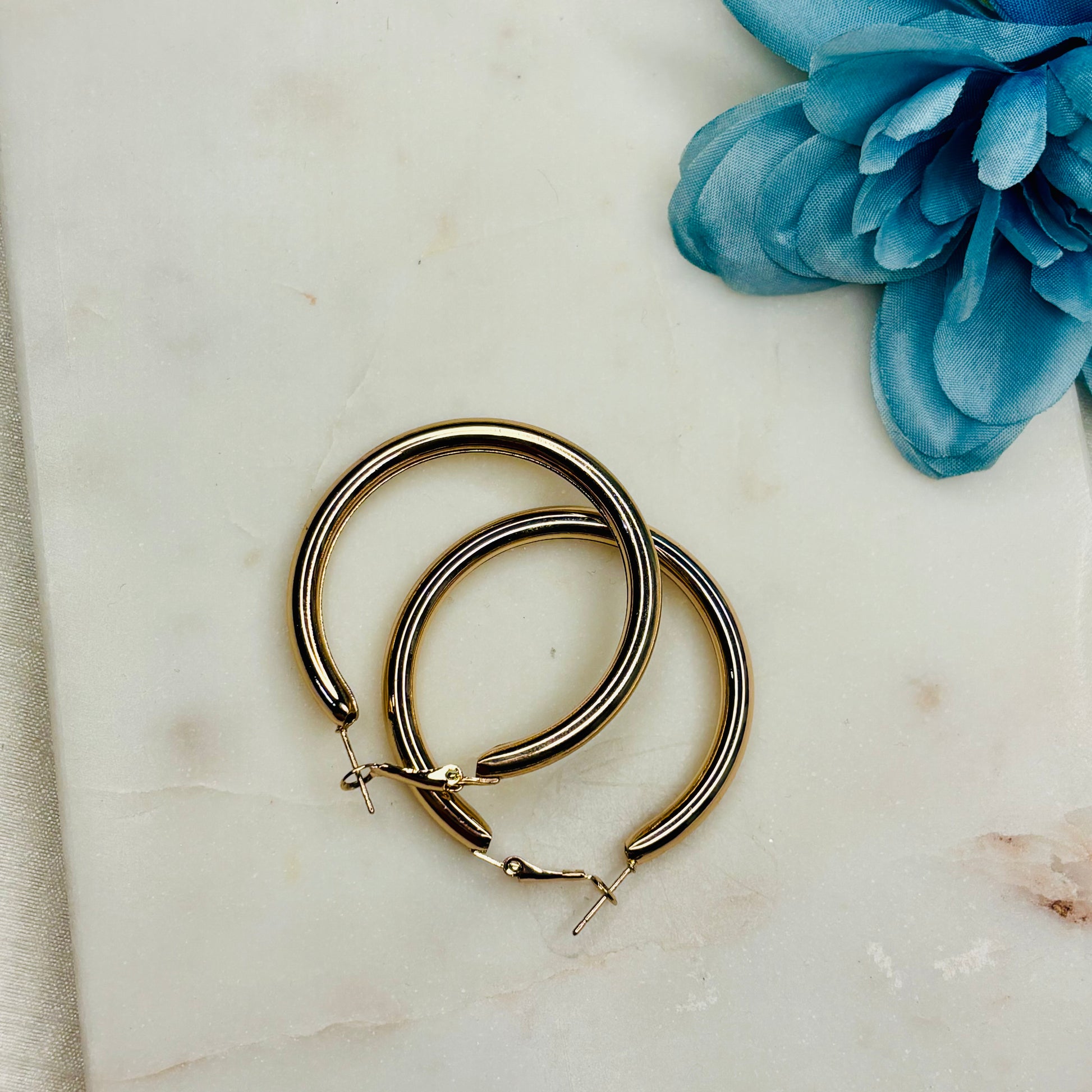 Thick, smooth gold hoops with a glossy finish. Bold yet minimal, they’re the perfect upgrade from everyday hoops.