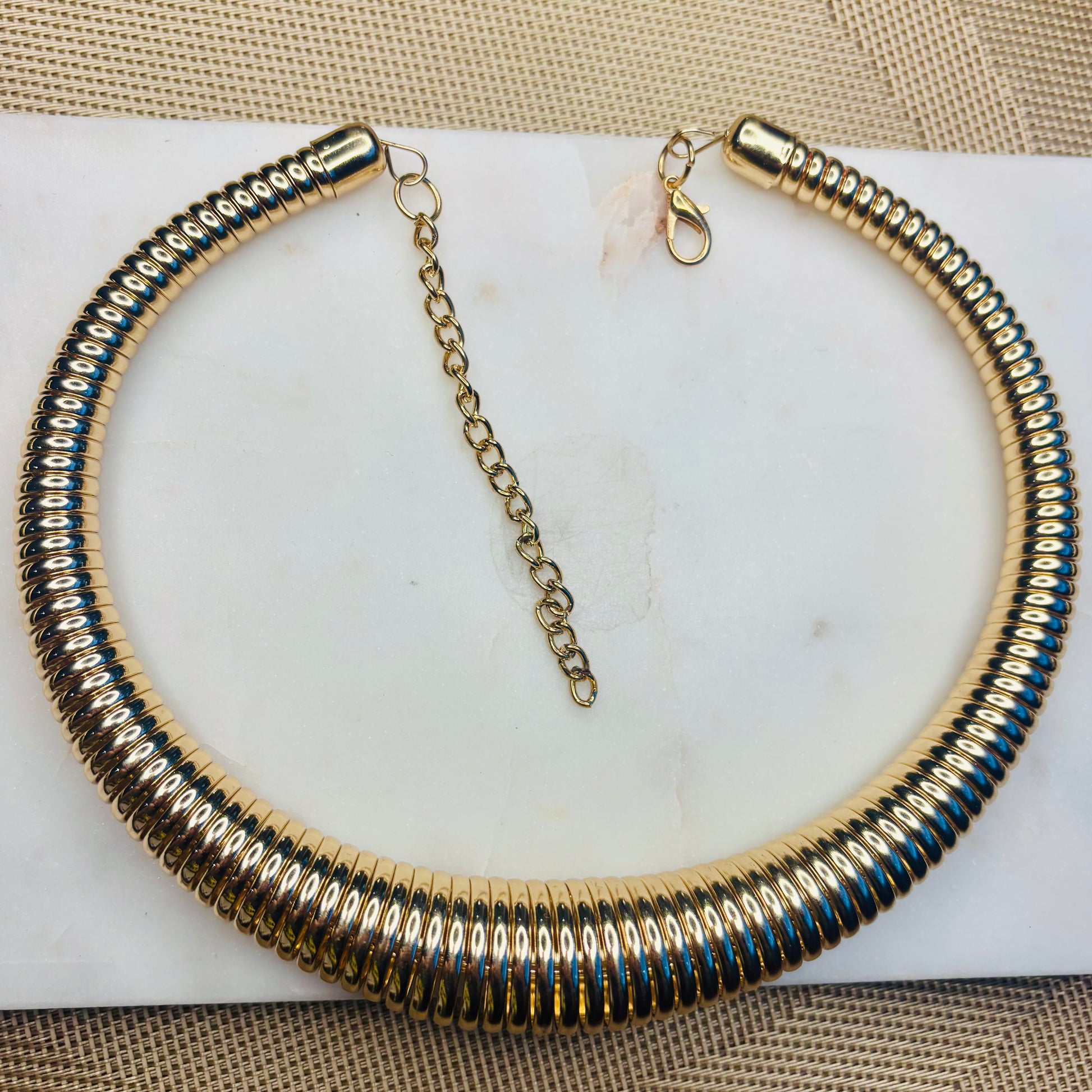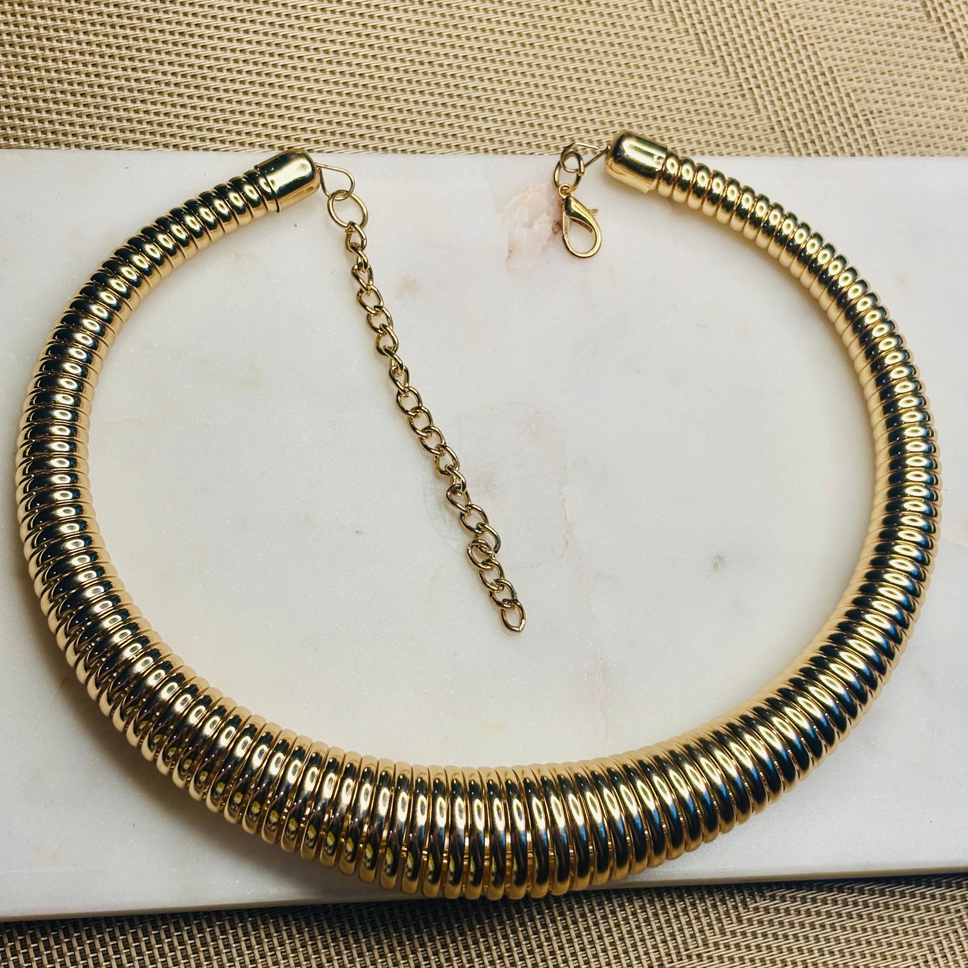 A chunky, bold, gold-toned hasli choker or collar necklace. It is constructed from a flexible, thick tube or series of joined rings with a distinct corrugated or ribbed texture, resembling a flexible metal spring or hose. This heavy, sculptural design is characteristic of vintage-inspired or high-fashion statement jewelry. It features a lobster clasp and an adjustable extender chain for versatile fitting around the neck. This is a power piece, adding a strong, architectural element to any wardrobe.