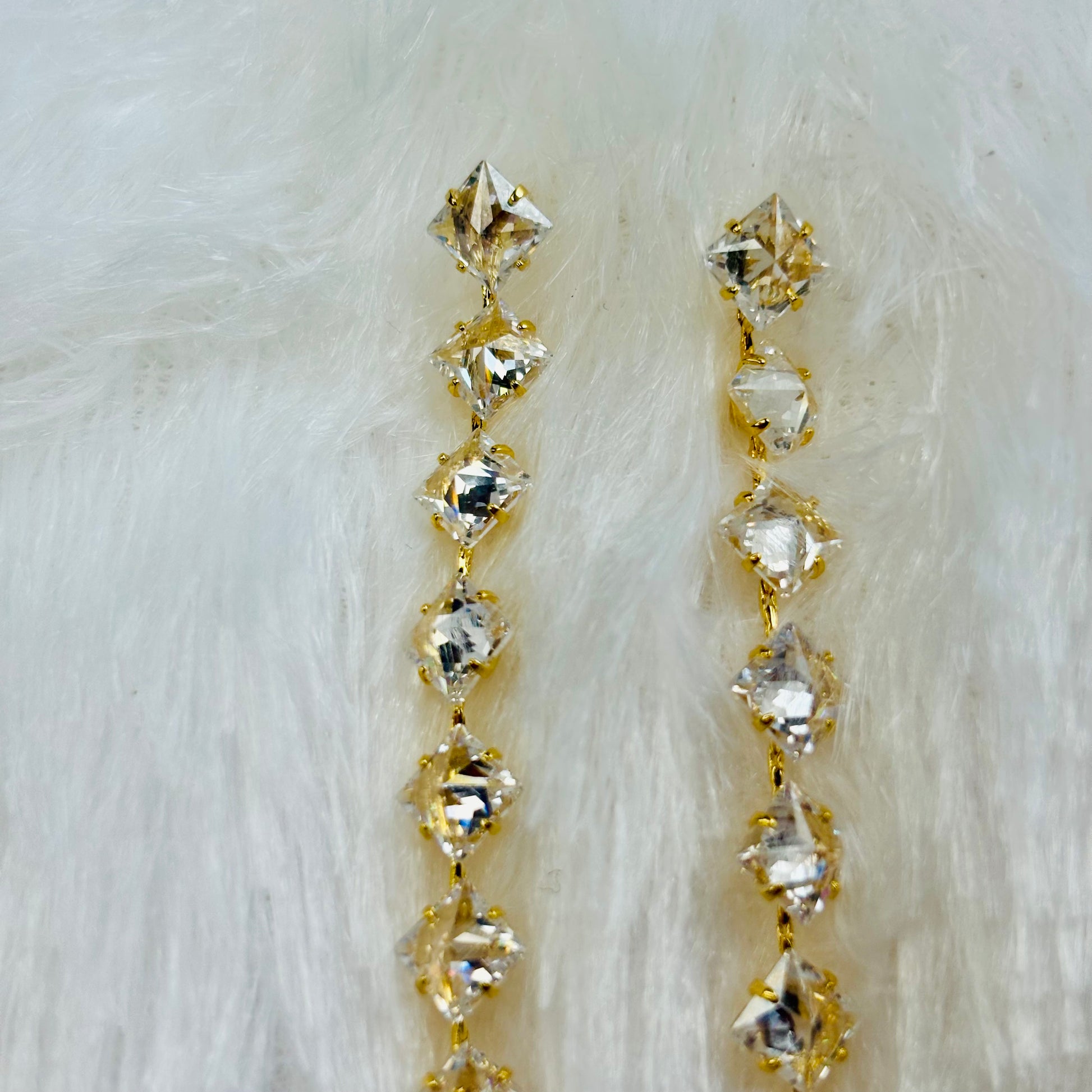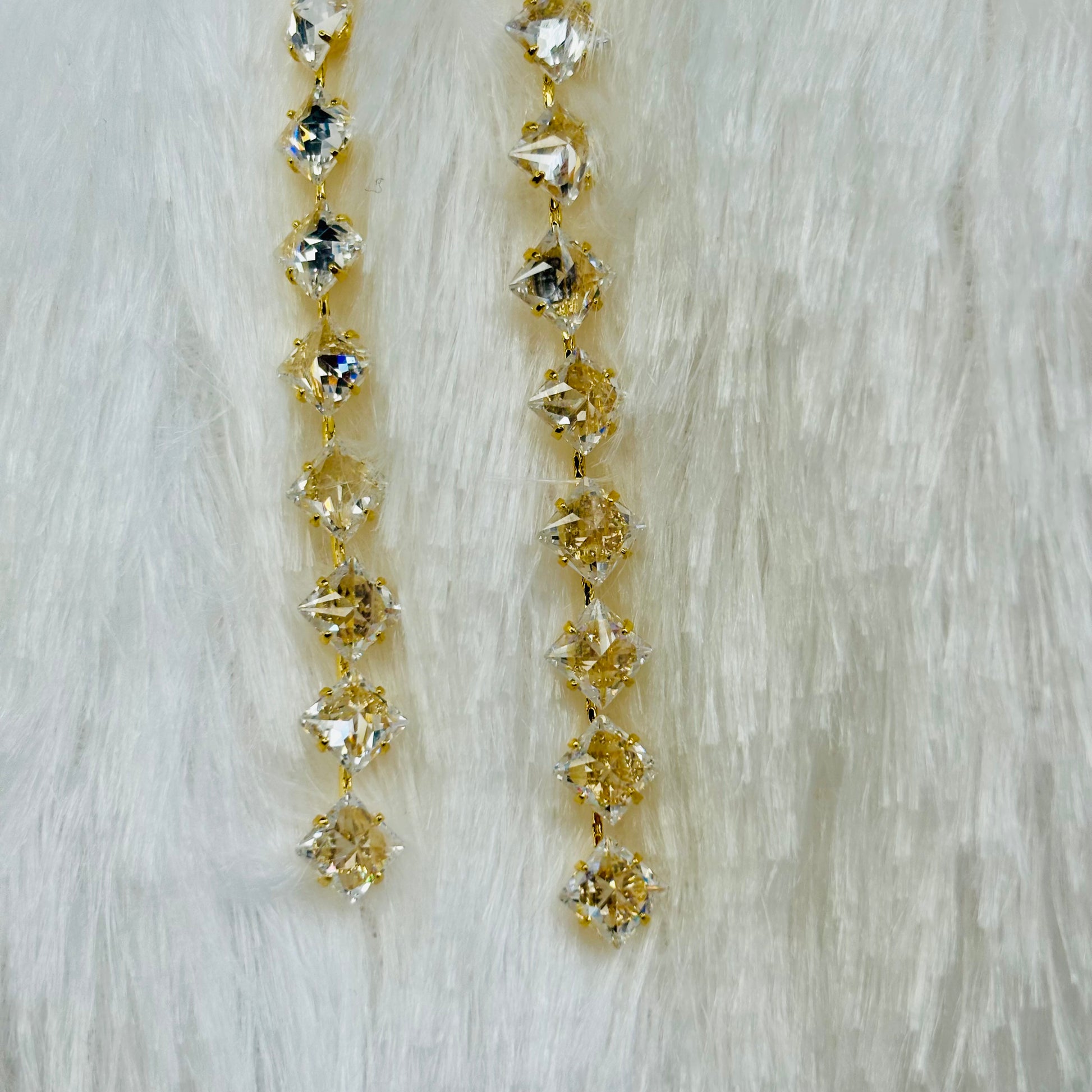 Long dangling earrings with rows of geometric-cut crystals set in gold.