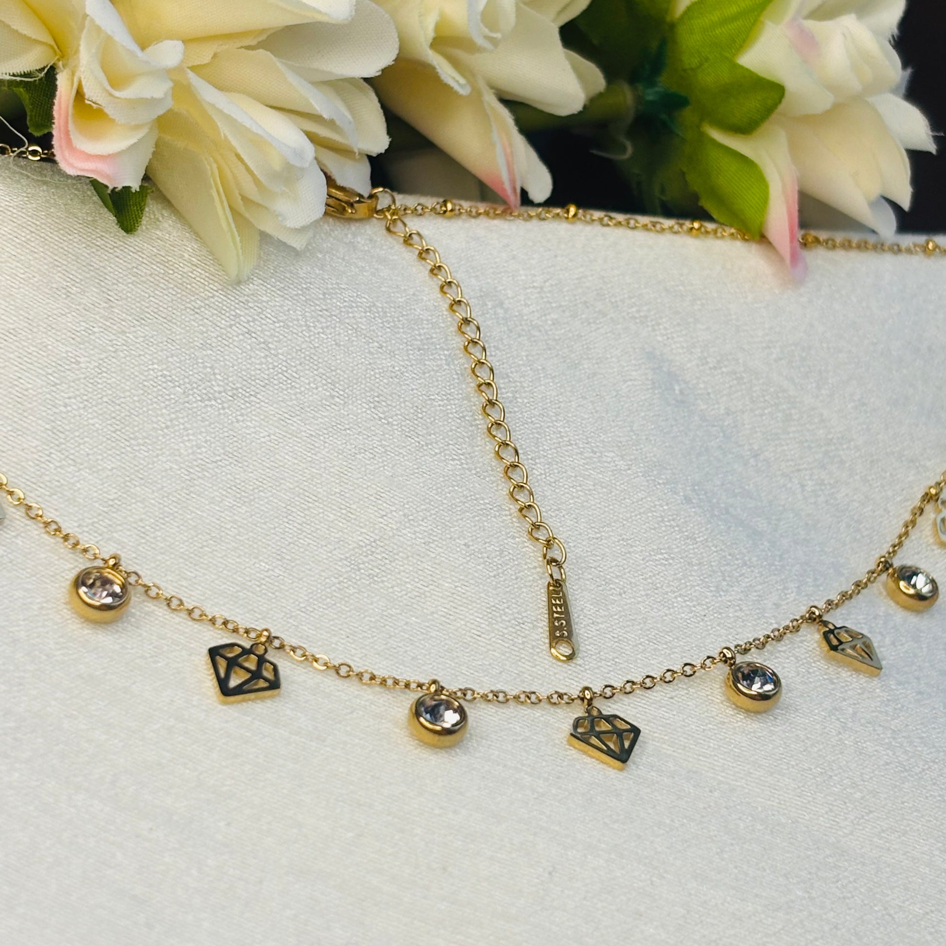 Add a touch of sparkle with this playful Diamond Zircon Charm Necklace. Golden diamond shapes dance along the chain, alternated perfectly with shimmering zircon stones for just the right twinkle.