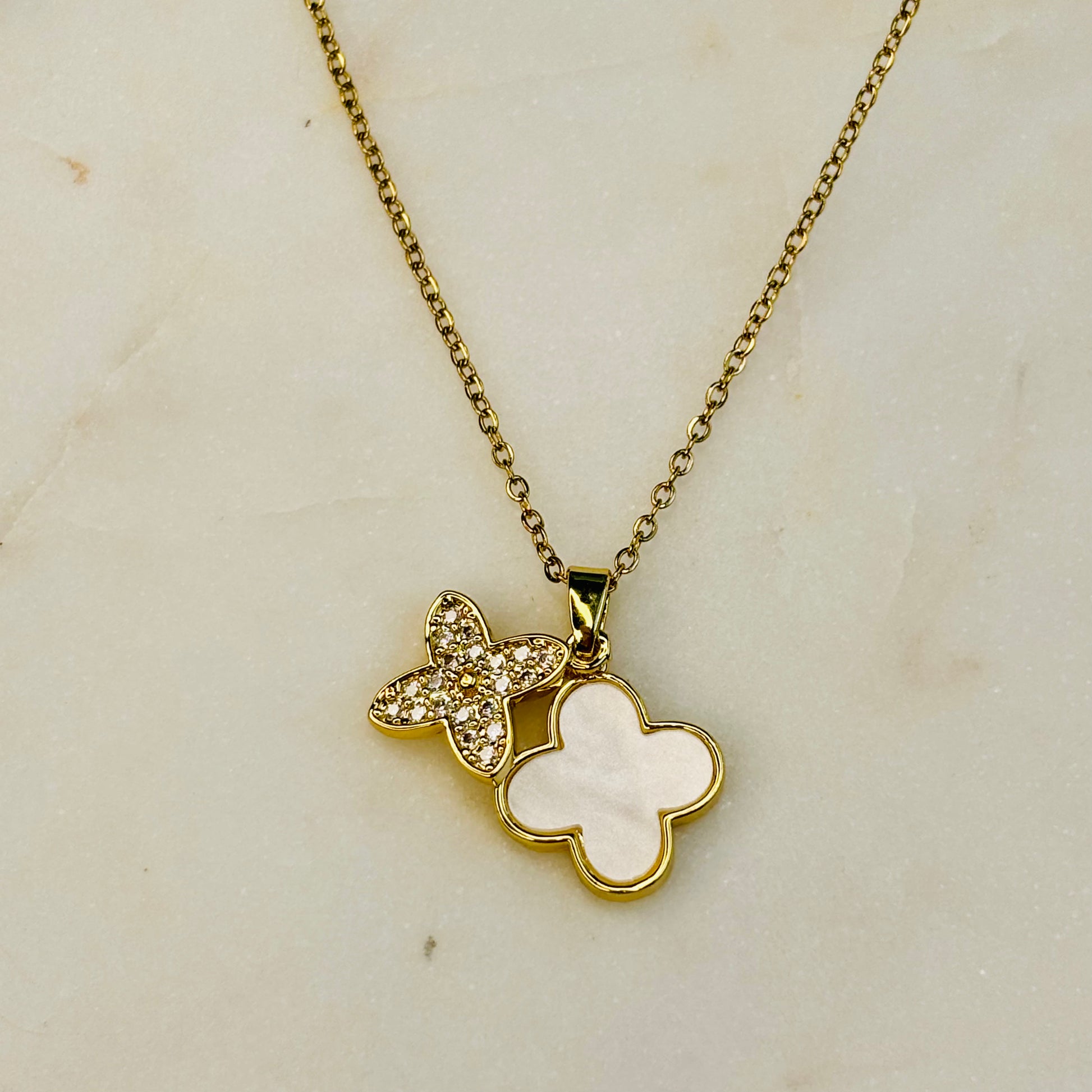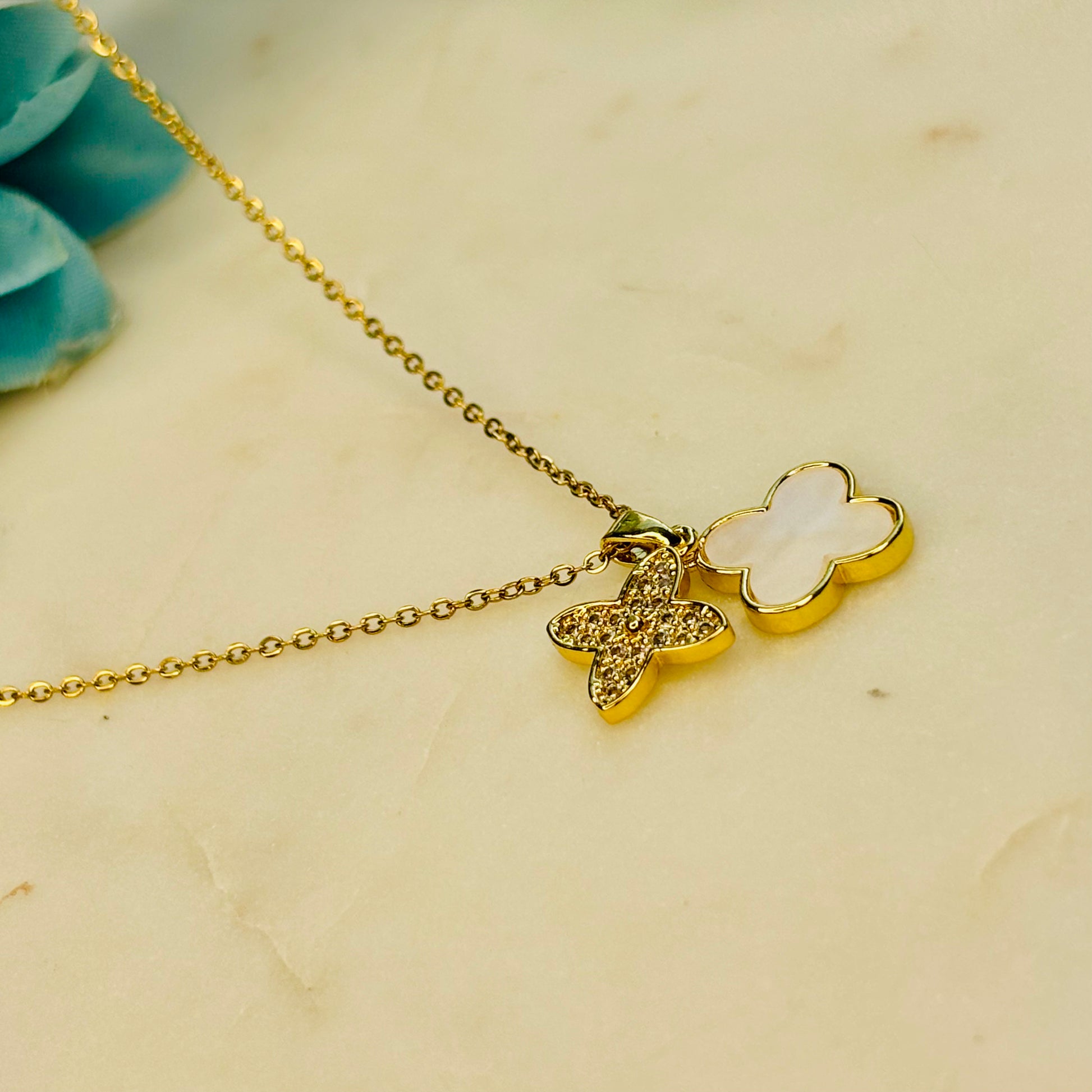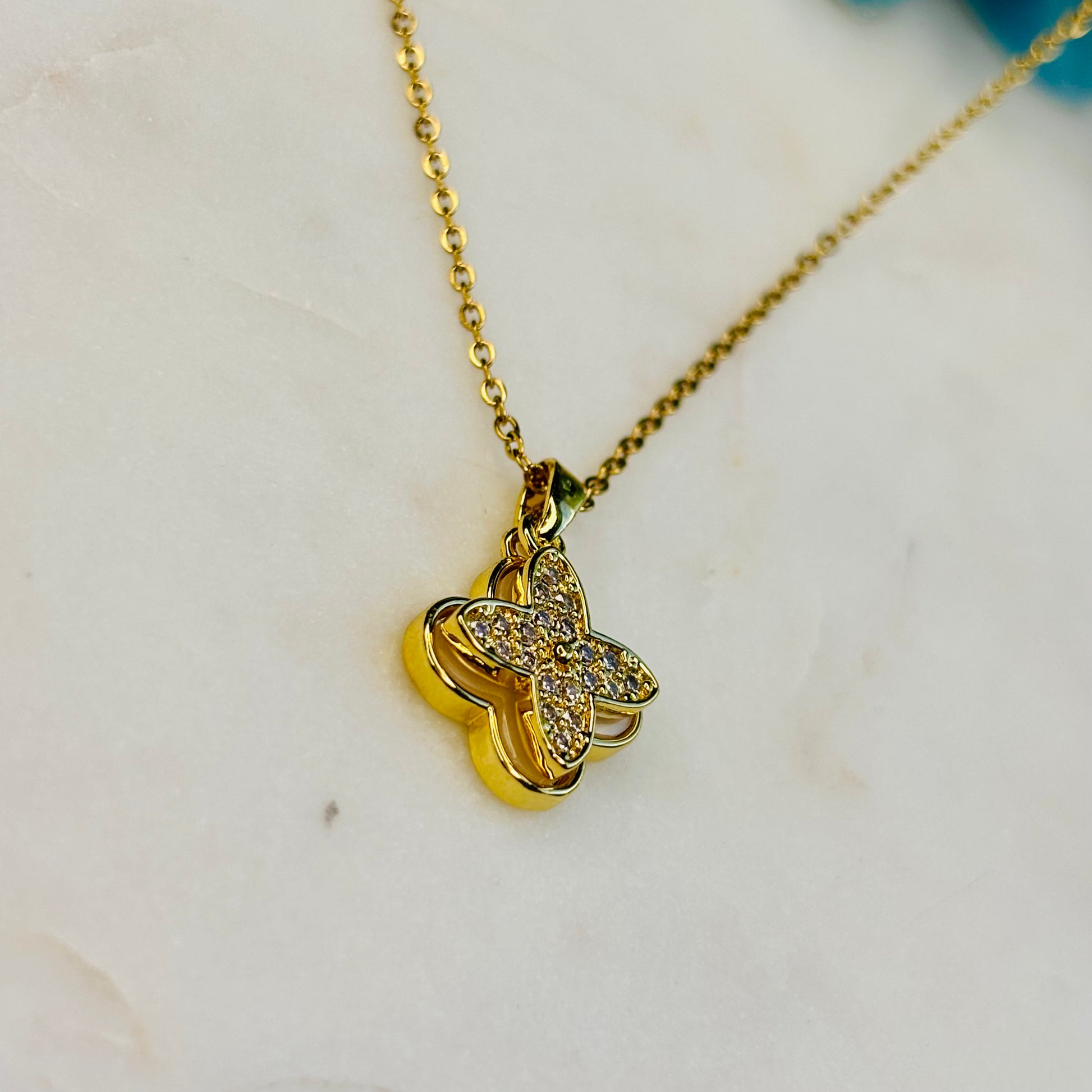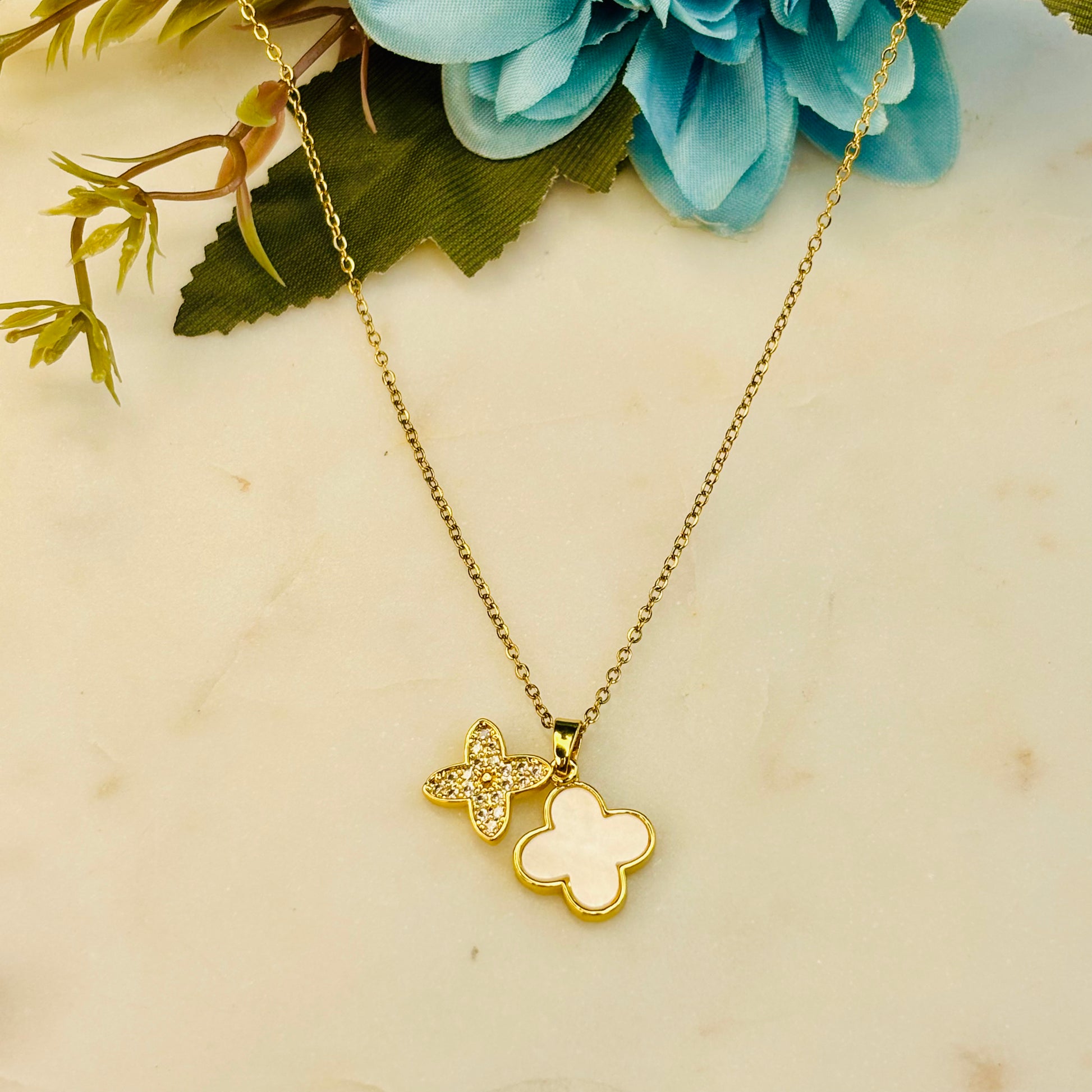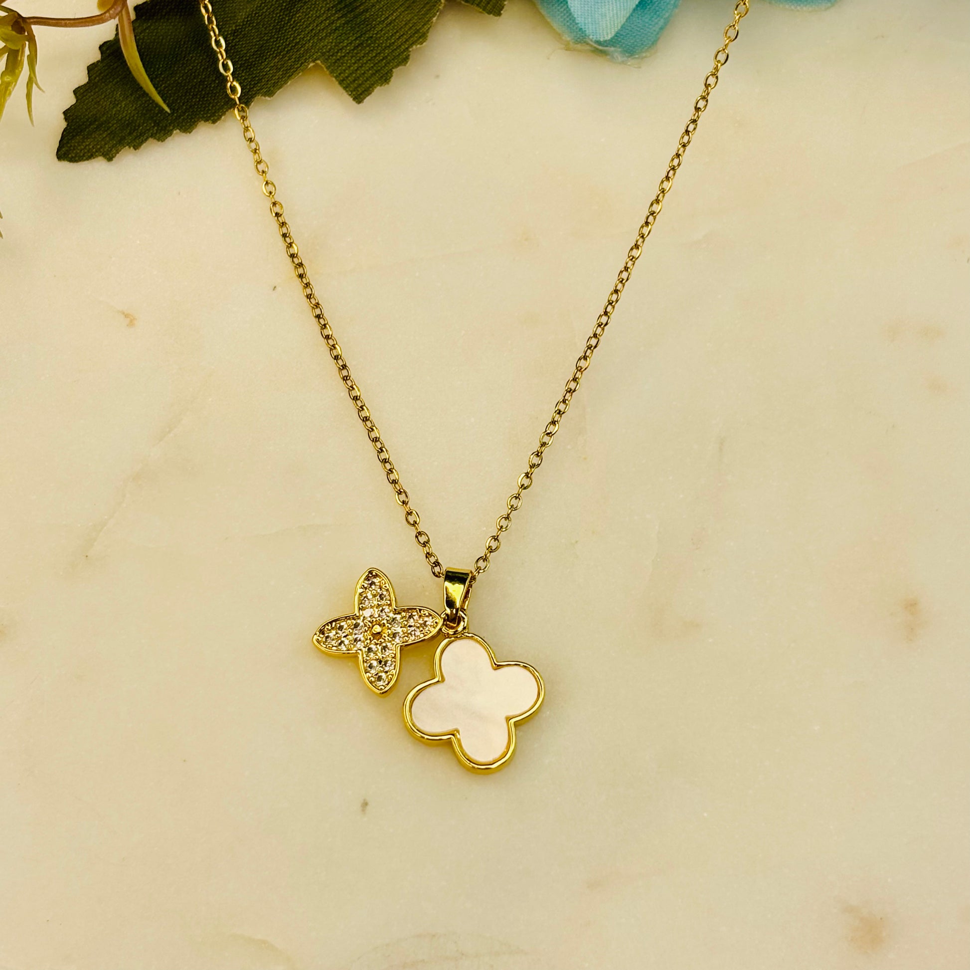 Add a touch of luck and sparkle to your look with this golden Double Clover Necklace, featuring two charming clover pendants—one shimmering with zircon and the other adorned with glossy enamel. This playful accessory brightens any outfit and pairs perfectly with casual tees or elegant blouses.