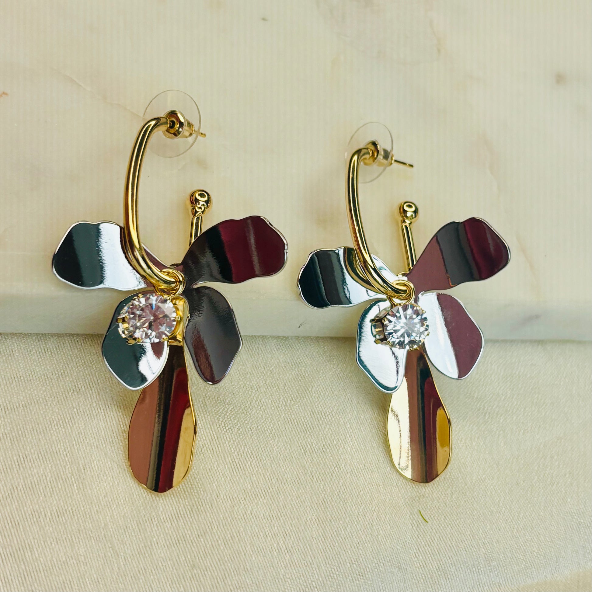 Gold hoops with dual-tone golden and silver reflective floral petals and a crystal center. Modern meets floral elegance.