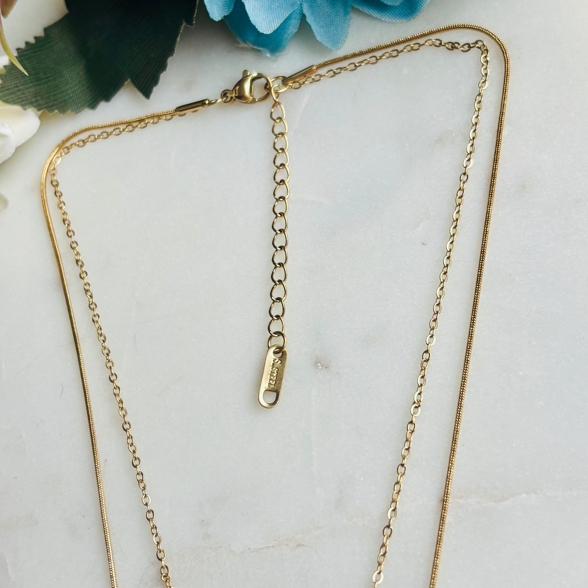 This double-layered golden necklace combines a stunning emerald crystal pendant on one strand with movable golden cubic-rounded beads on the other, creating an abstract, cool look that changes as you style it. Play with the beads to mix, move, or cluster them for a unique vibe every time.