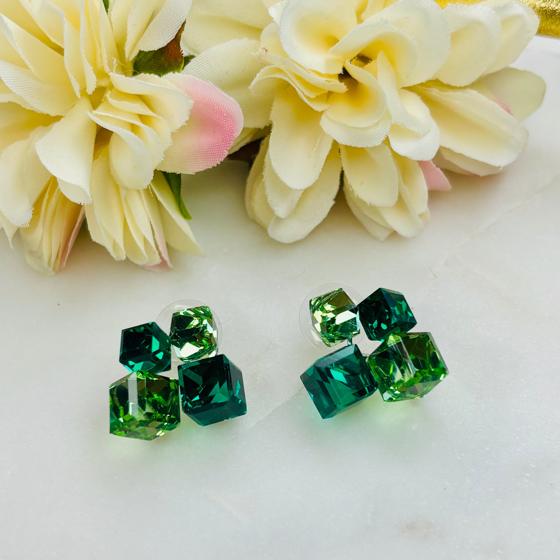 Multi-tone green cubic crystal studs that shimmer with depth and vibrancy.
