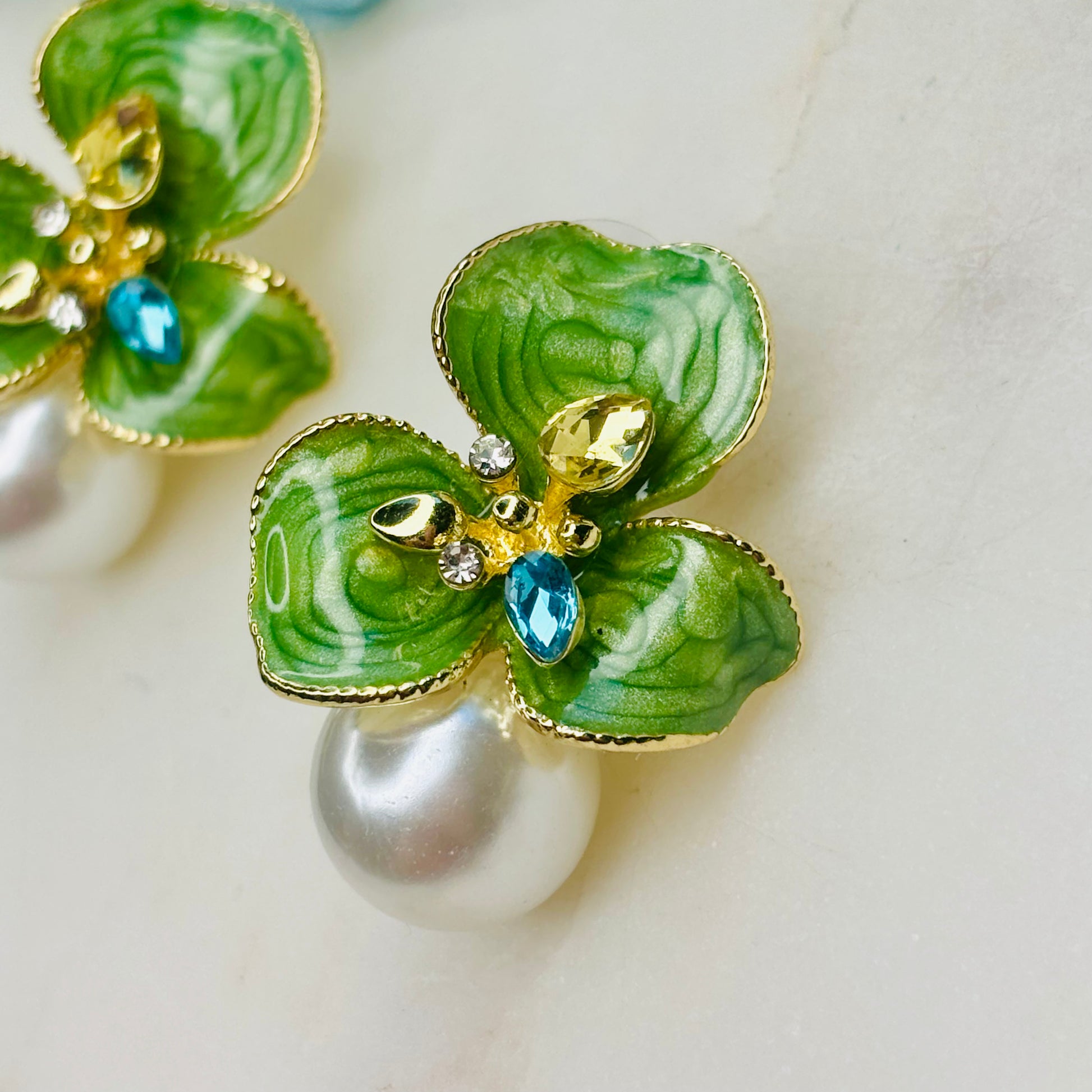 Introducing our enchanting Emerald Petal Bud Studs—where nature meets sparkle! Each stud features three lush green enamel petals that frame a vibrant heart of multicolor crystals, crowned with a lustrous pearl drop that catches the light beautifully. These whimsical earrings bring a fresh, botanical charm to any look.