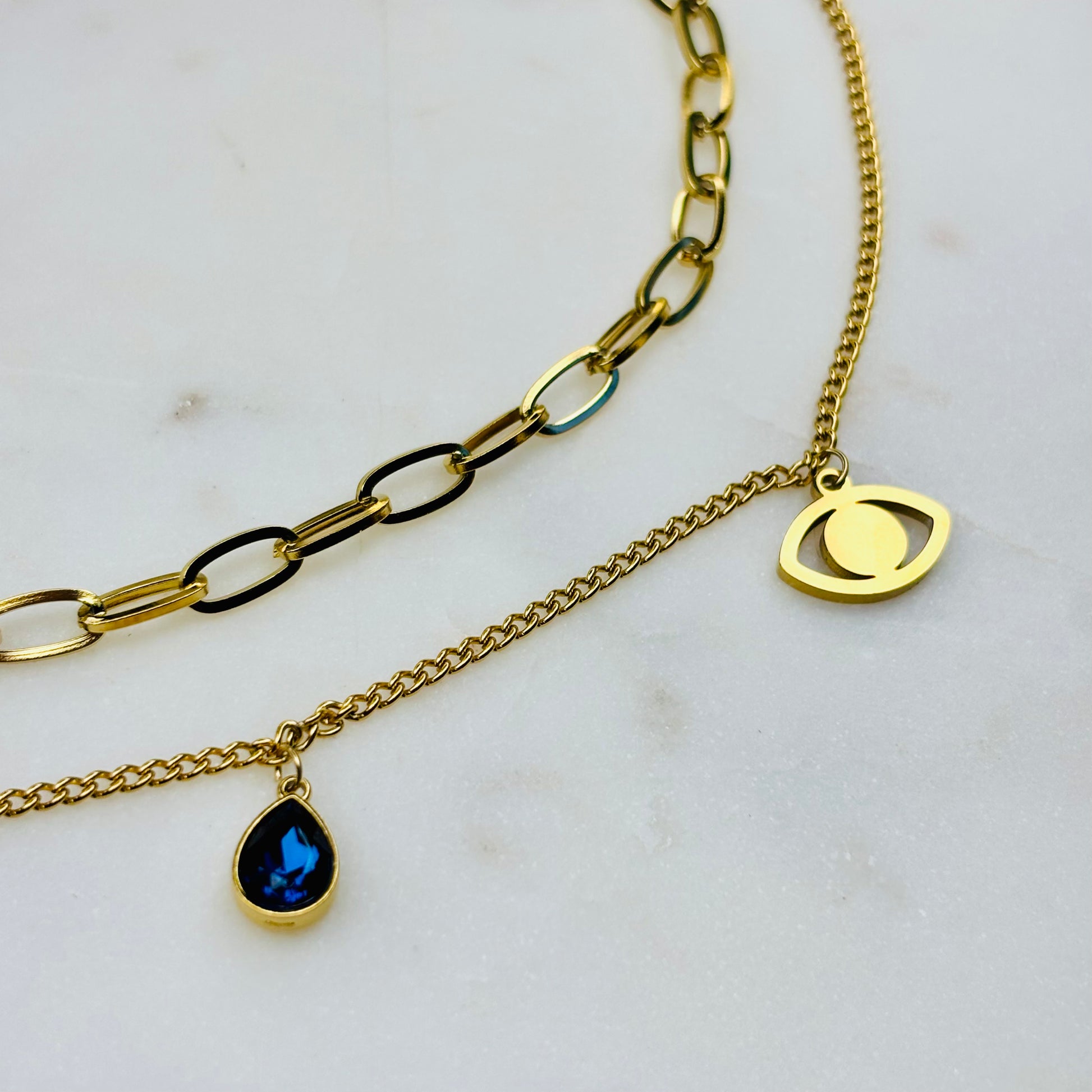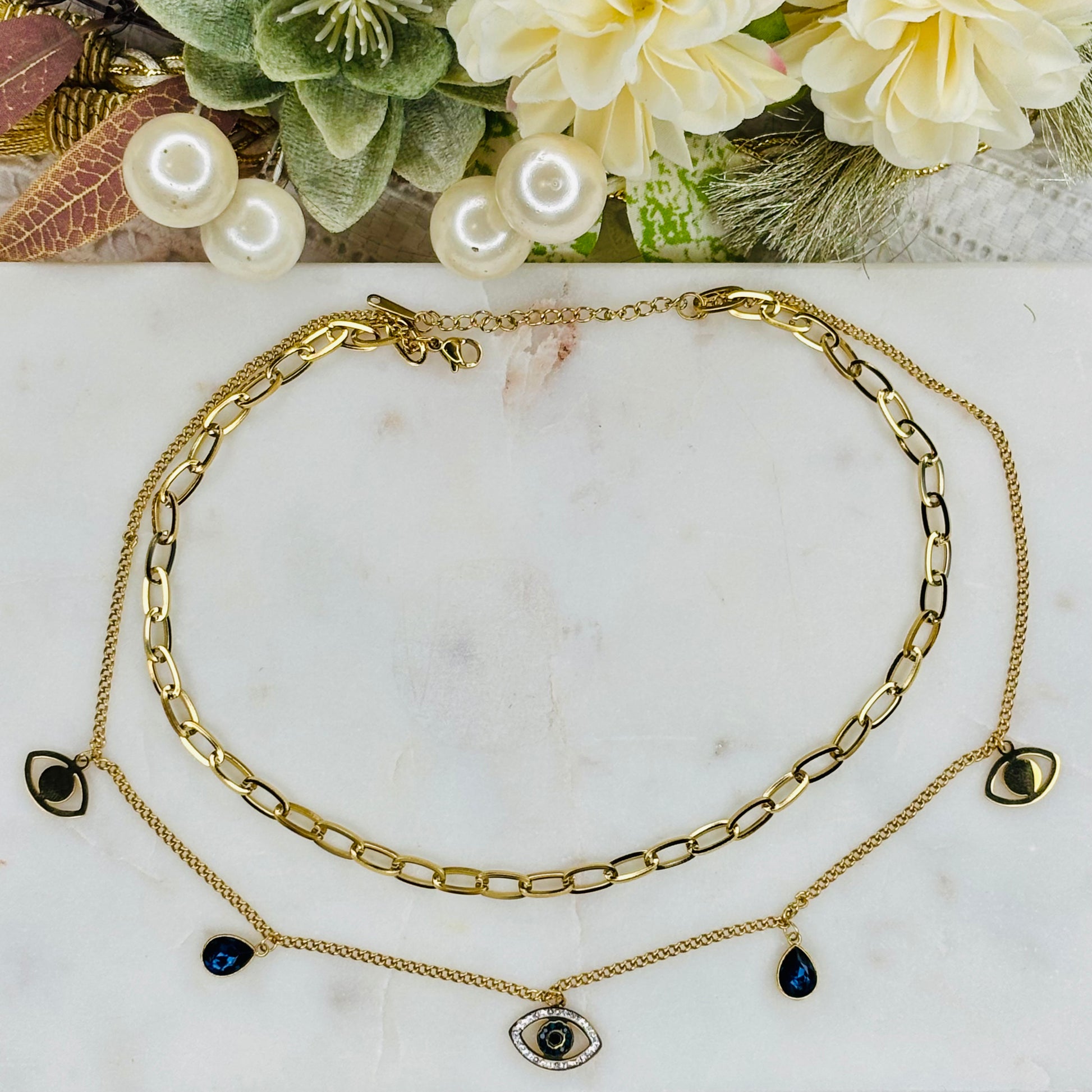A gold-tone two-tiered necklace set. The upper chain is a flat, oblong paperclip link choker, and the lower chain is a finer cable chain featuring multiple dangling gold-tone evil eye charms and deep blue teardrop accent crystals.