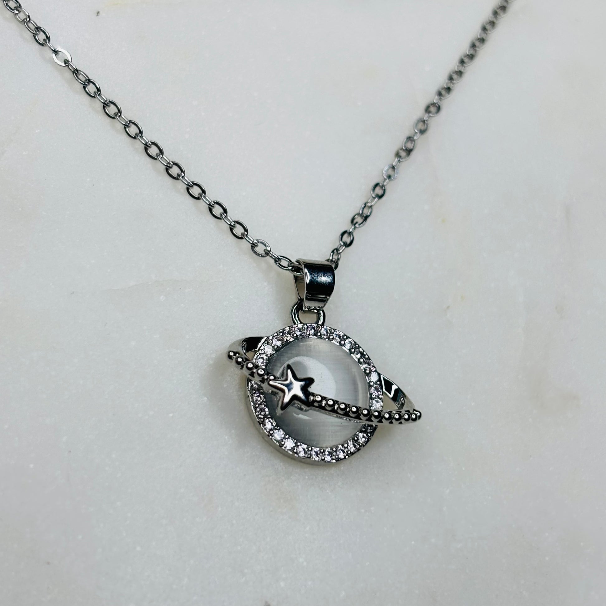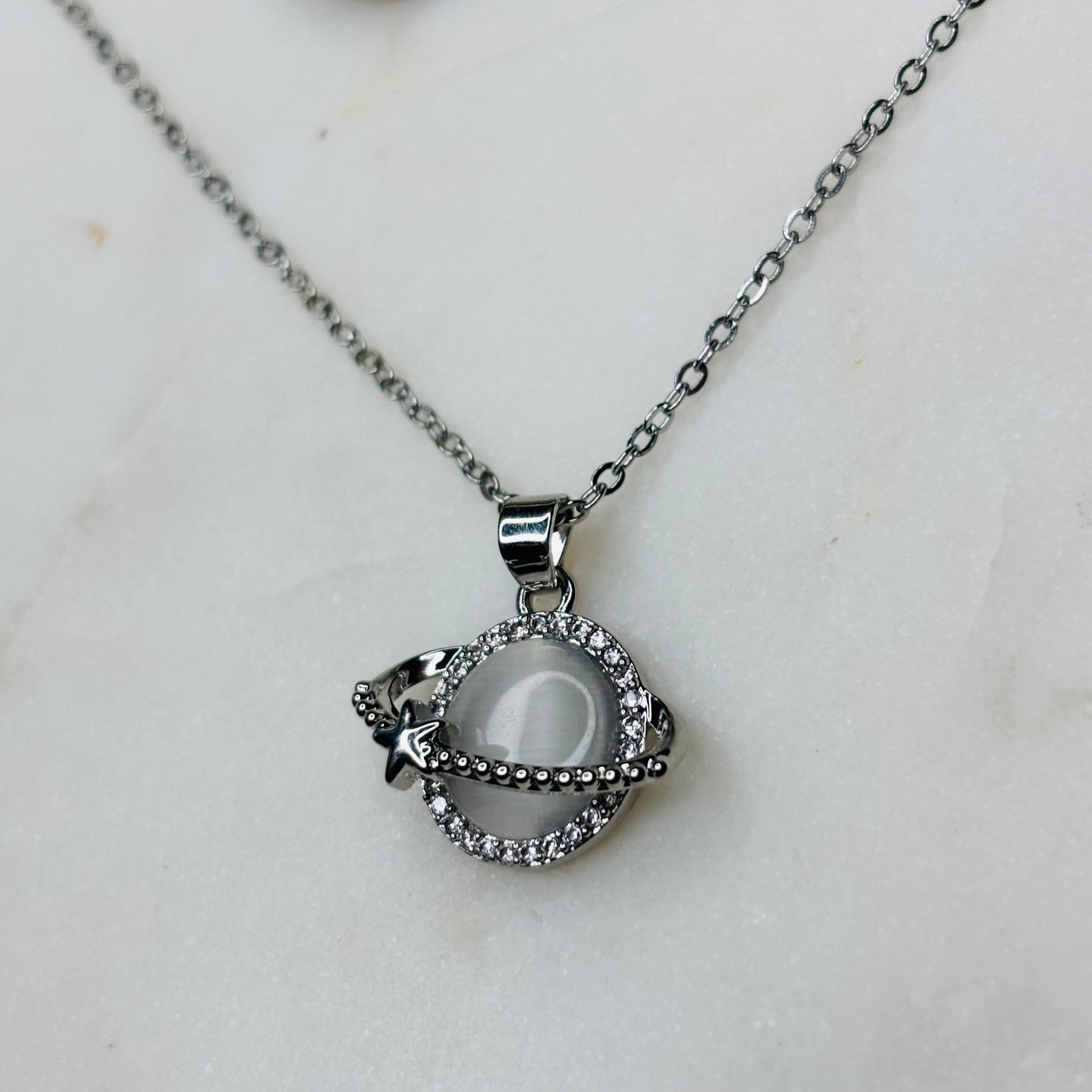 A celestial-themed matching set in a polished silver tone, comprising a necklace and elegant *lever-back hoop earrings. The central motif for both the pendant and the earring drops is a stylized representation of the planet **Saturn* or a similar ringed planet. The "planet" is a smooth, milky white cabochon, likely *opalite* or a similar synthetic stone, encircled by a ring embellished with pave-set clear rhinestones. A tiny, silver-toned star is overlaid onto the cabochon, completing the cosmic theme. The necklace hangs from a delicate, fine-link chain.