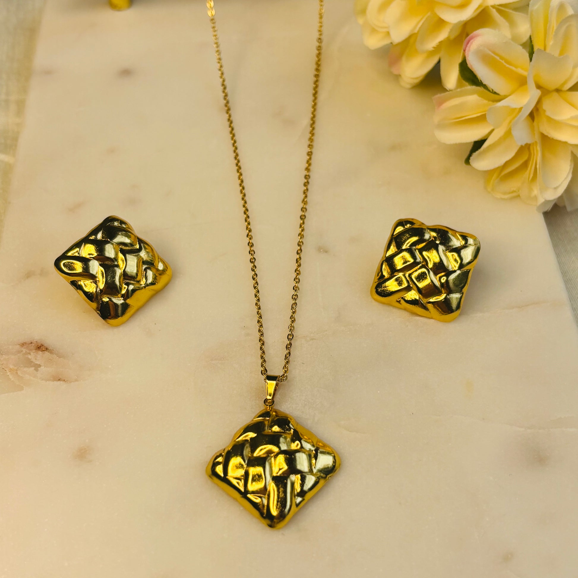 This matching necklace-and-earring set features sculpted squares with an intricate criss-cross texture, bathed in a warm gold tone. The raised weave pattern creates depth and dimension, catching the light beautifully with every movement.