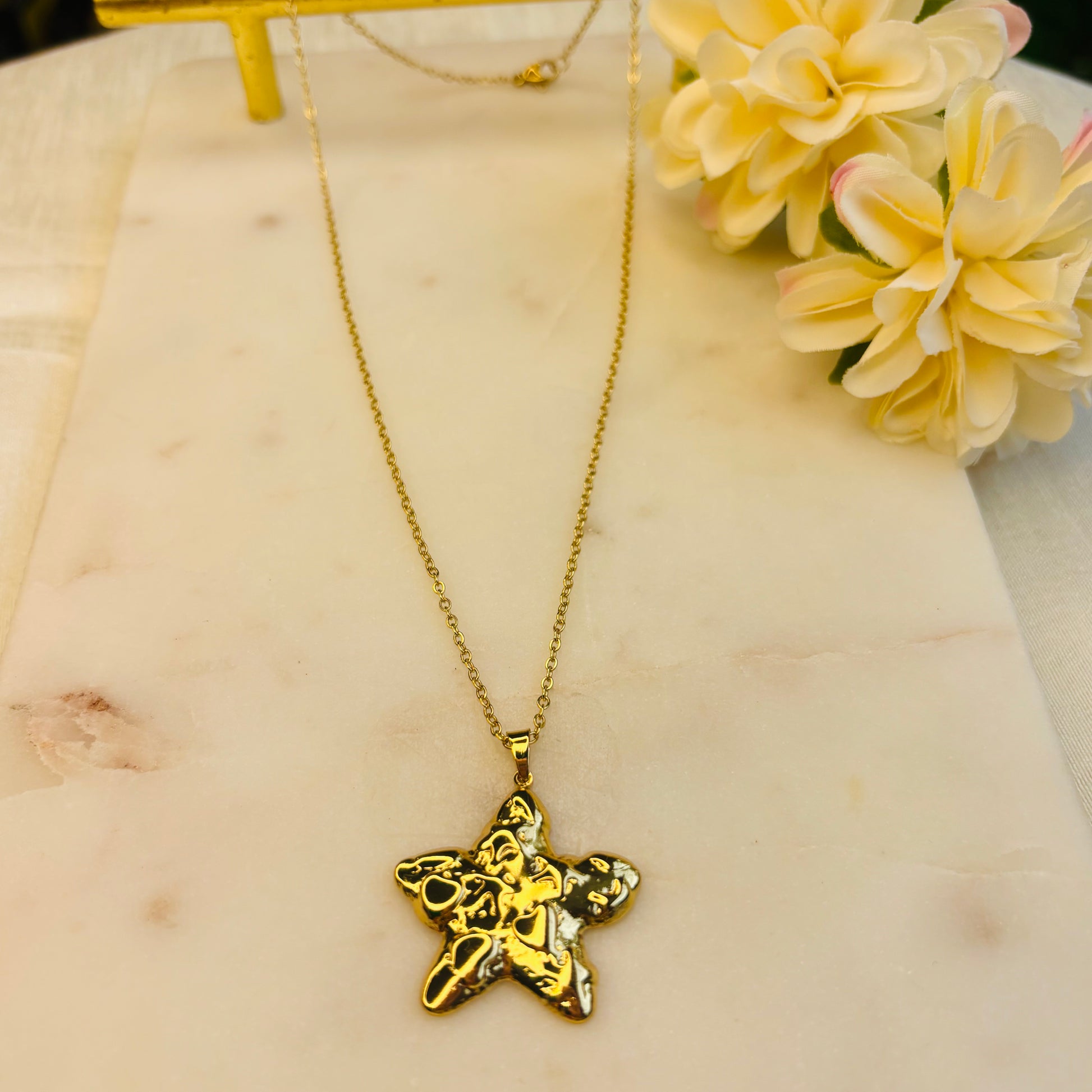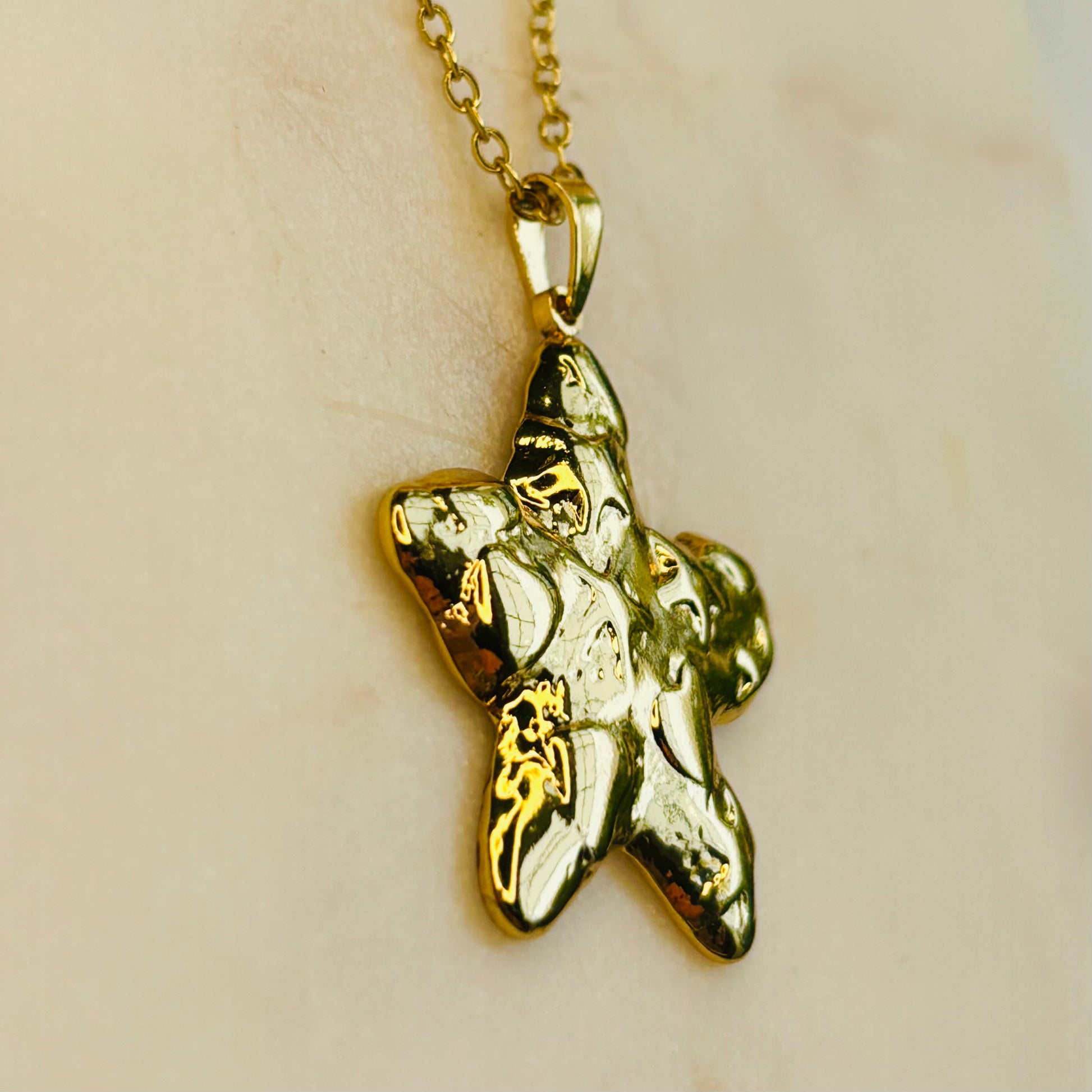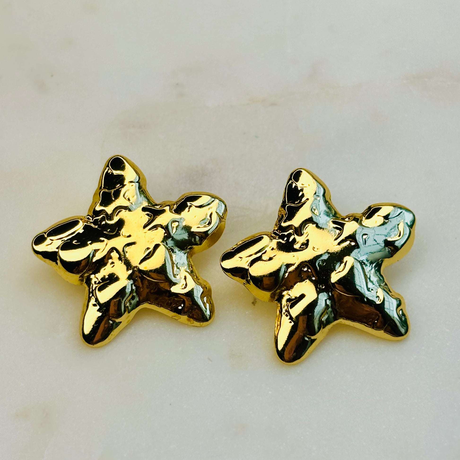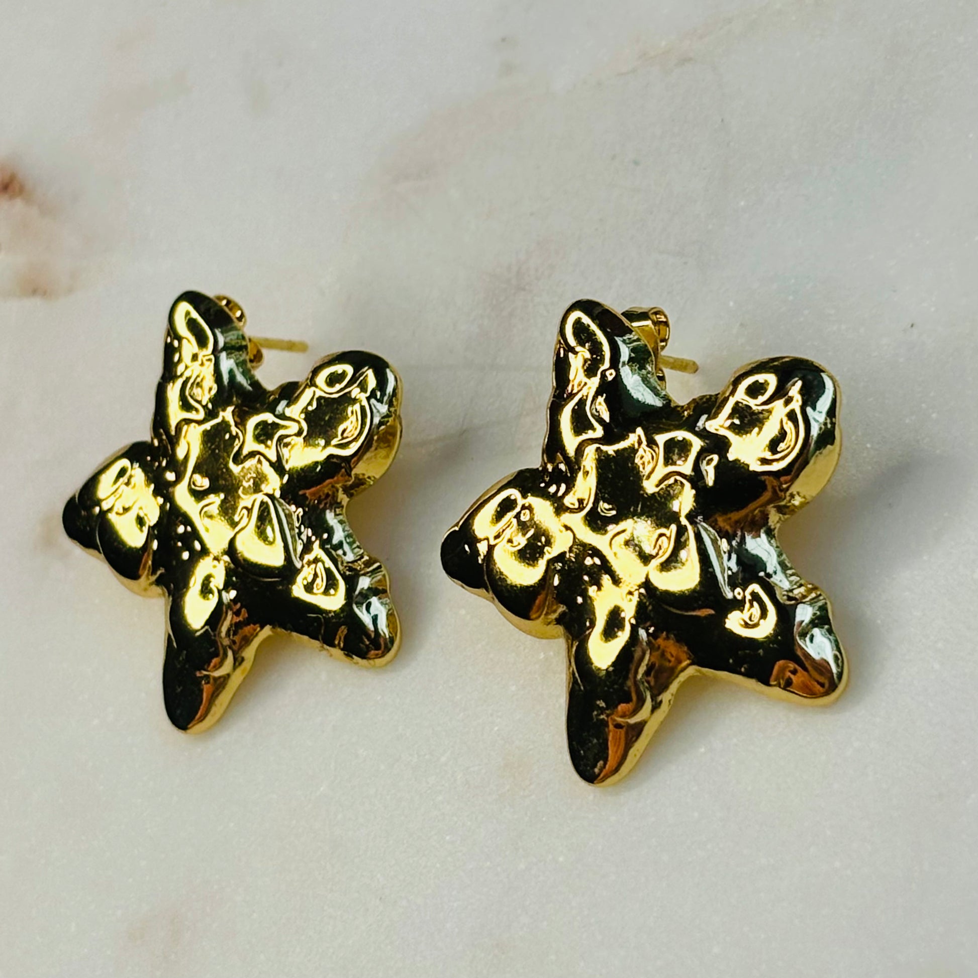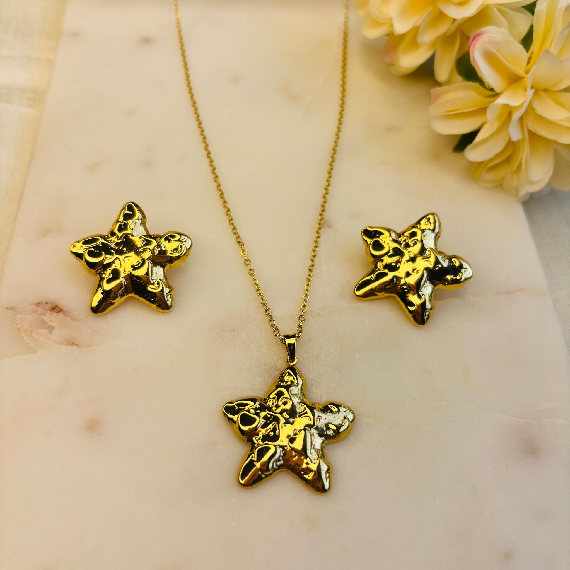 A matching necklace-and-earring set that transforms the classic star into a modern, molten masterpiece. Each piece has an organic, fluid texture that gives a sense of movement, as if the gold is still flowing.