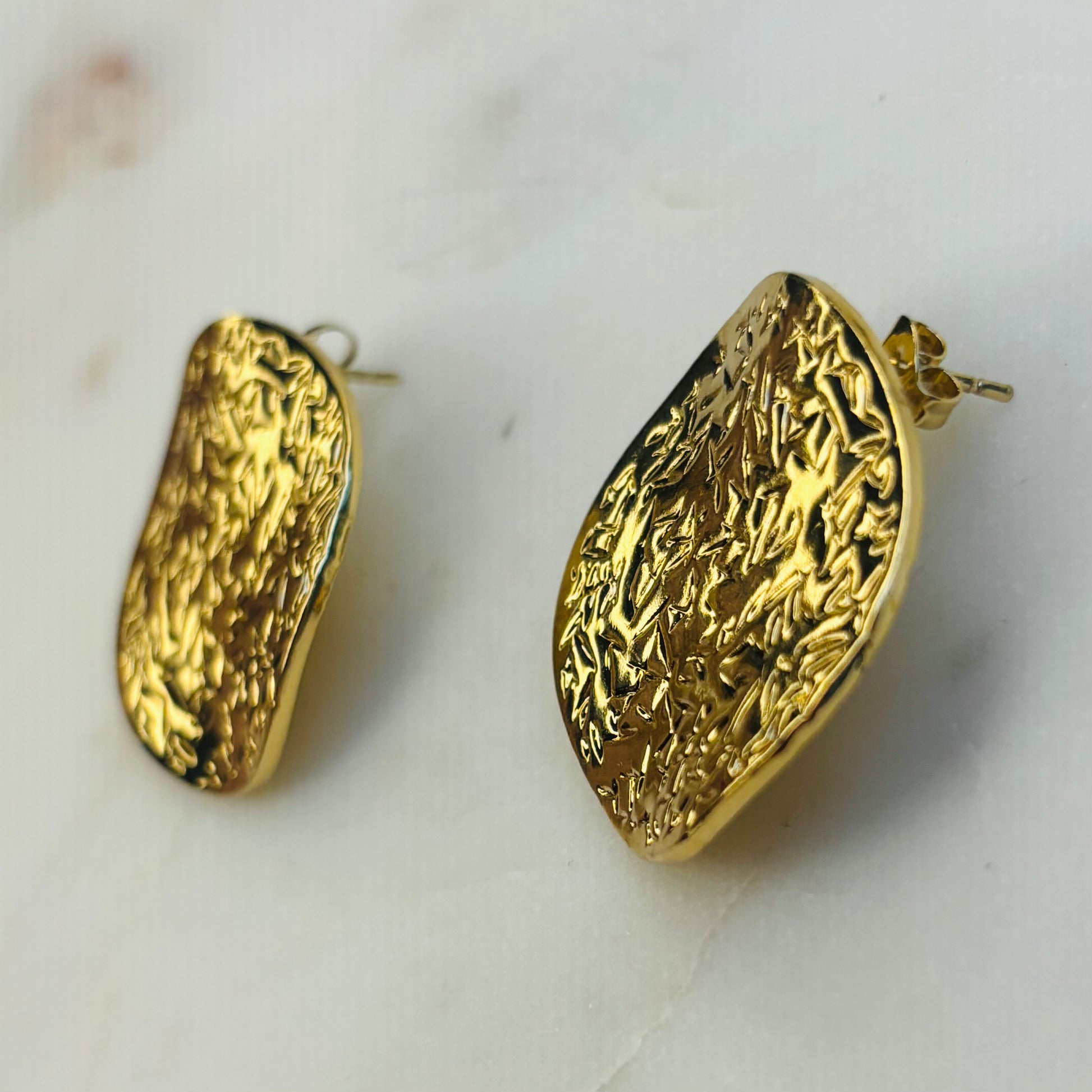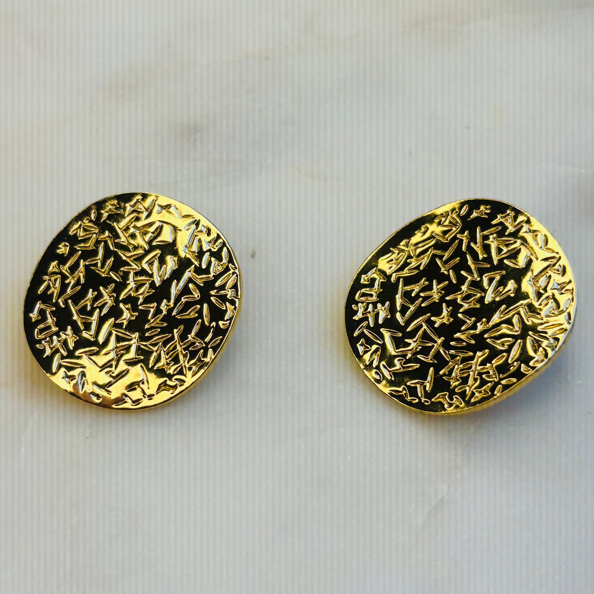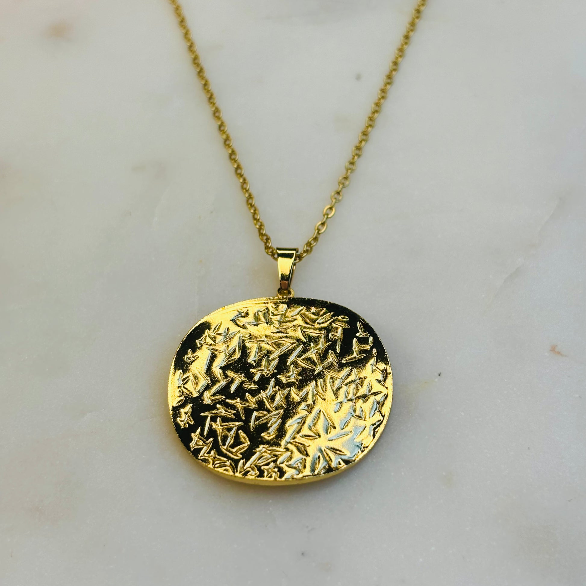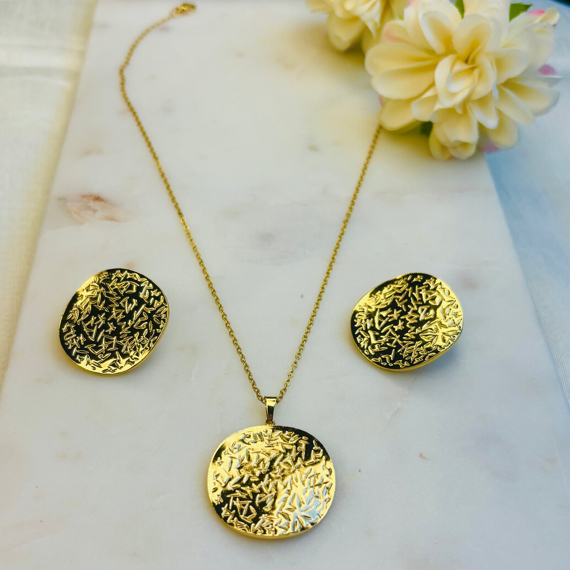 A harmonious necklace-and-earring set with round golden discs etched with a scatter of tiny stars. The contrasting smooth and textured surfaces create a soft yet captivating shimmer.