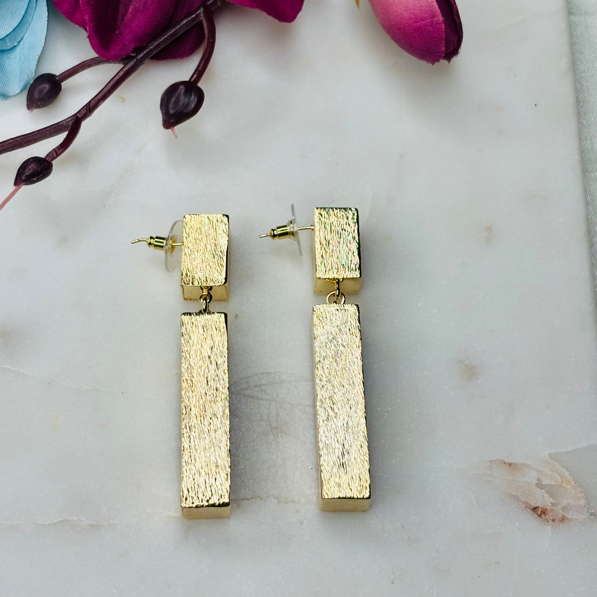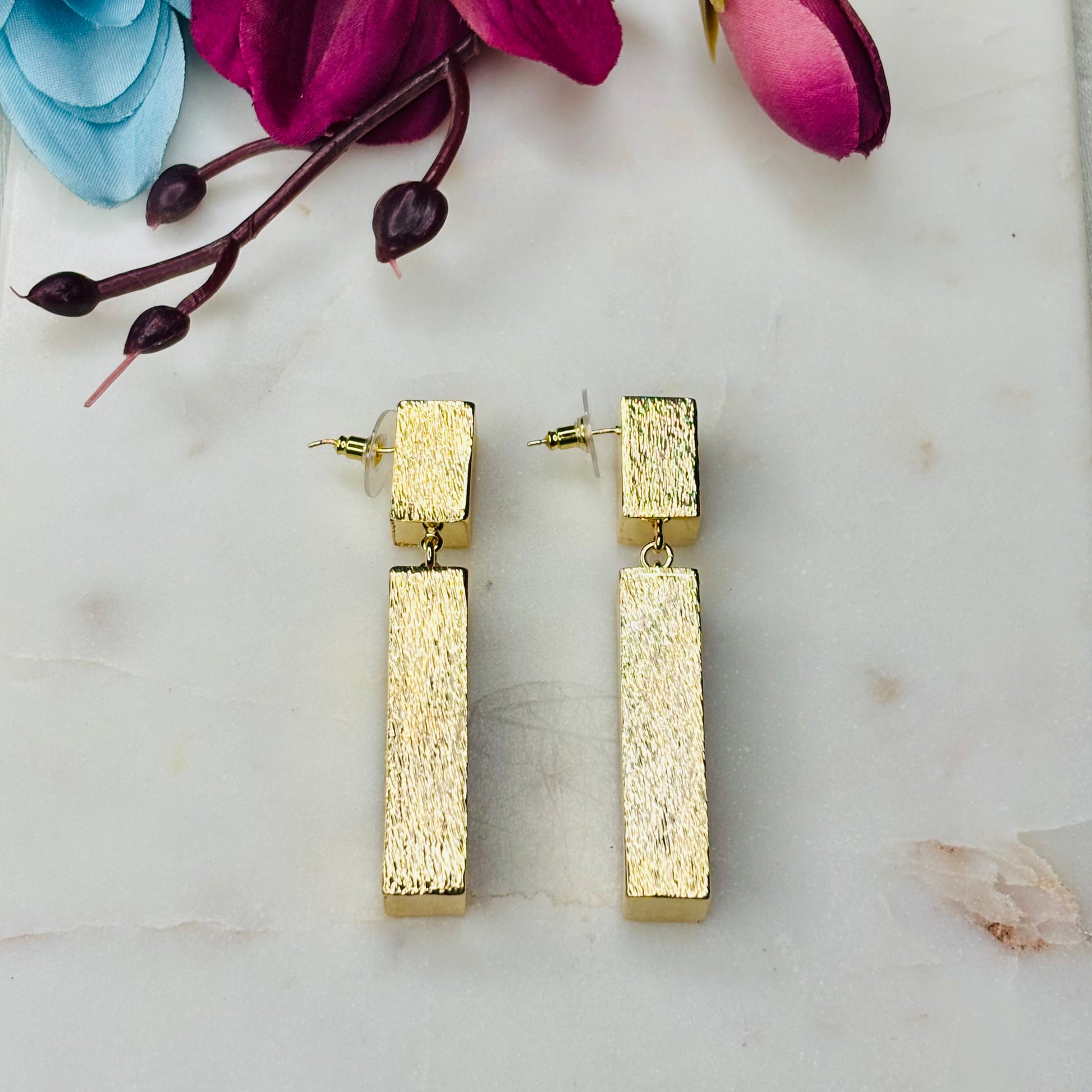 These bold geometric earrings showcase textured gold rectangular blocks stacked for a clean, architectural effect. Minimalist yet powerful, they embody modern chic.