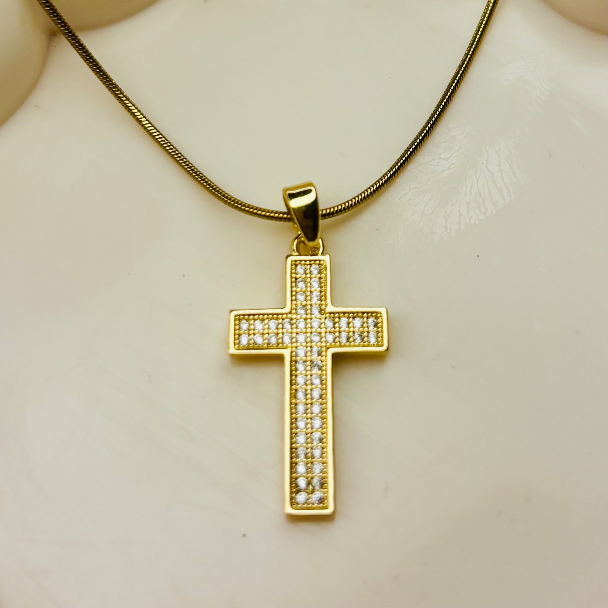 Shine bright with this golden cross pendant, sparkling with zircons that add just the right dash of glam. Perfect for adding a touch of faith and flair to any outfit, it’s a charming mix of classic and cool.