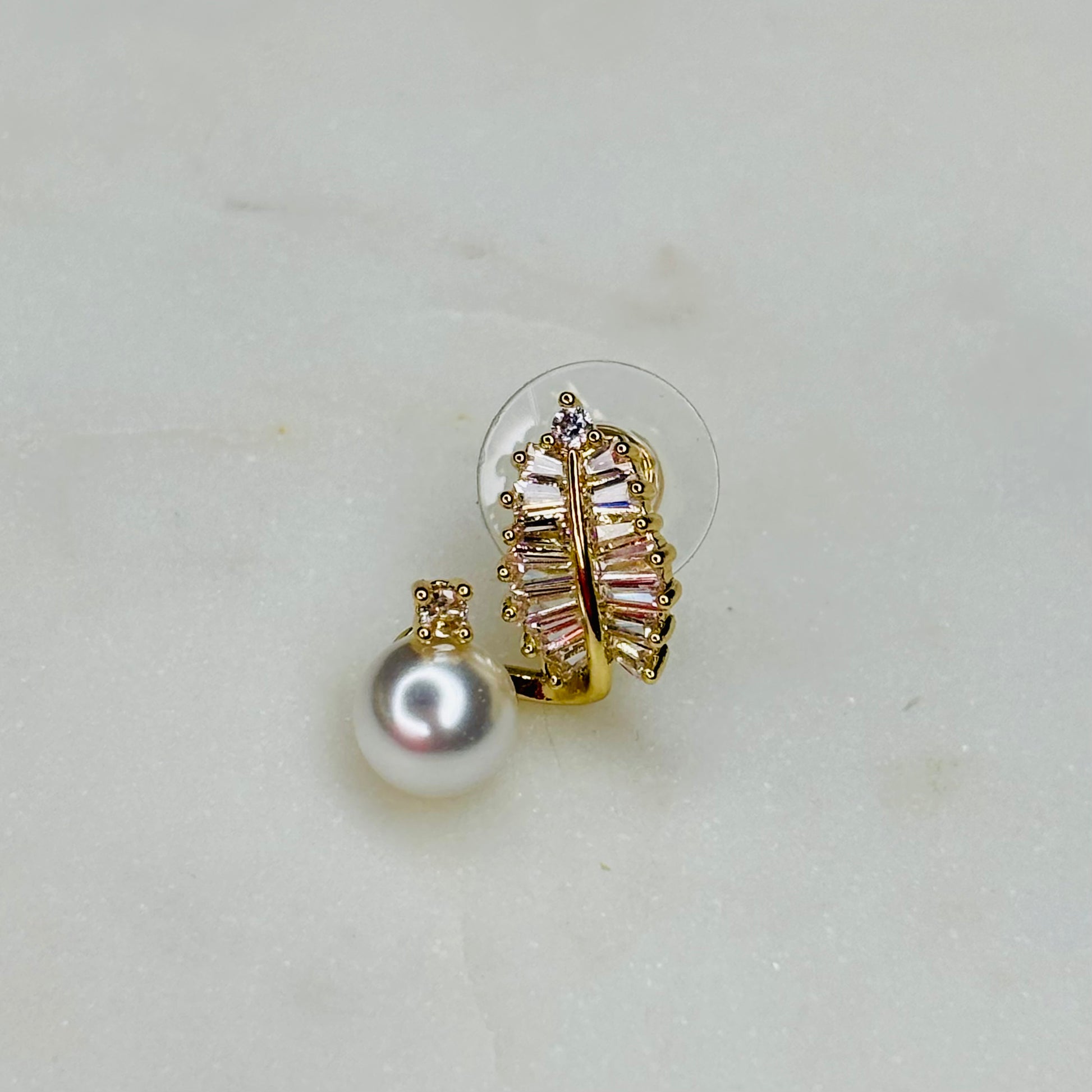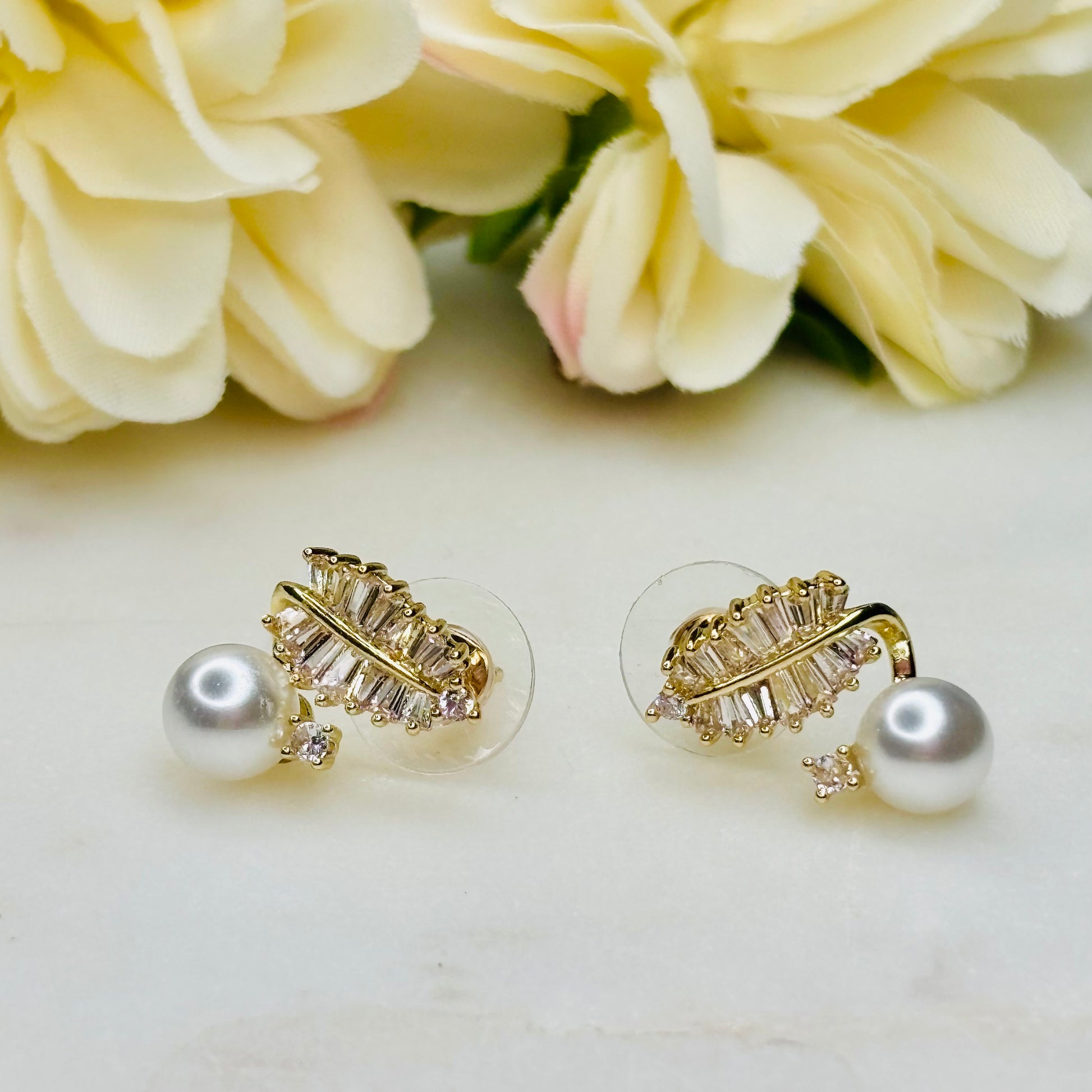 A sophisticated blend of pearls, cubic stones, and a golden leaf design. The sparkling baguette stones hug the curve beautifully, while the pearl drop adds timeless charm.