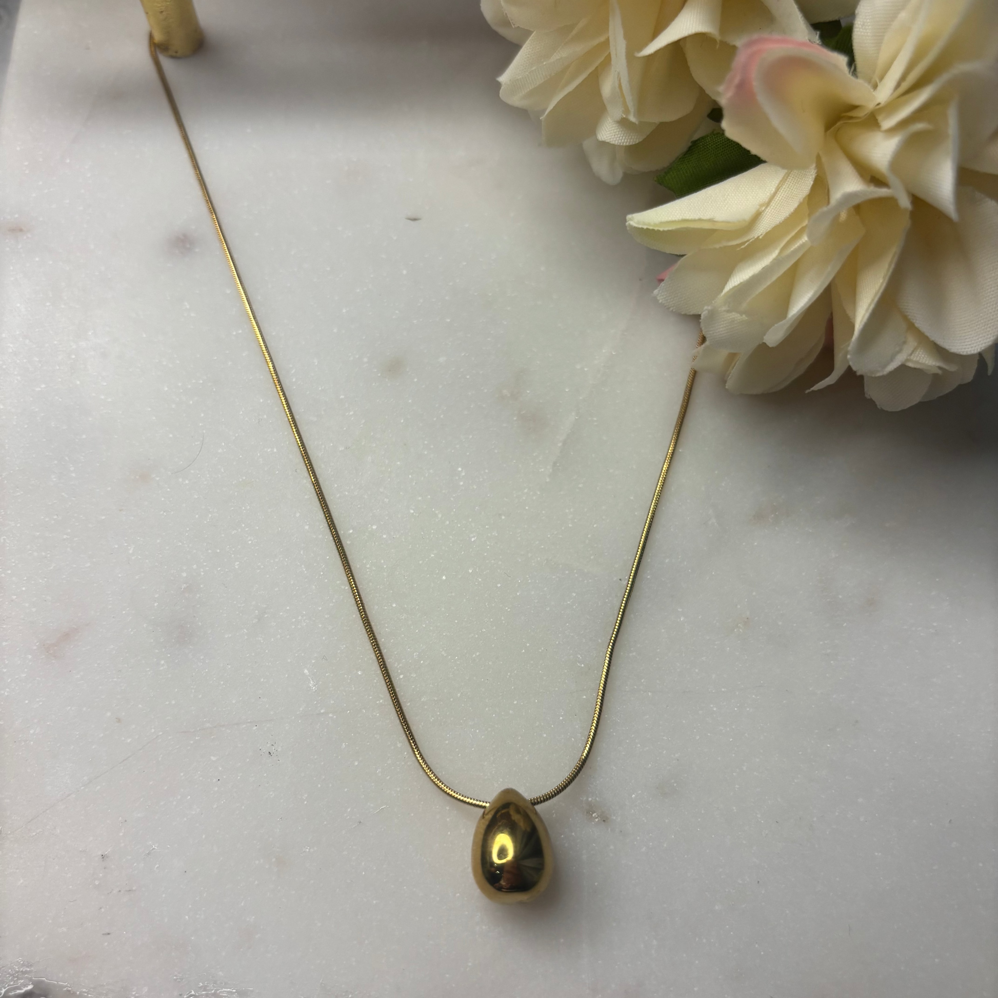 This gold tear-drop necklace, crafted from durable stainless steel, offers a refined and lasting accessory choice. Its elegant teardrop design adds a subtle yet sophisticated touch to any outfit, while the stainless steel construction ensures resistance to tarnish and everyday wear. Ideal for those seeking a blend of style and durability in their jewelry collection.