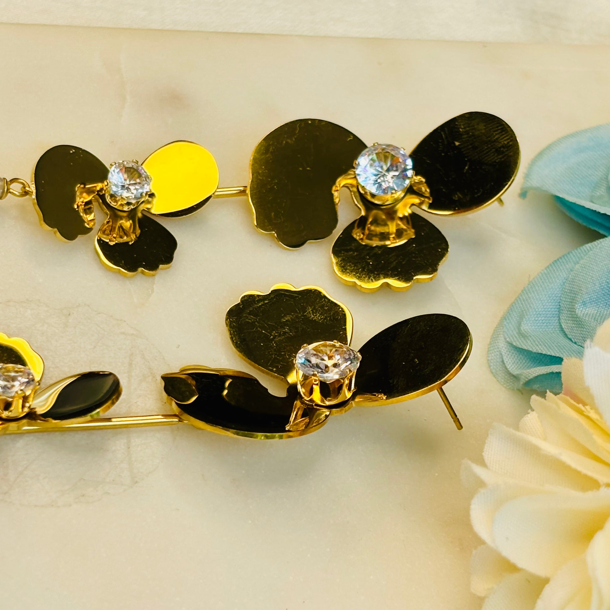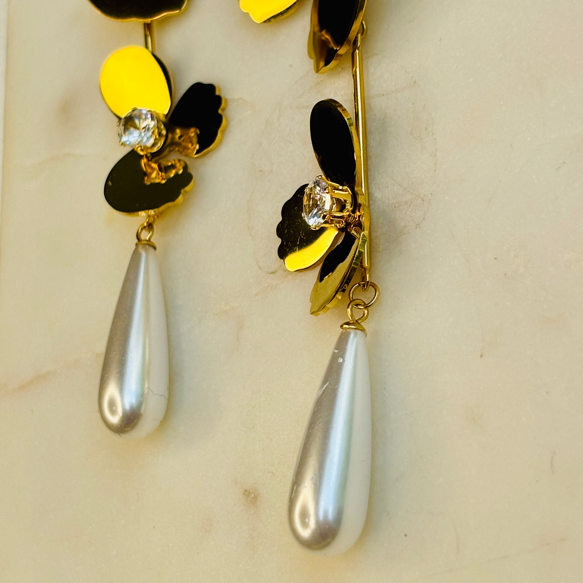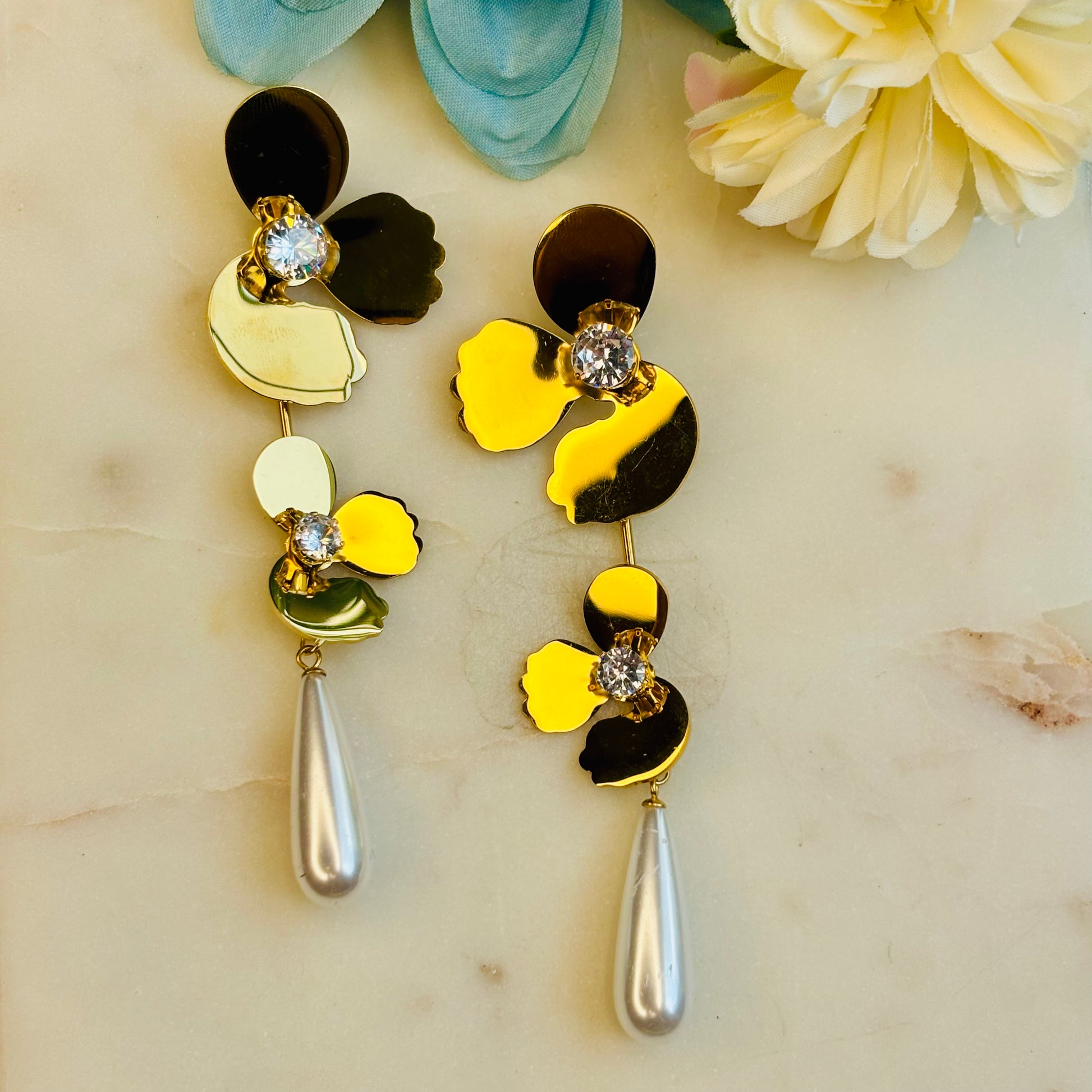 These Golden Bloom Drops bring a burst of floral charm to your look with their layered petals and sparkling crystal centers. The delicate teardrop pearl dangles add a touch of whimsy, perfect for festive occasions.