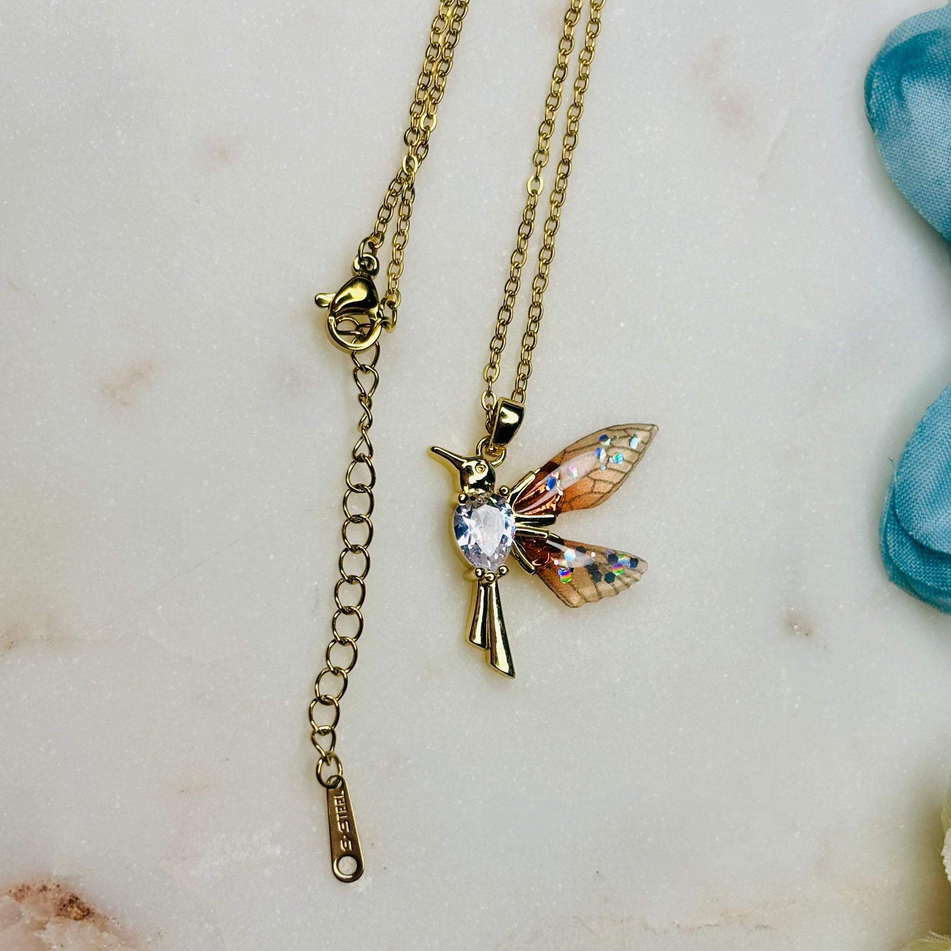 Delicately crafted with translucent amber-orange wings dusted in fine glitter, this hummingbird pendant radiates warmth and grace. The body features a brilliant crystal stone that captures the light beautifully, while the gold detailing adds a touch of luxury. It’s a piece that feels lively, elegant, and full of movement — just like the bird it’s inspired by.