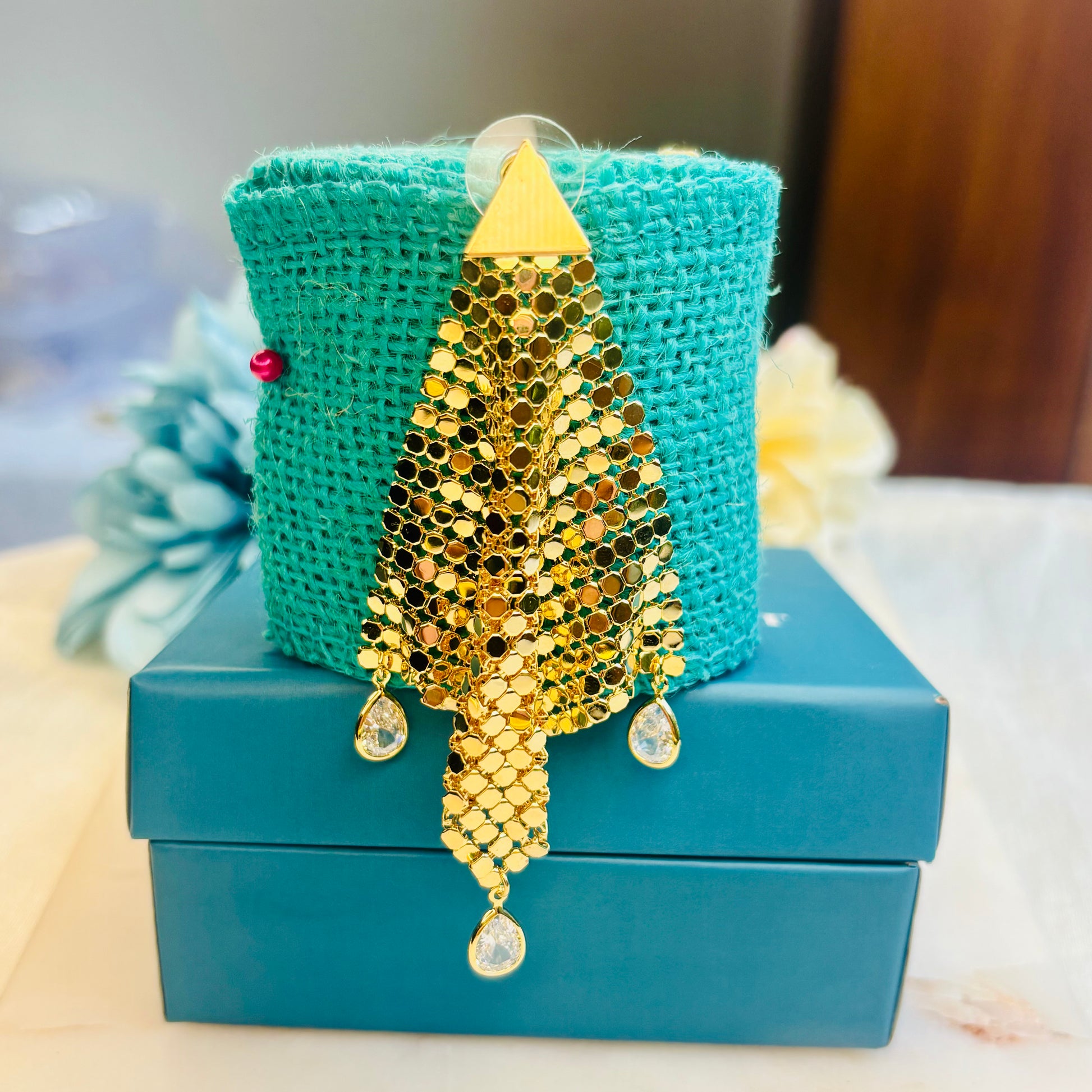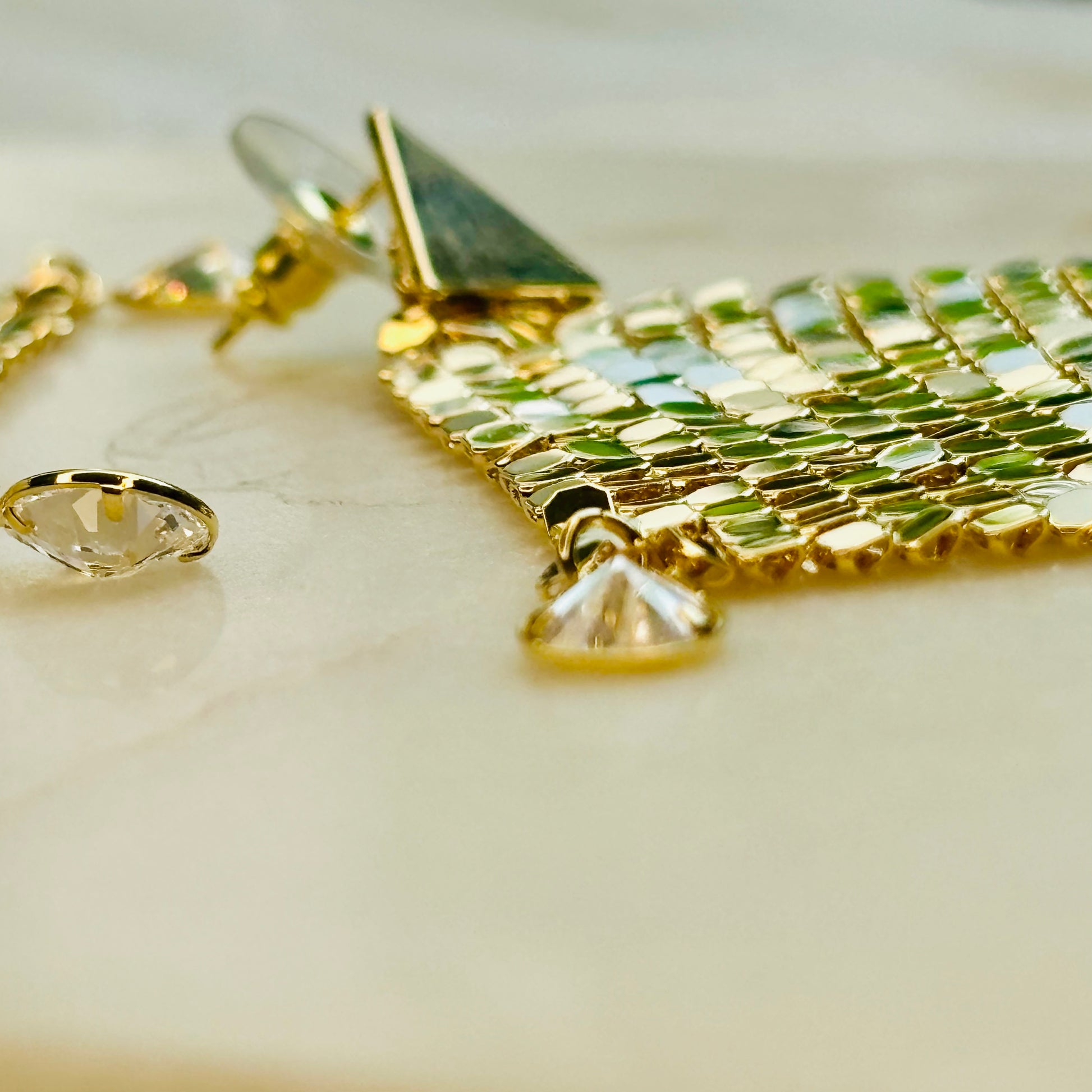 Add a touch of sparkle with these Golden Mesh Drapes earrings. Featuring a unique mesh texture and delicate teardrop crystal accents, they bring bold elegance to any look.