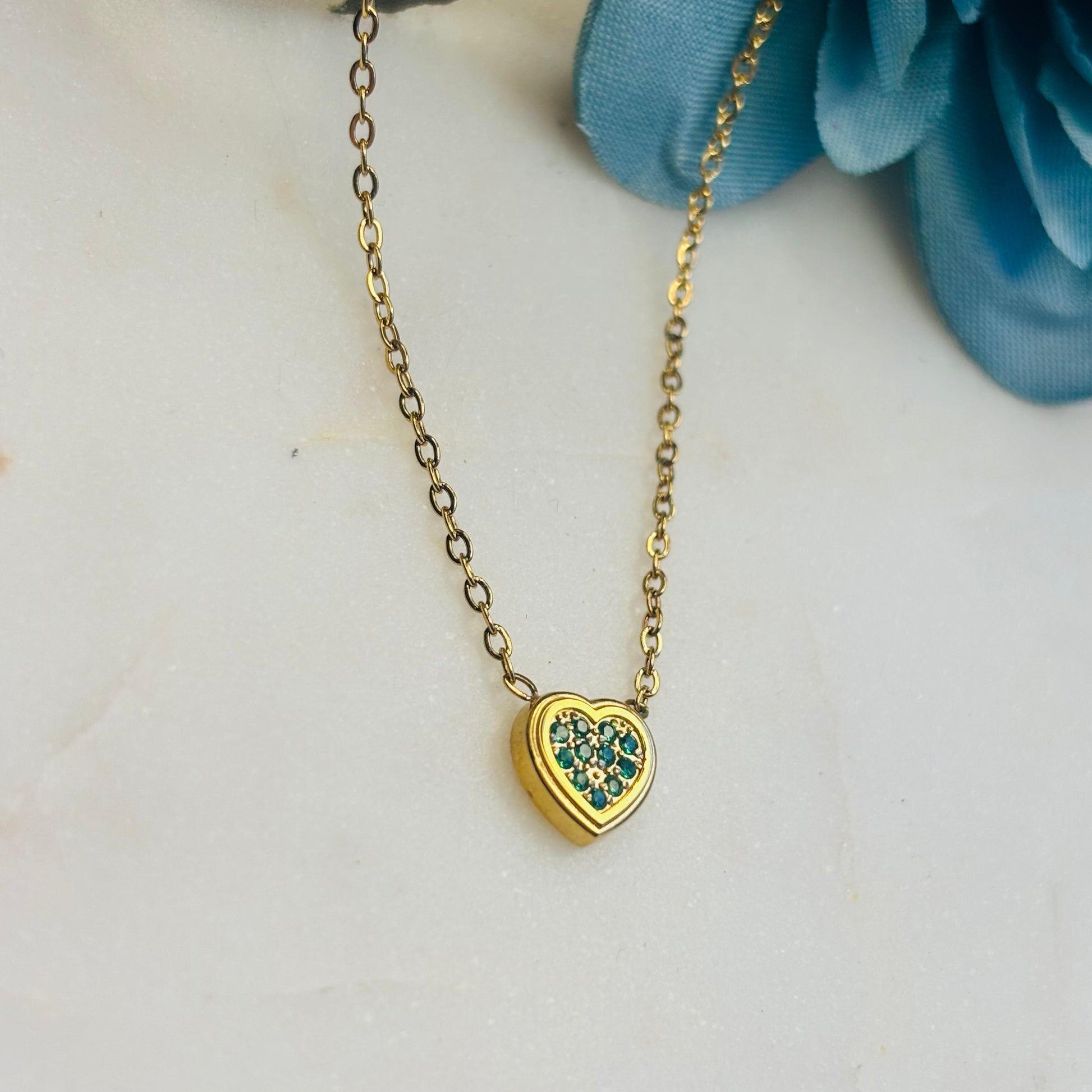 Wear your heart on your sleeve—or better yet, around your neck! This enchanting necklace features a delicate golden heart cradling a mesmerizing green crystal that catches the light beautifully.