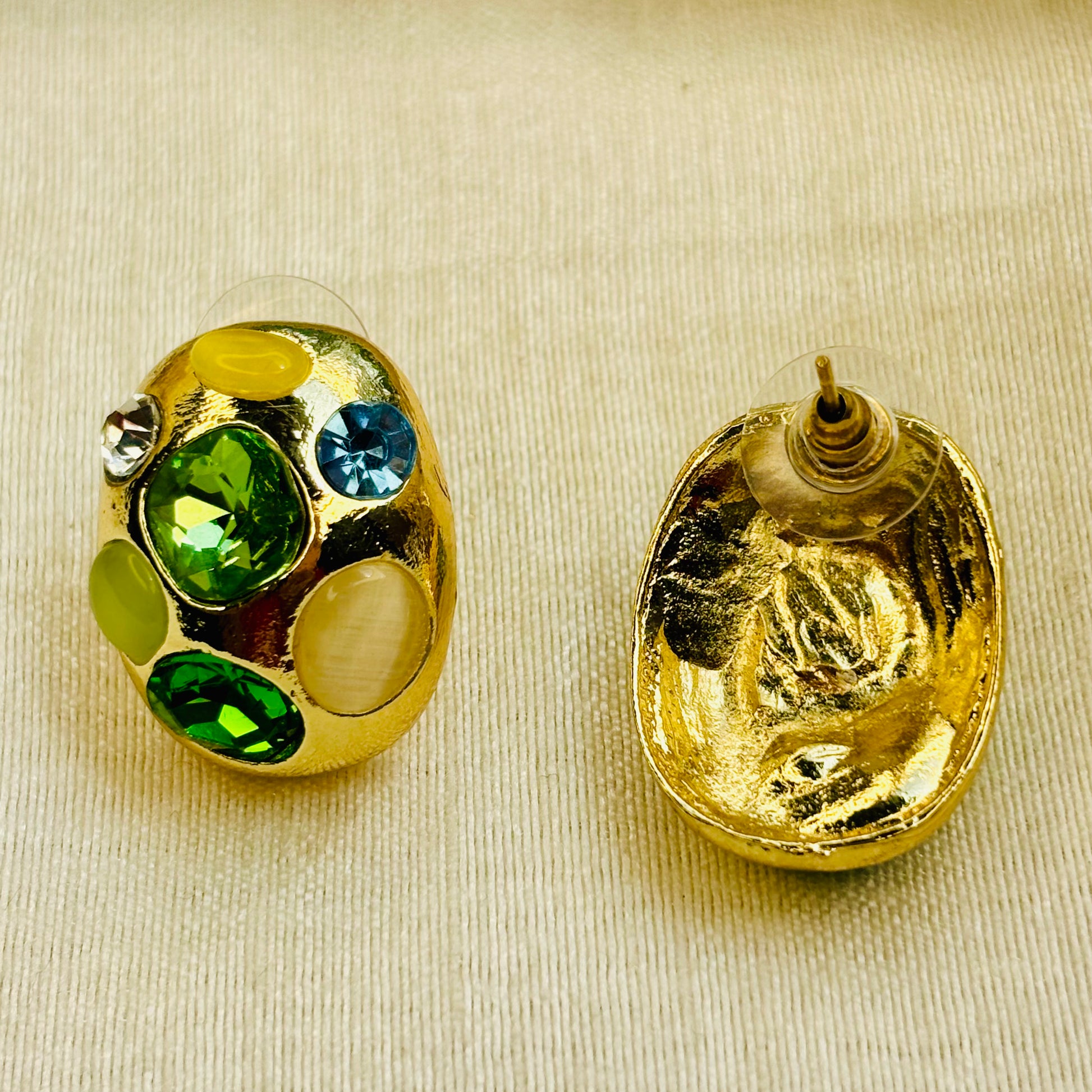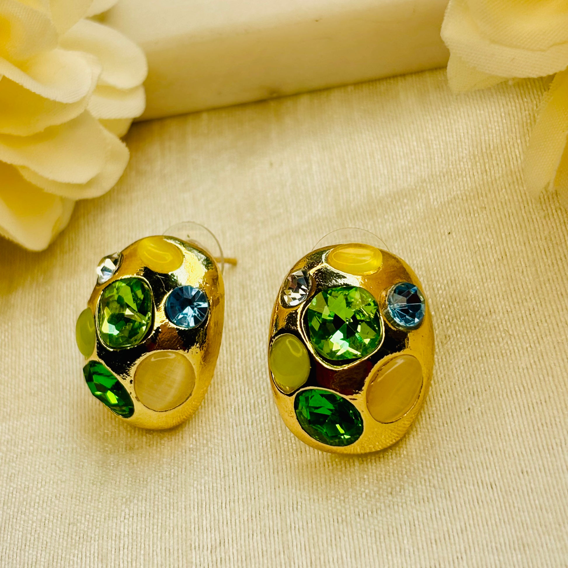 Rounded gold dome studs decorated with vibrant green, blue, and yellow gemstones in mixed cuts.