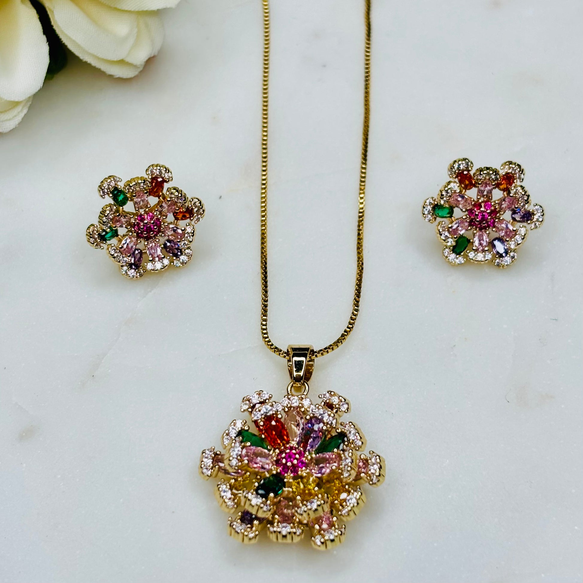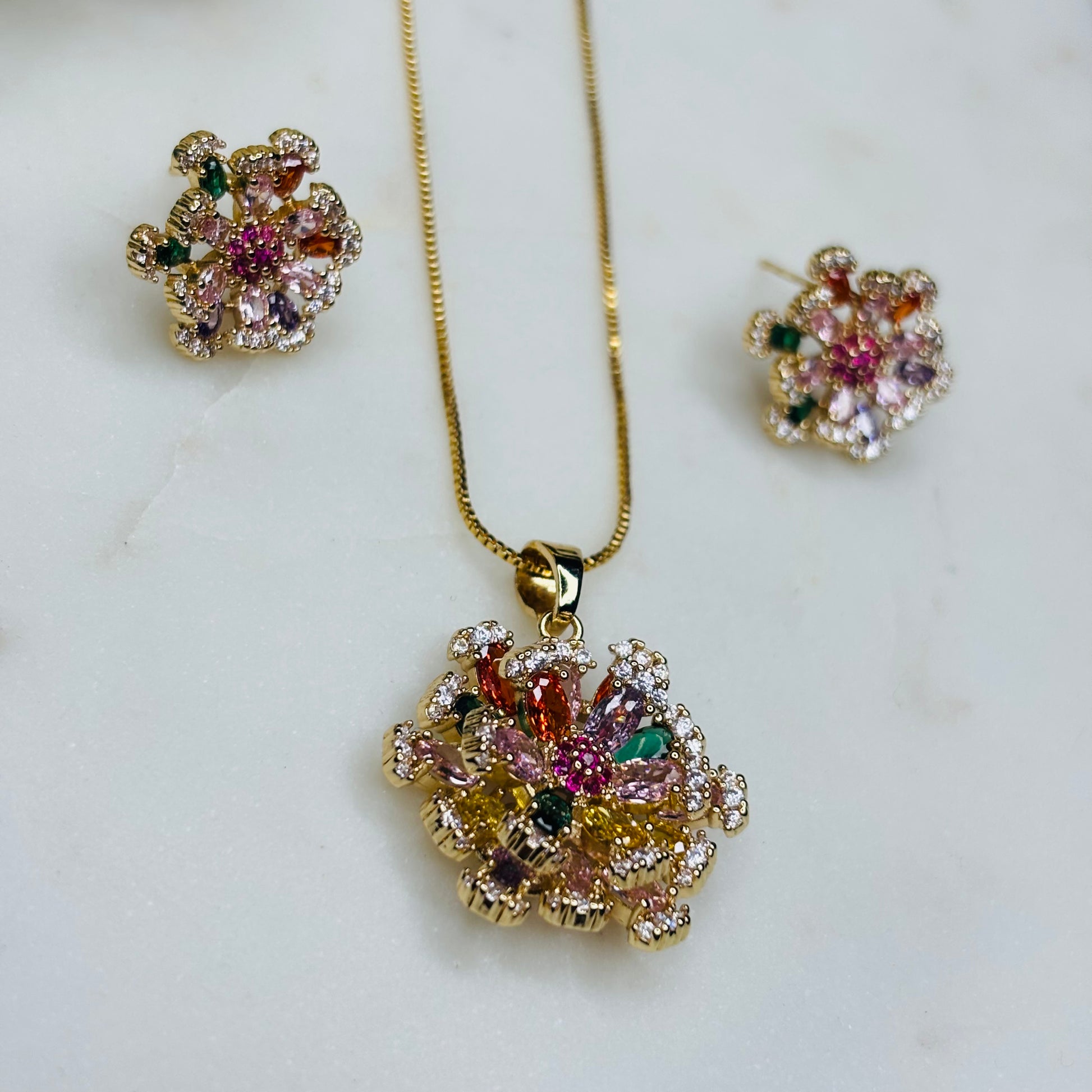 Meet Iris Bloom — a statement floral set that bursts with colour and sparkle. Designed with petal-like stones in hues of pink, green, orange, and lilac, this gold-plated beauty celebrates vibrance and femininity. Perfect for when you want to bring a touch of joy to your outfit.