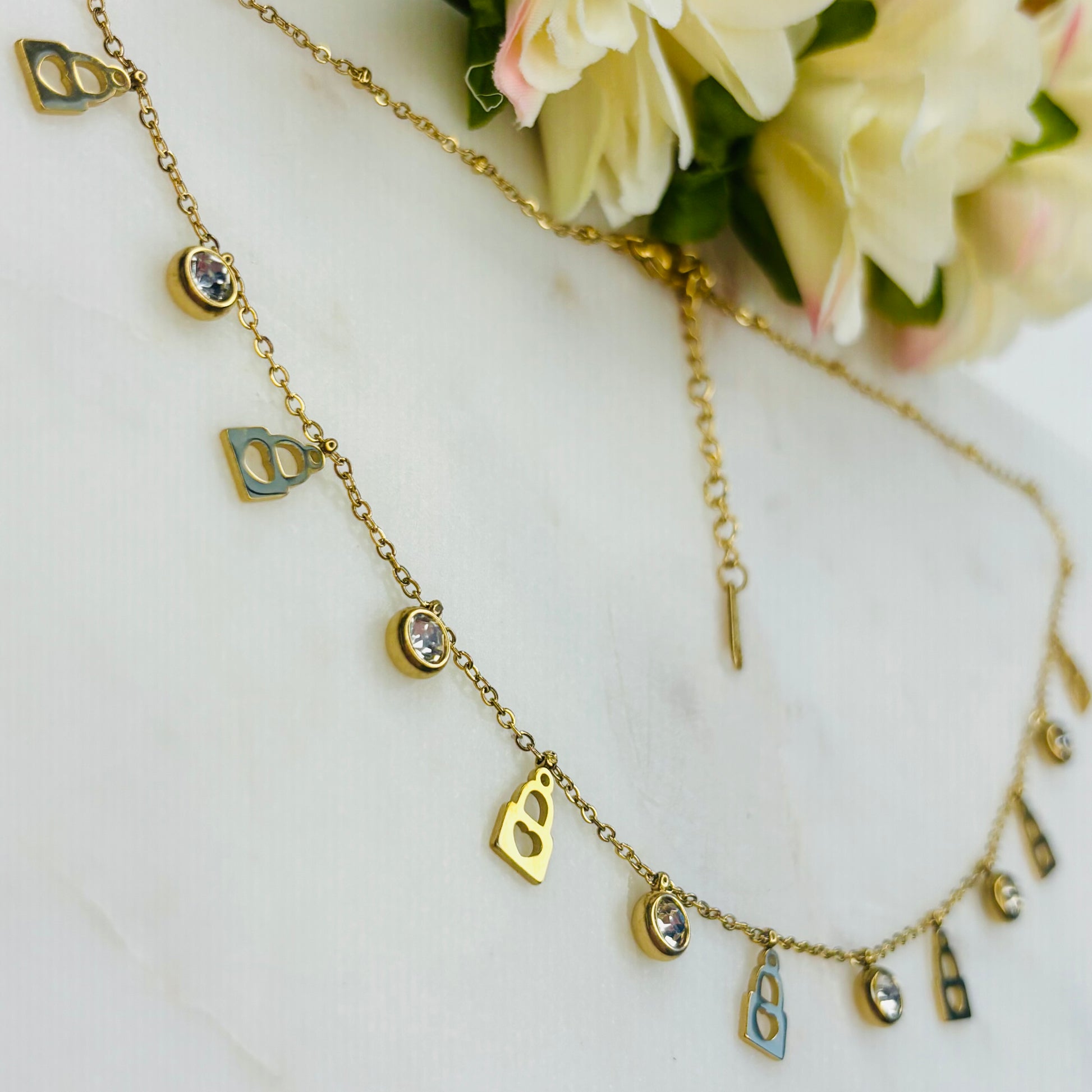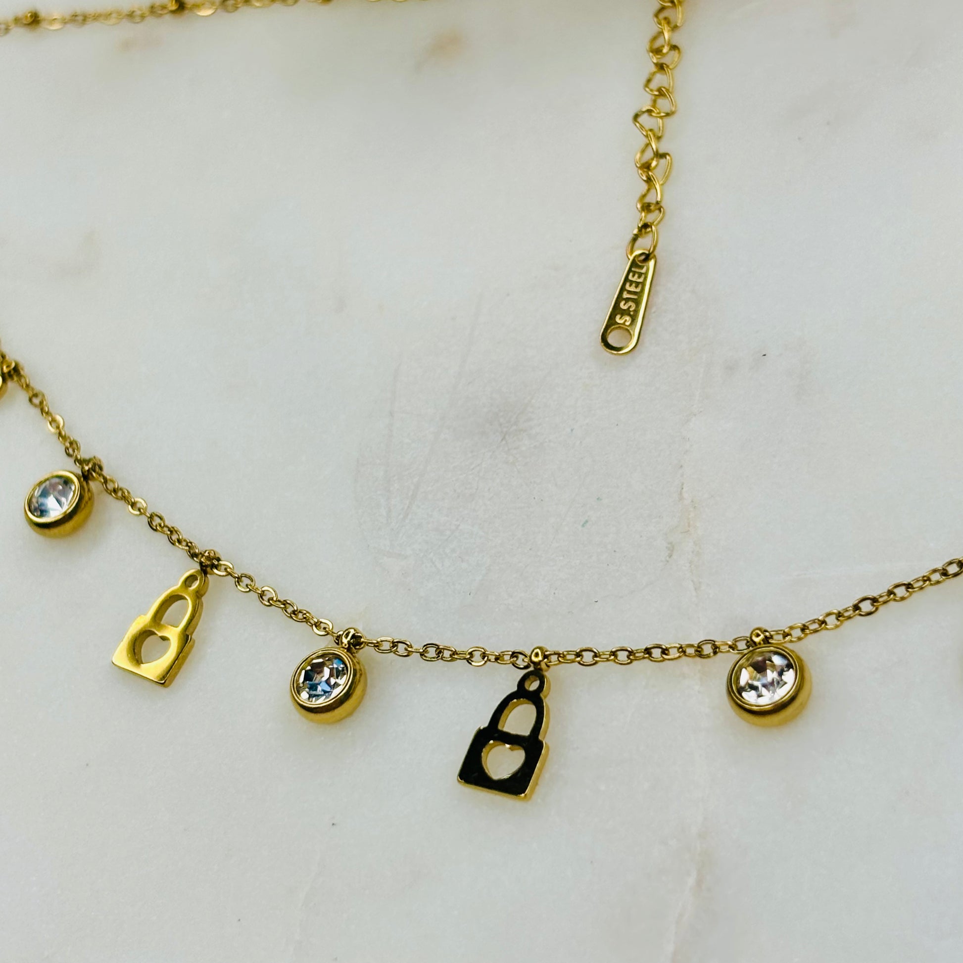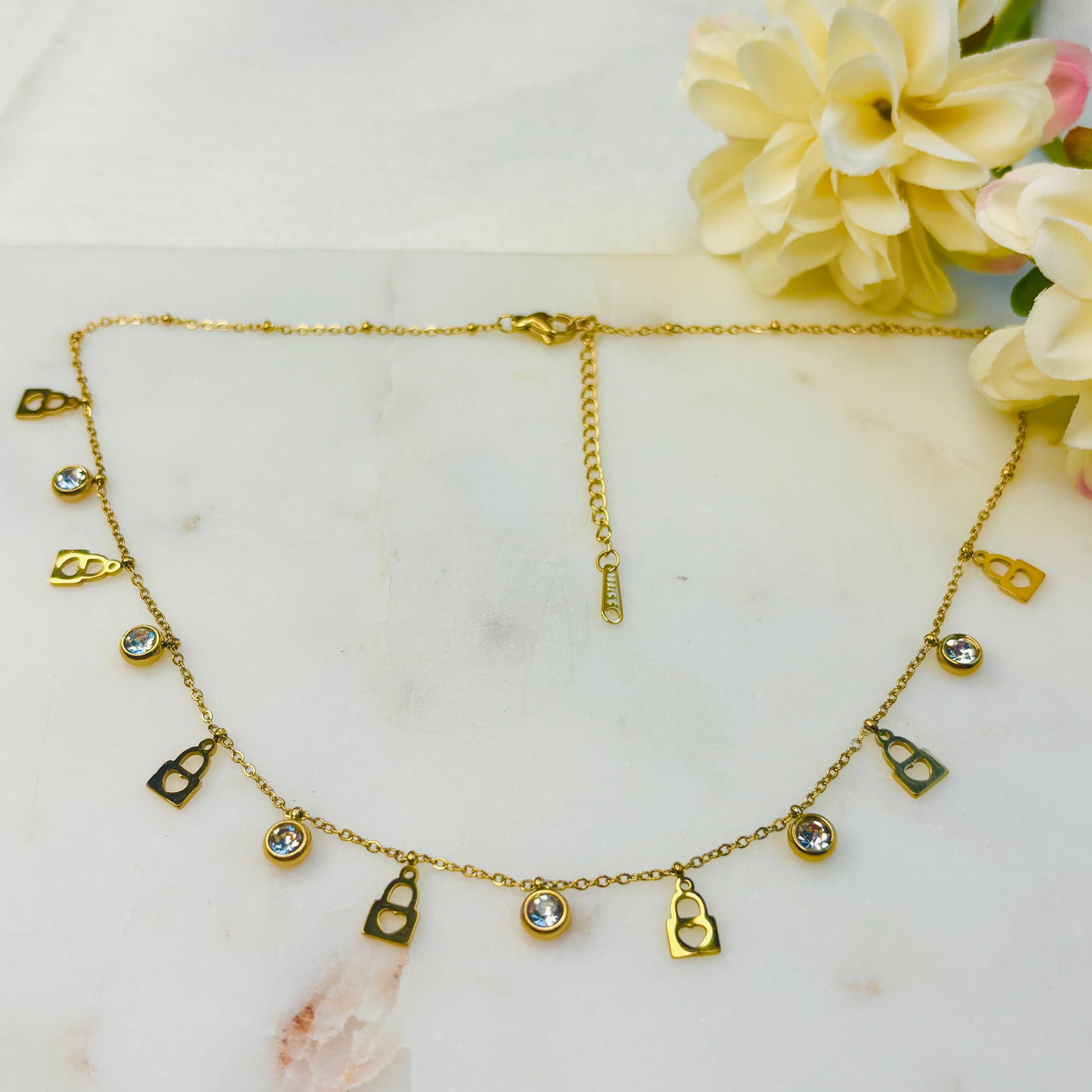 This golden charm necklace features delicate heart-lock shaped charms paired with sparkling zircon stones, adding a touch of sparkle and whimsy to any outfit. Perfect for layering or wearing solo, it effortlessly brightens your look.