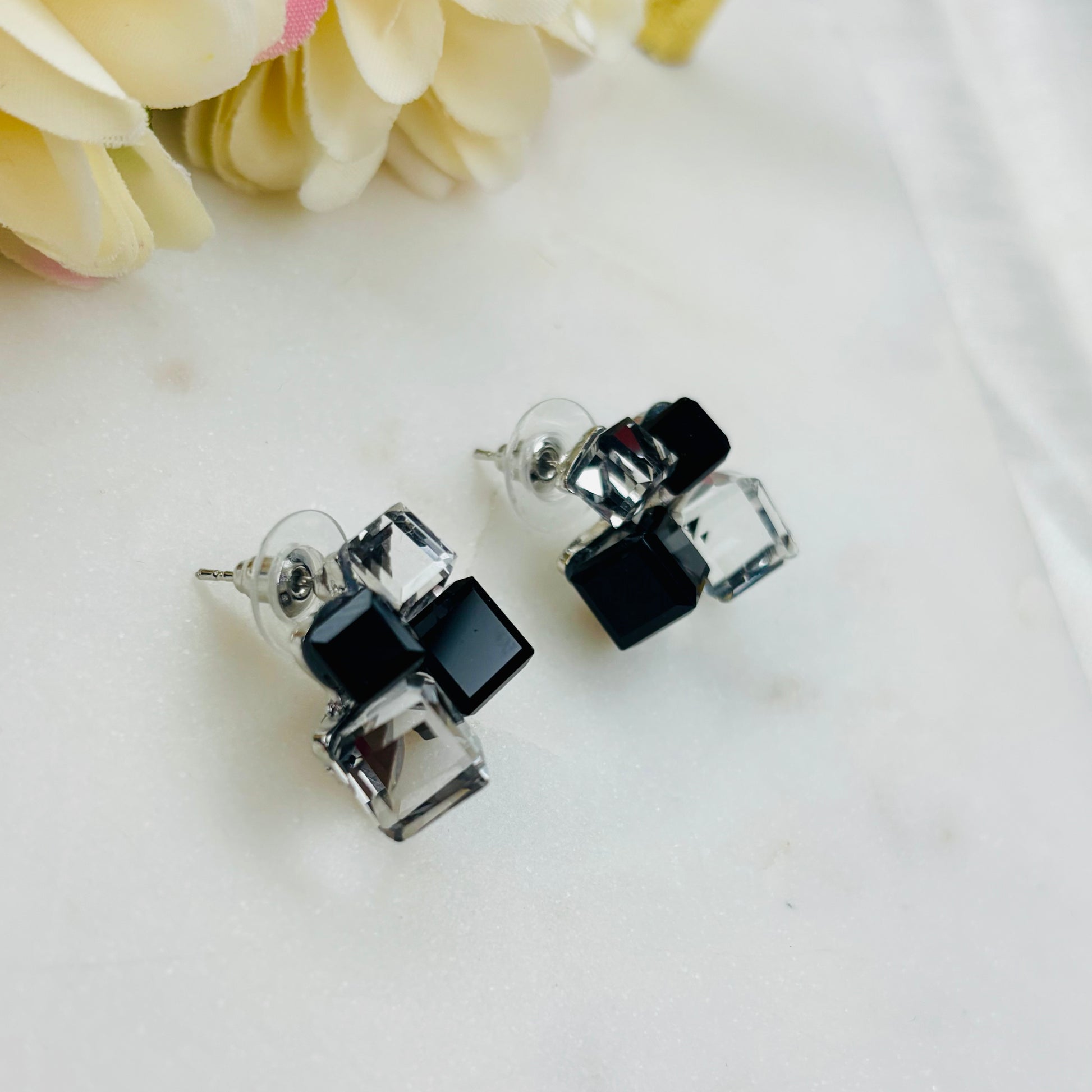 Geometric earrings featuring glossy black and clear cubic crystals for a modern, edgy look.