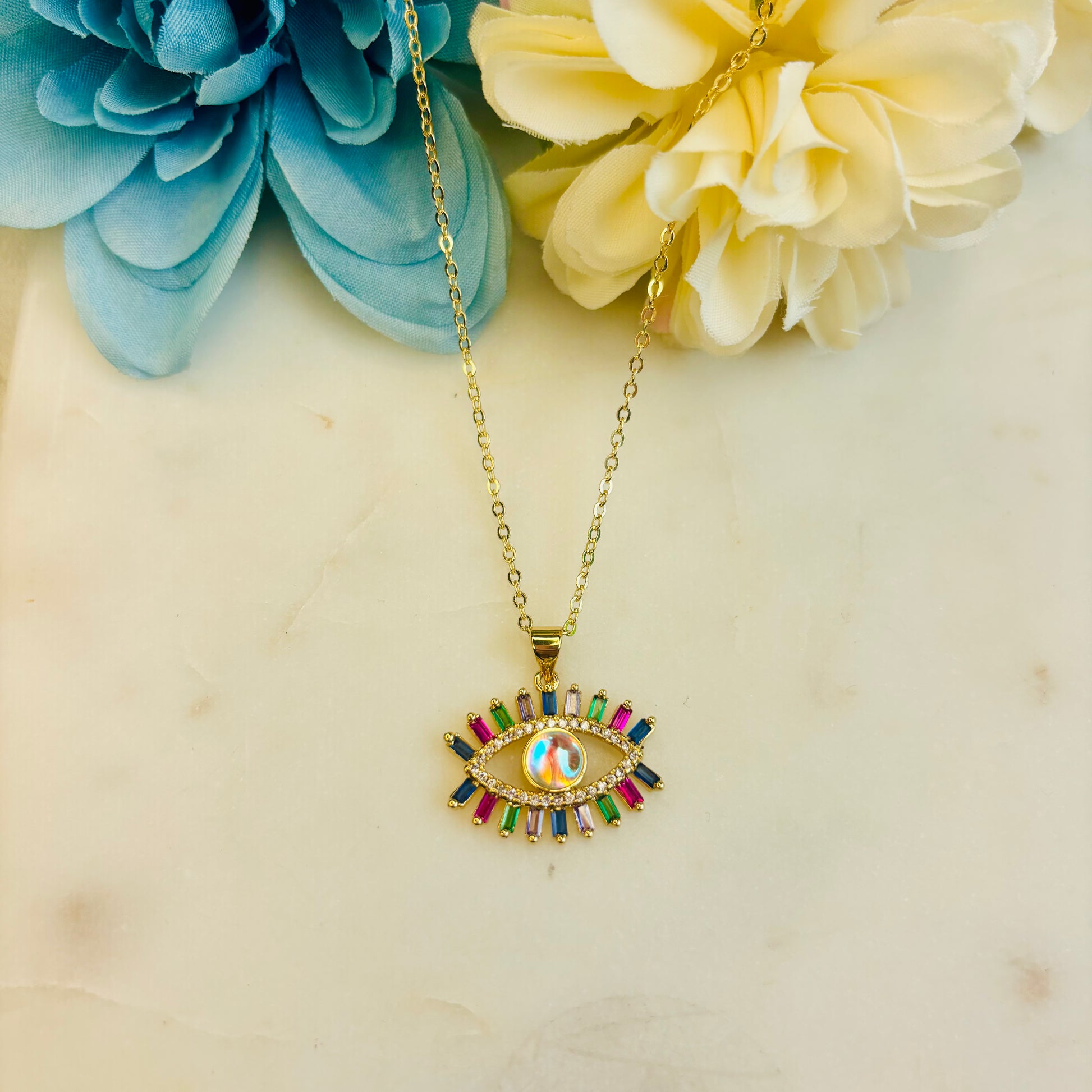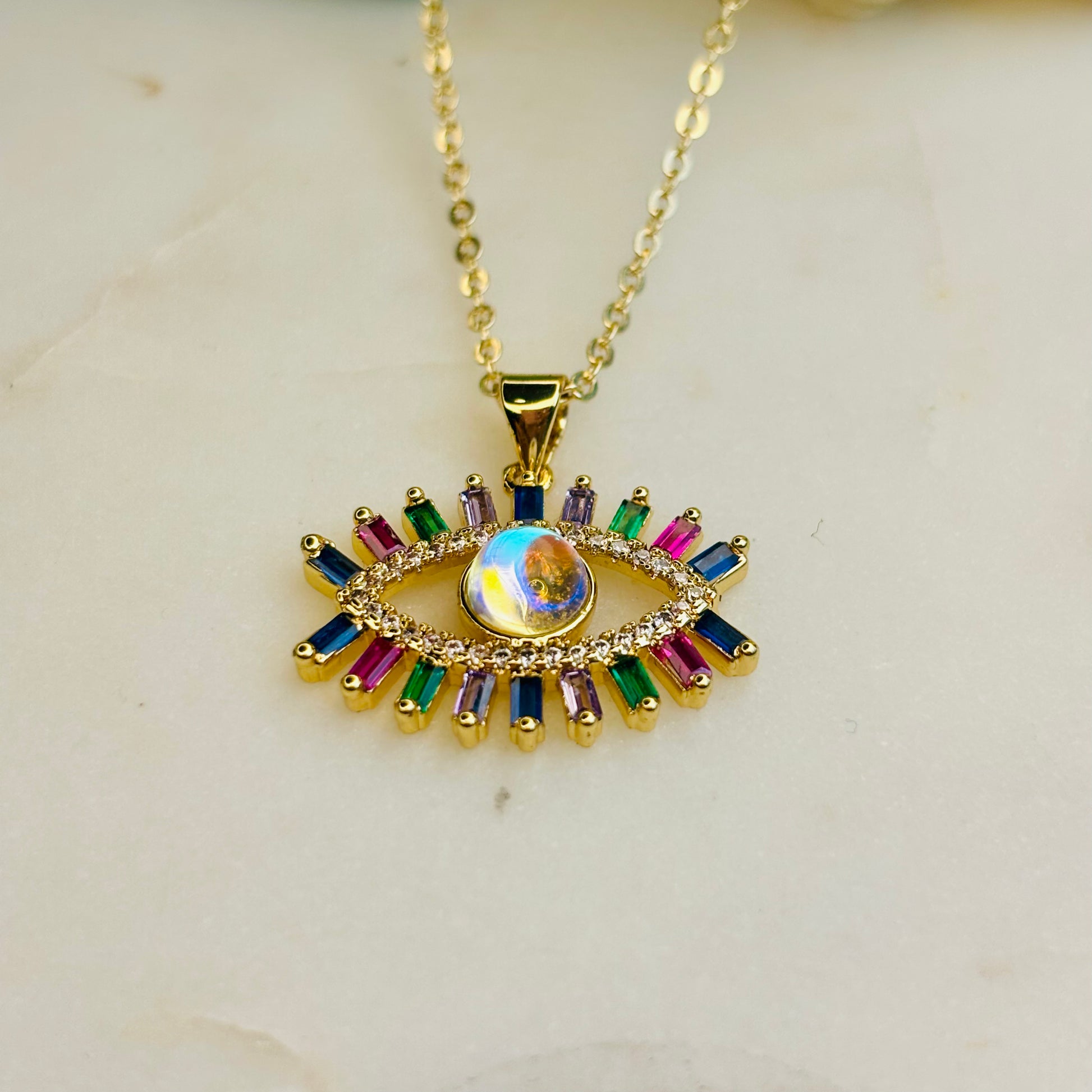 A rainbow-crystal evil eye pendant with gold detailing — symbolic and vibrant.