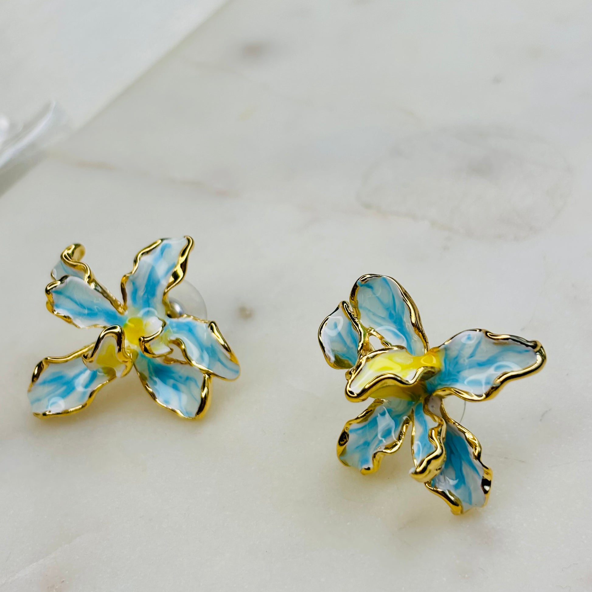 Blue marbled enamel flower earrings with golden petal edges and a yellow center.
