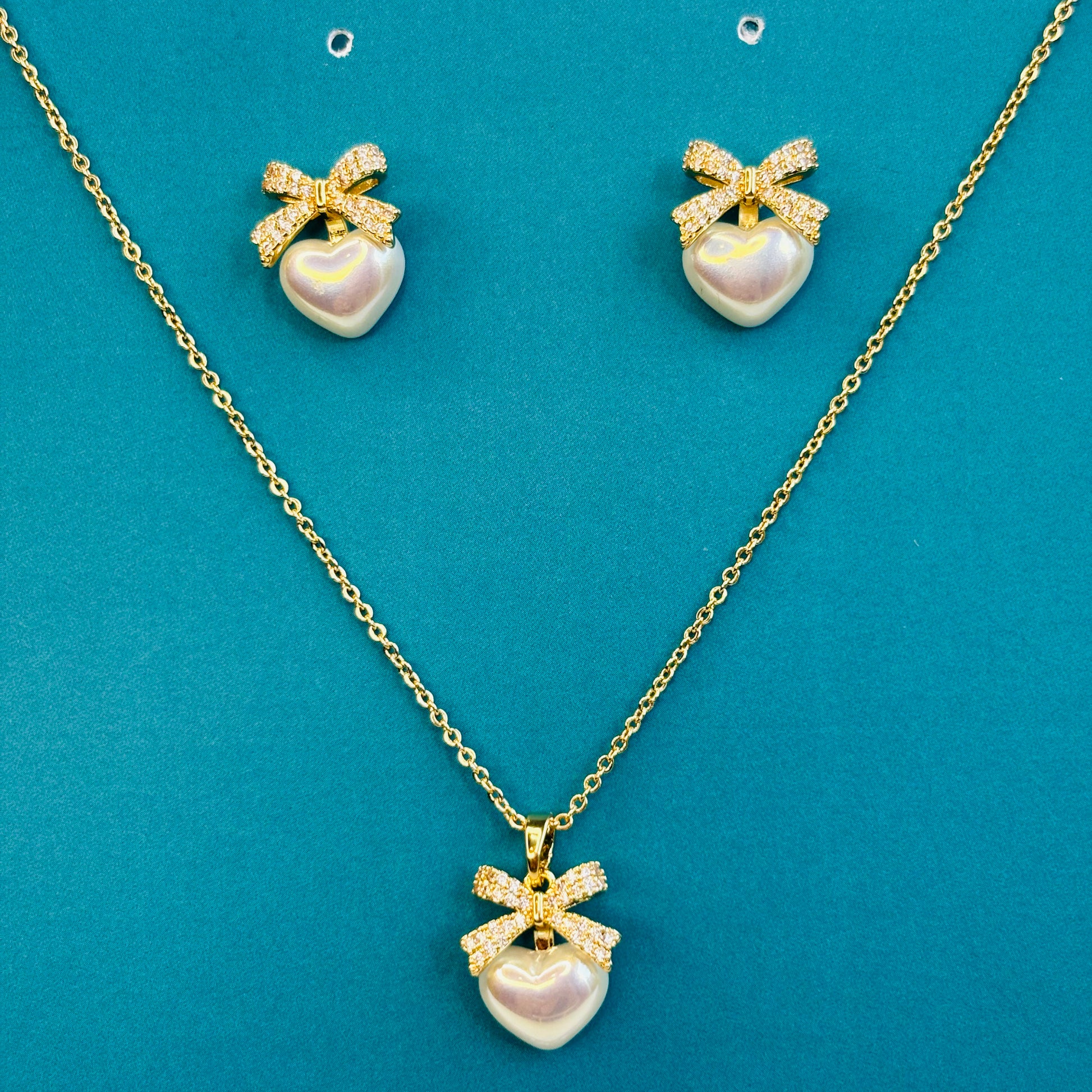 Add a touch of whimsy to your look with this dainty gold chain necklace adorned with pearl-like heart charms and sparkling bow accents. The matching earrings mirror this playful charm, making the perfect pair for romantic evenings.