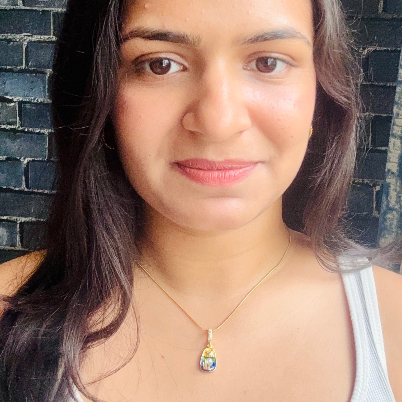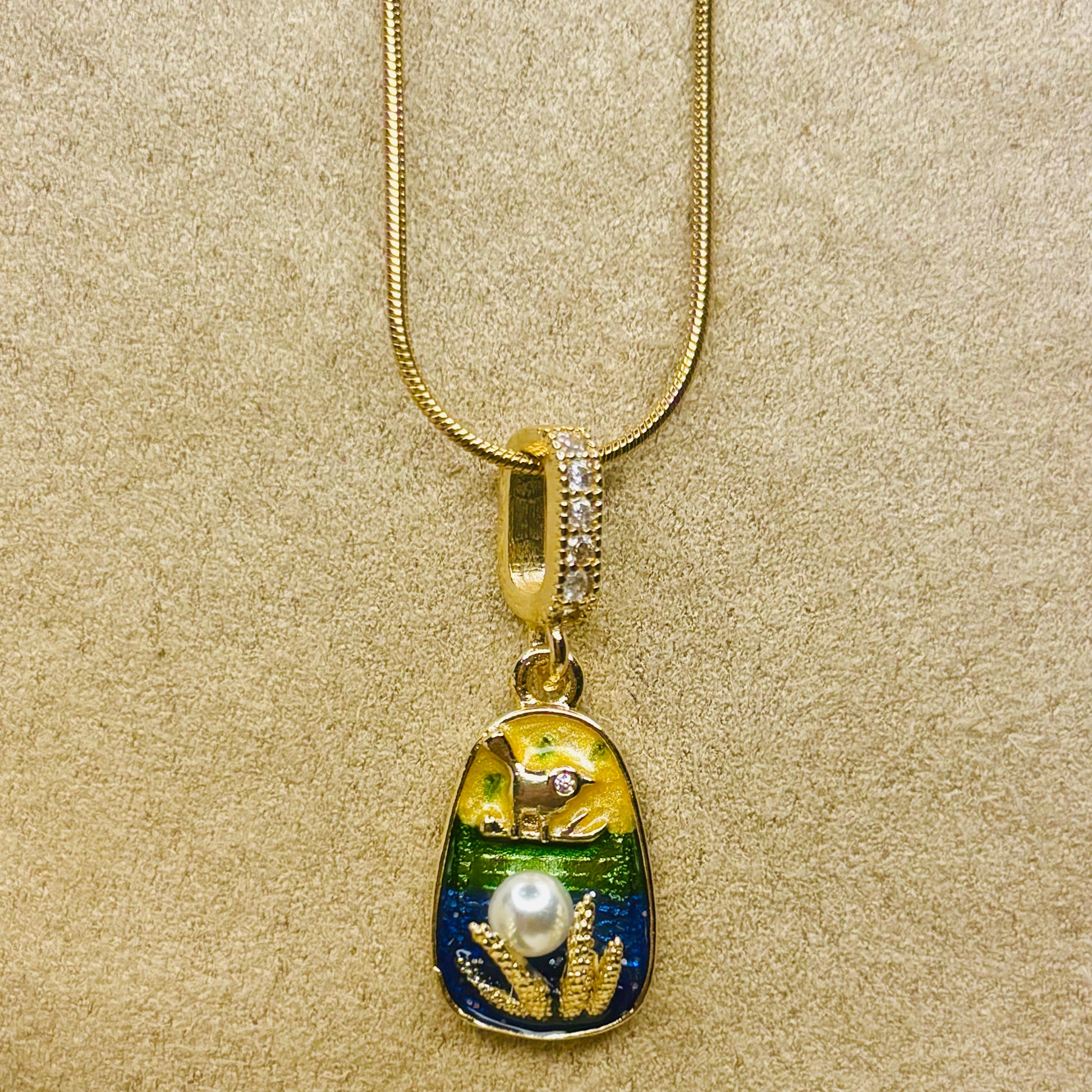 A delicate gold-toned snake chain carries a striking pendant that feels like a miniature painting of the sea. The pendant’s top is adorned with a diamond-studded bale for a touch of sparkle, leading to a rectangular drop with softly rounded edges. The scene inside is a layered gradient — shimmering gold sky, lush green middle, and deep ocean blue base — evoking a tranquil coastal landscape. A tiny golden bird glides in the sky, while a lustrous faux pearl nestles above intricate gold coral at the ocean’s edge. The combination of enamel, pearl, and crystal accents makes this piece a wearable piece of art — perfect for someone who treasures unique, storytelling jewelry.