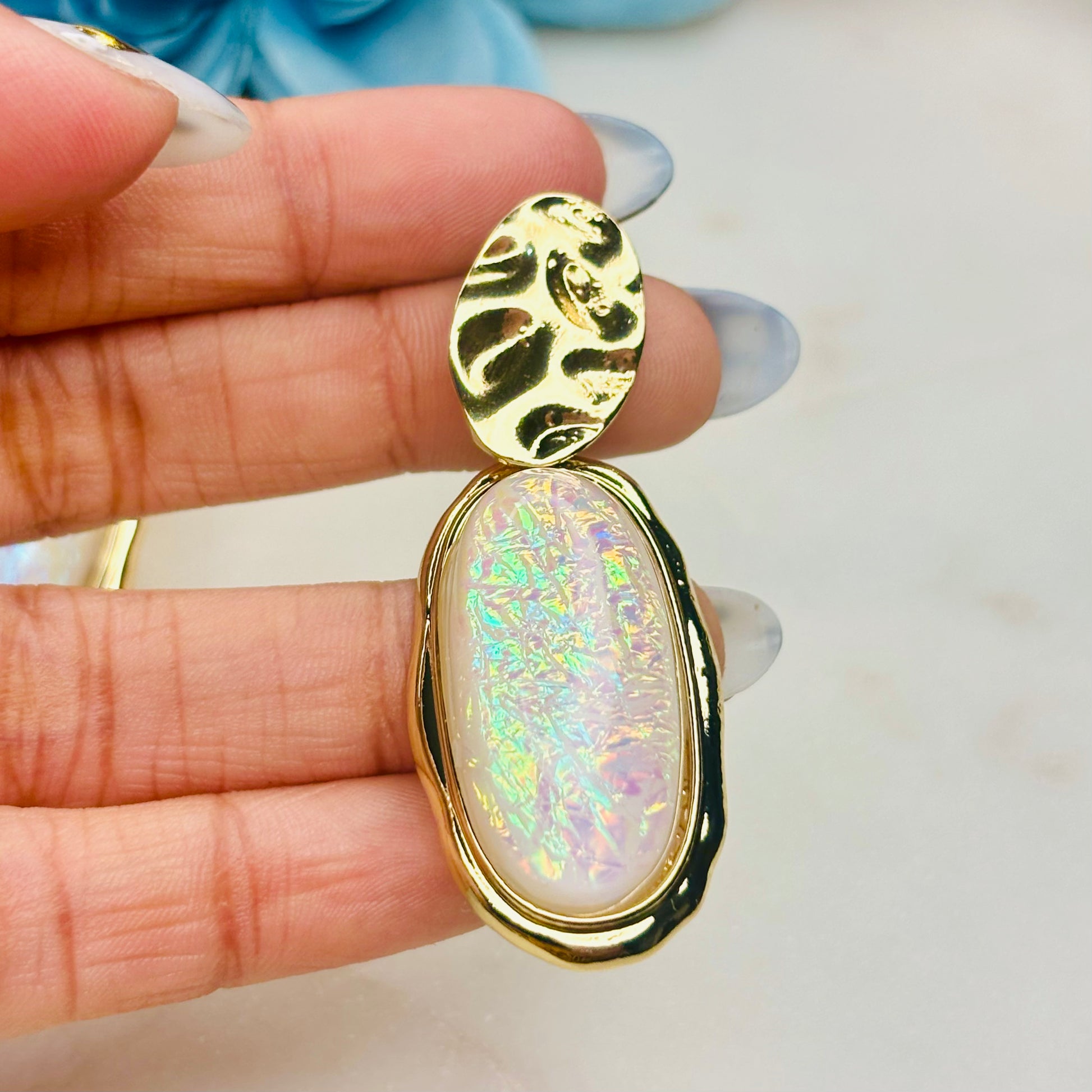 Oval pearl-white iridescent stones set in textured gold-tone frames.