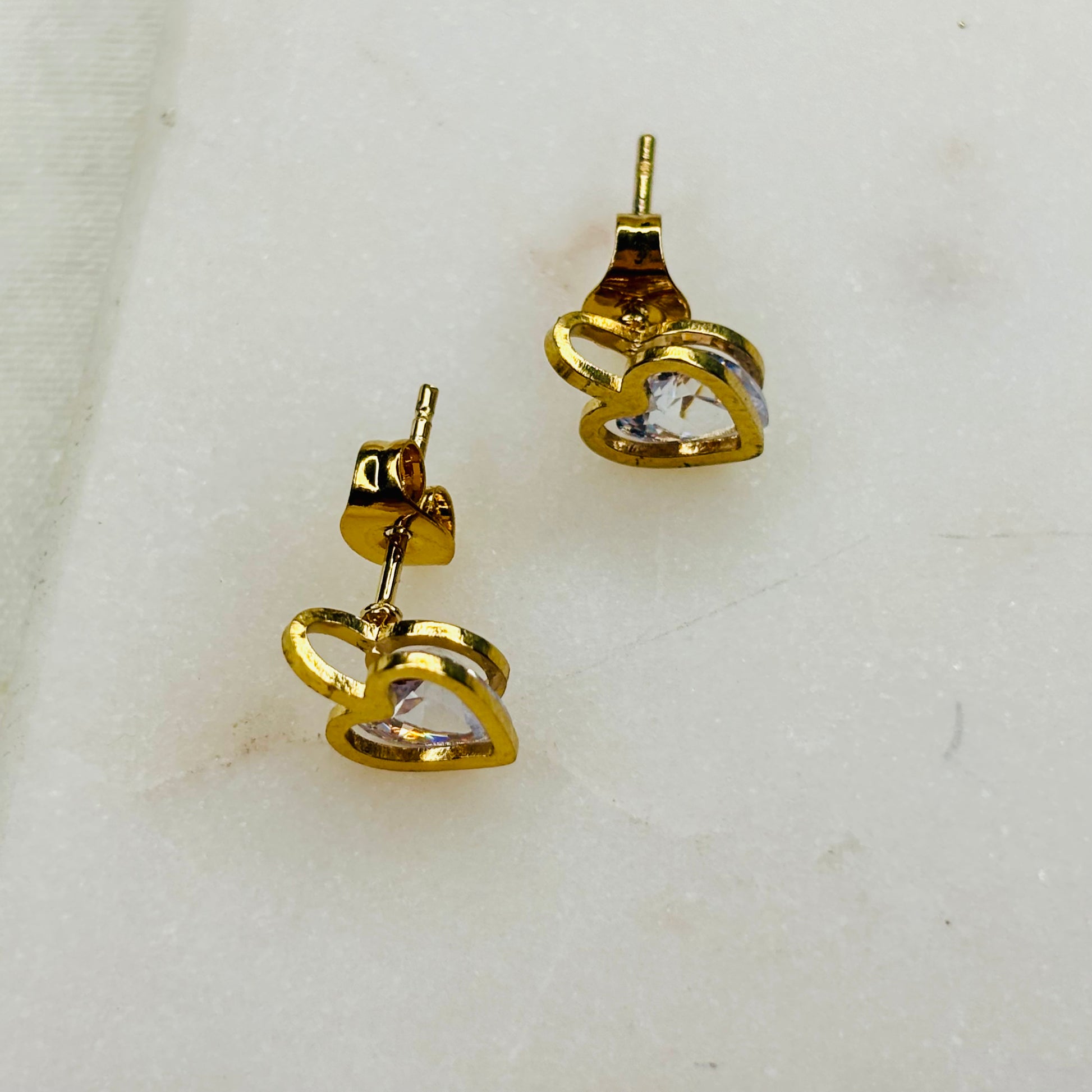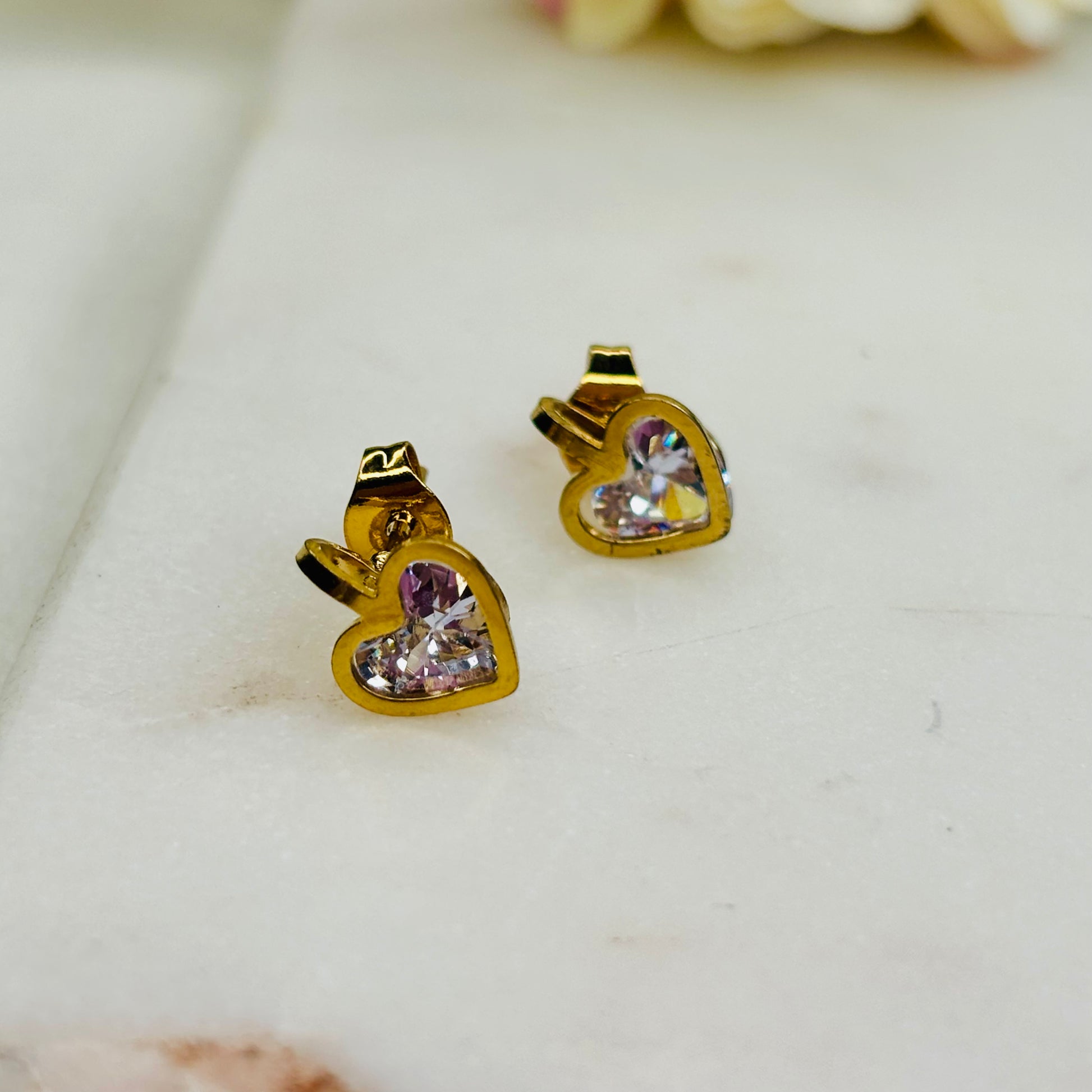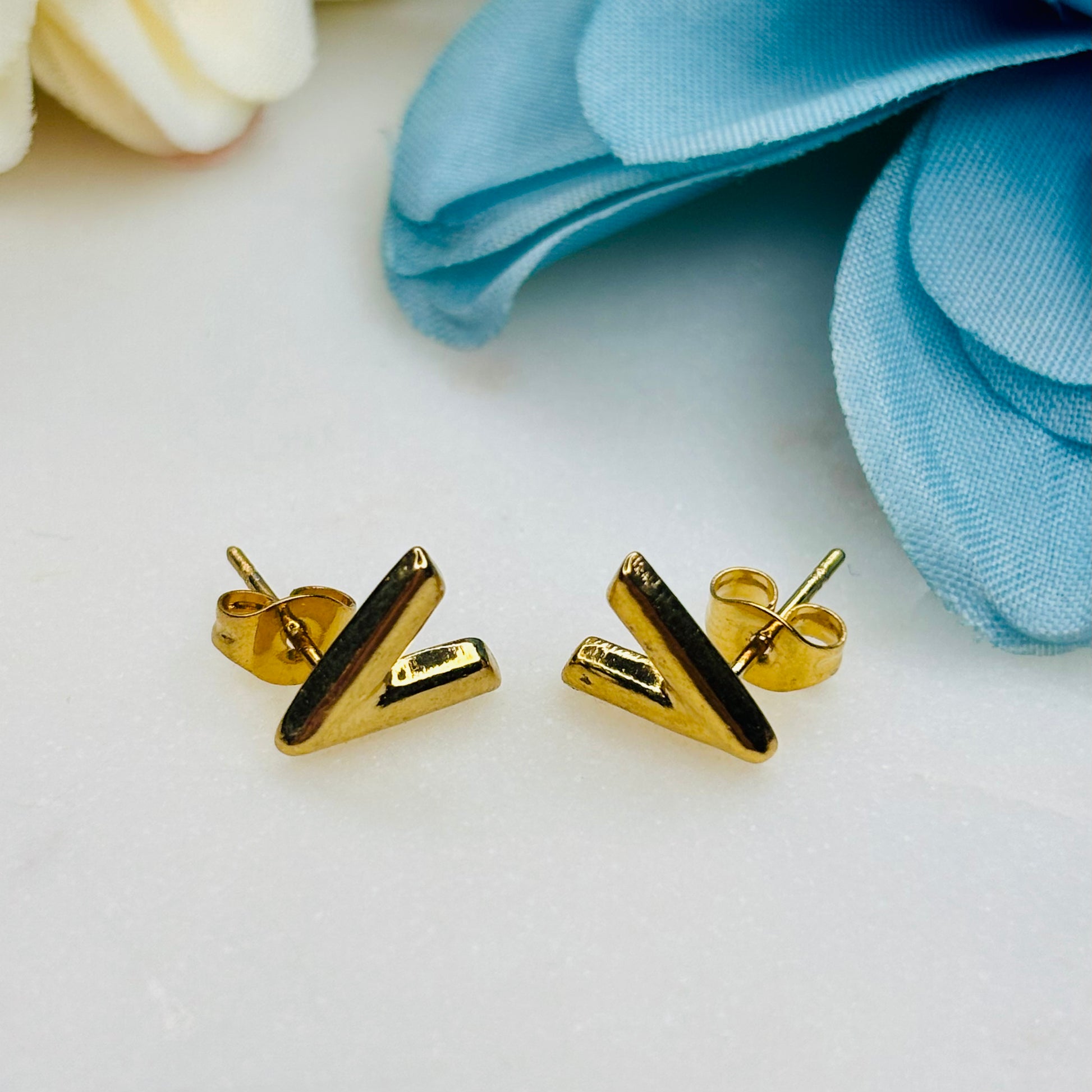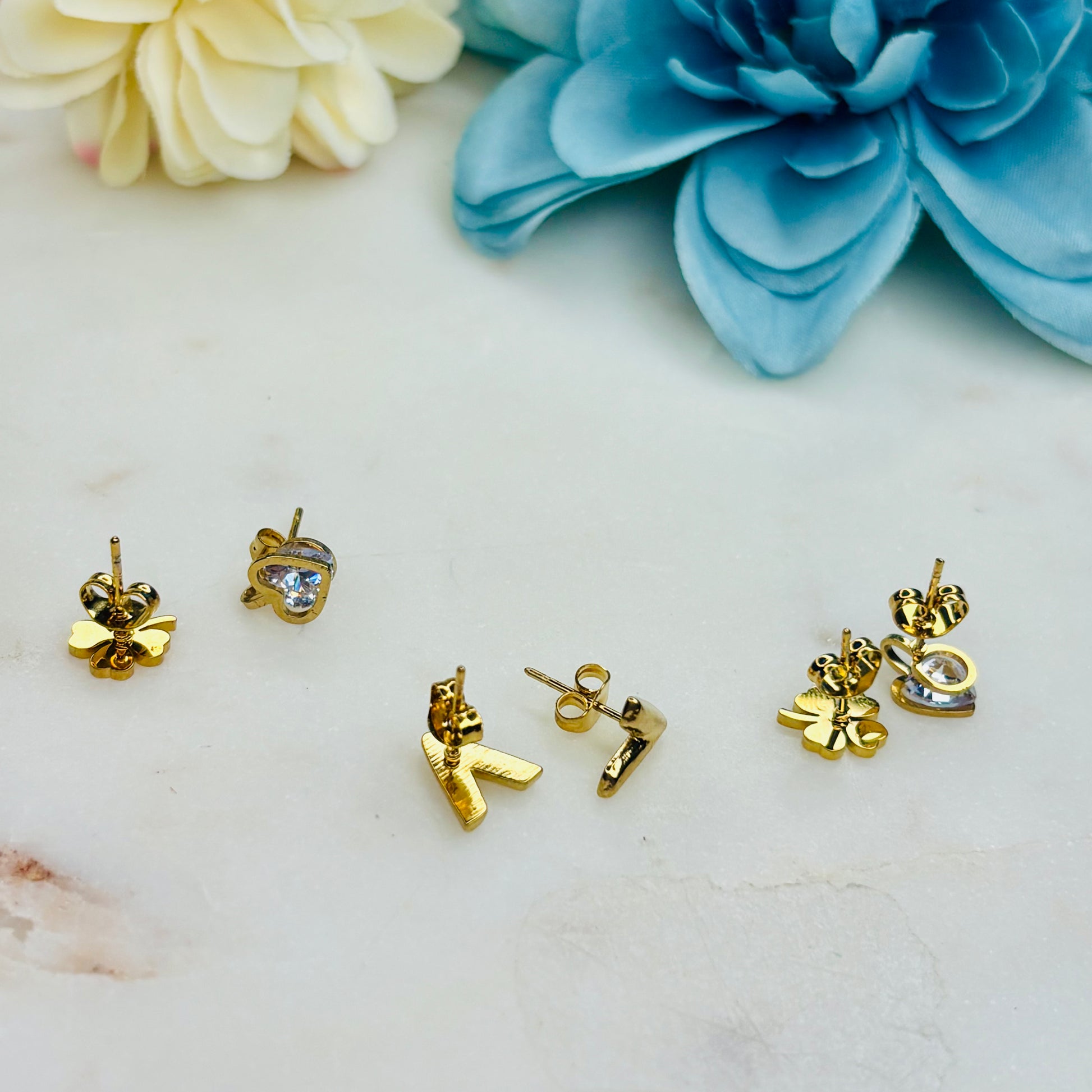 Fun and trendy studs in heart-shaped crystal, minimalist gold “V”, and enamel clover designs in black and yellow.