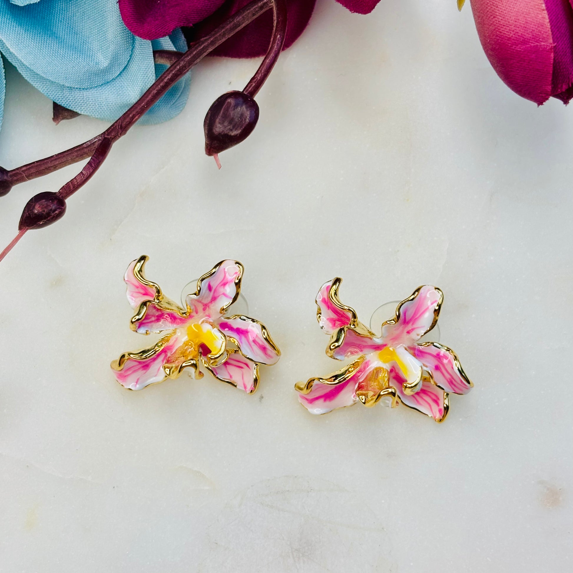 Pink marbled enamel flower earrings with gold-detailed petals and warm yellow centers.