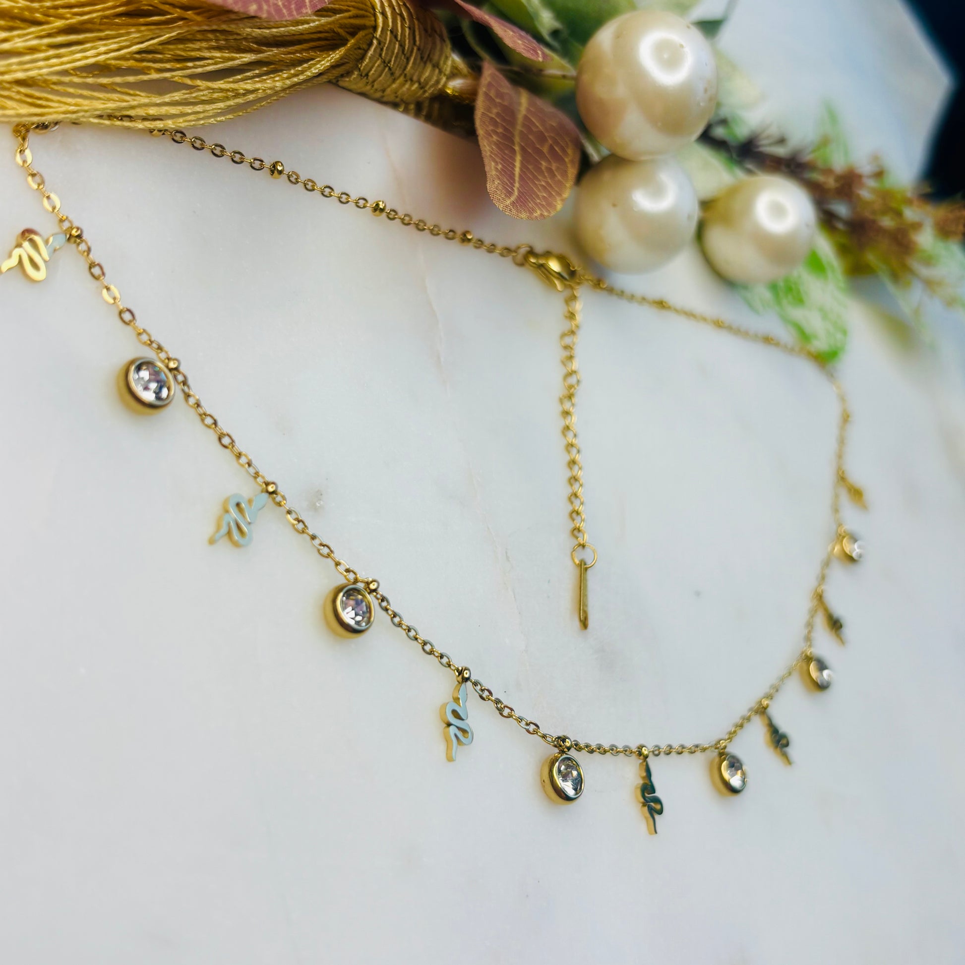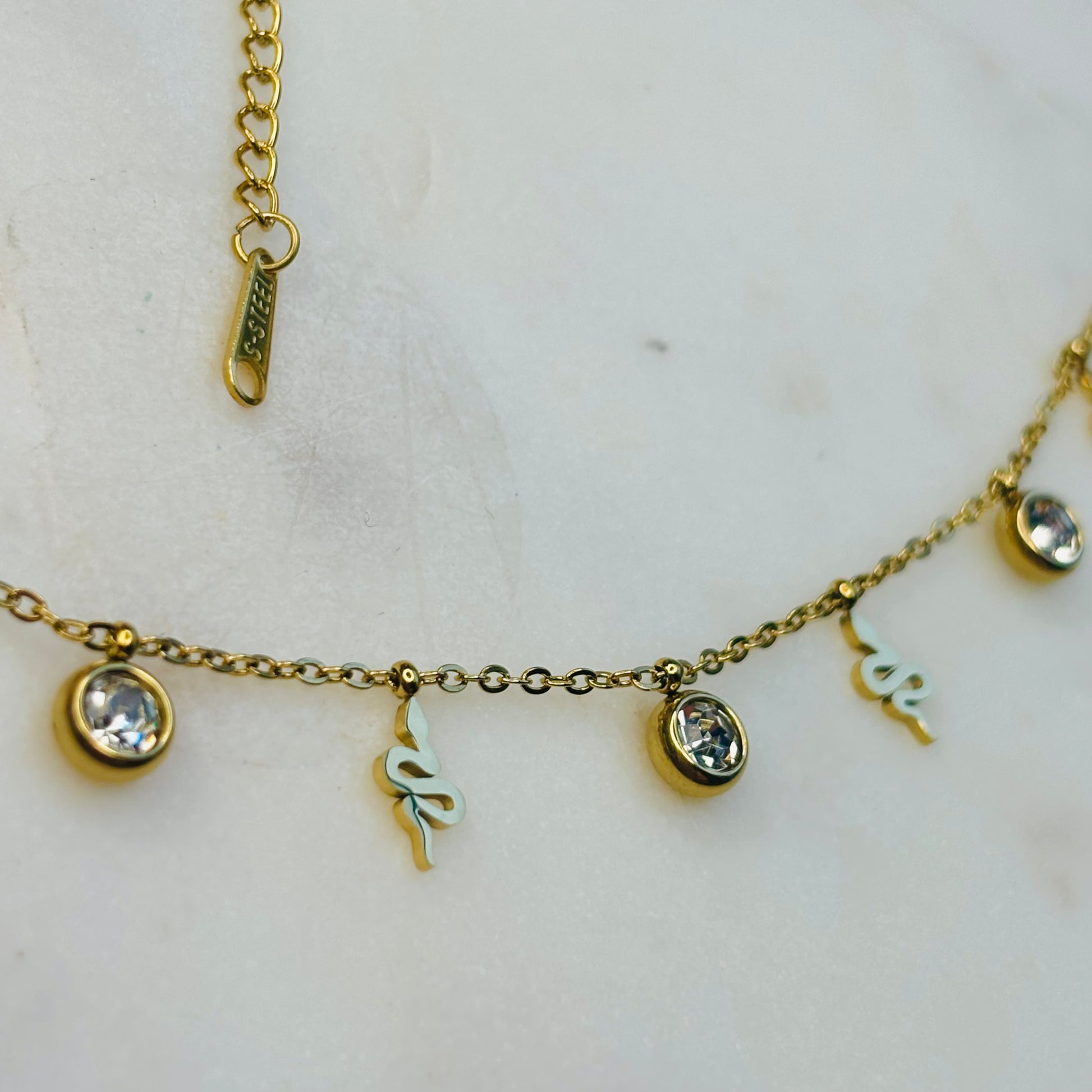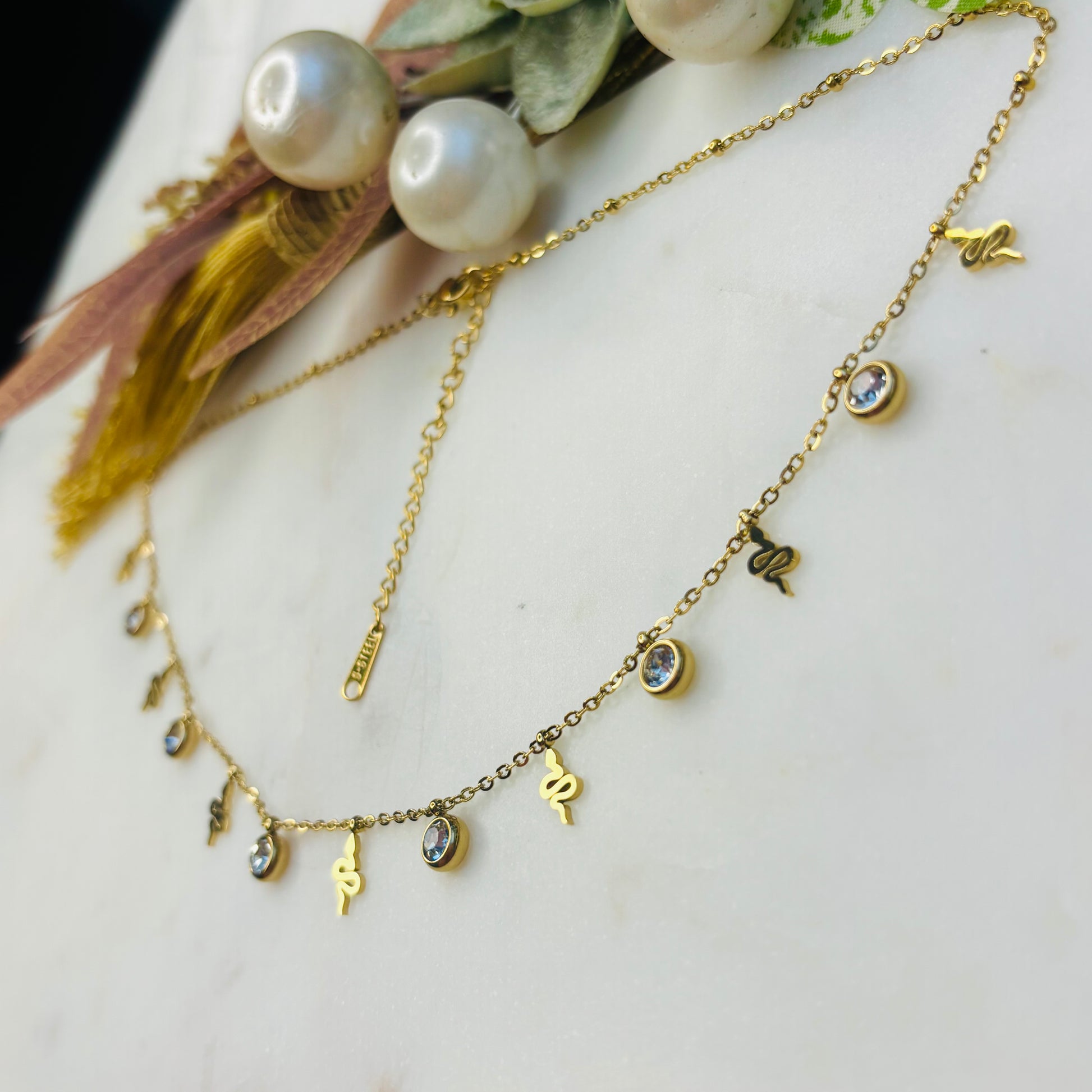 This golden charm necklace features dazzling snake-shaped charms intertwined with sparkling zircon stones for a unique, eye-catching look. Perfect for adding a playful edge to your outfit.