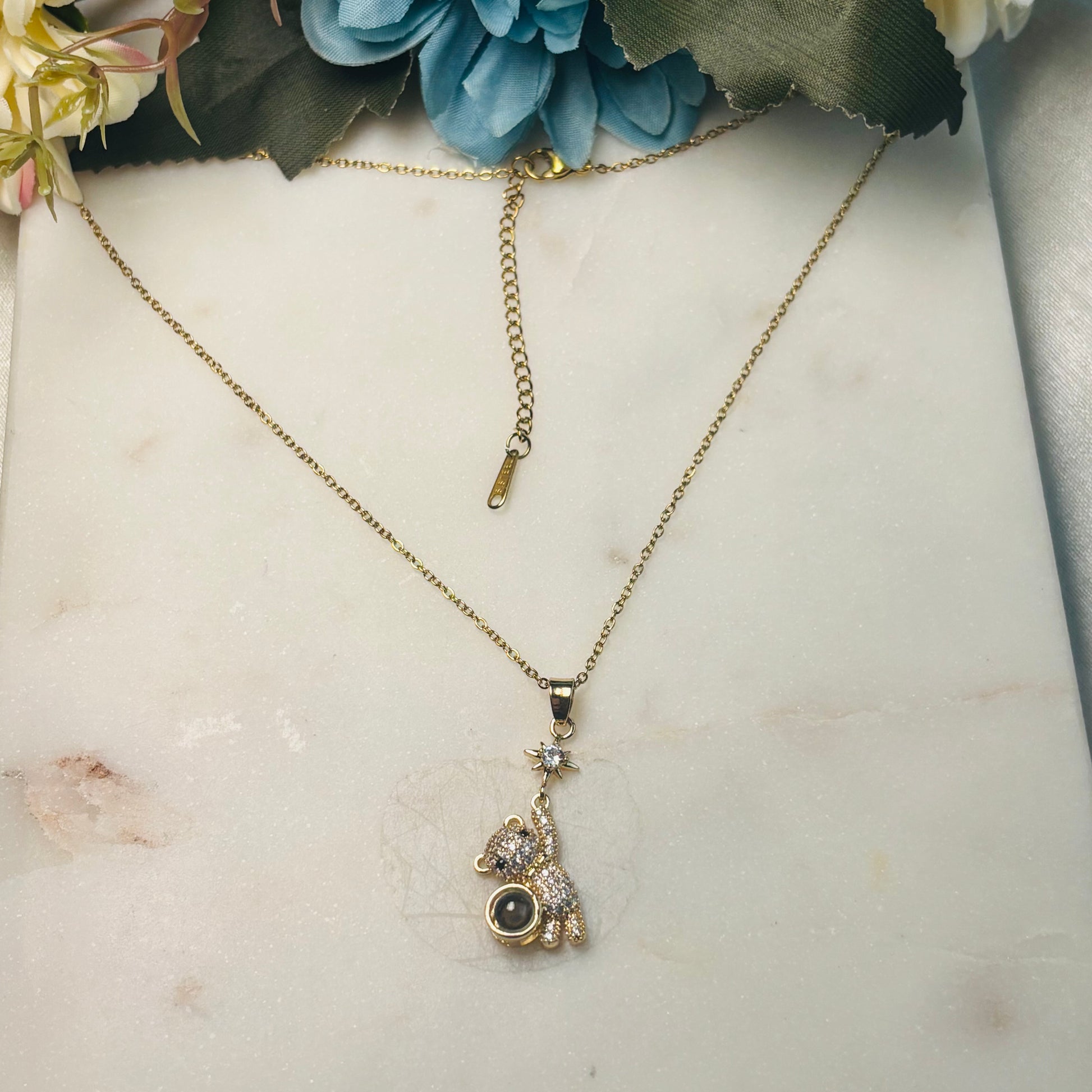 This golden necklace features an adorable zircon teddy bear clutching a sparkling crystal star in one hand and a contrasting dark crystal in the other, adding a whimsical charm to your look.