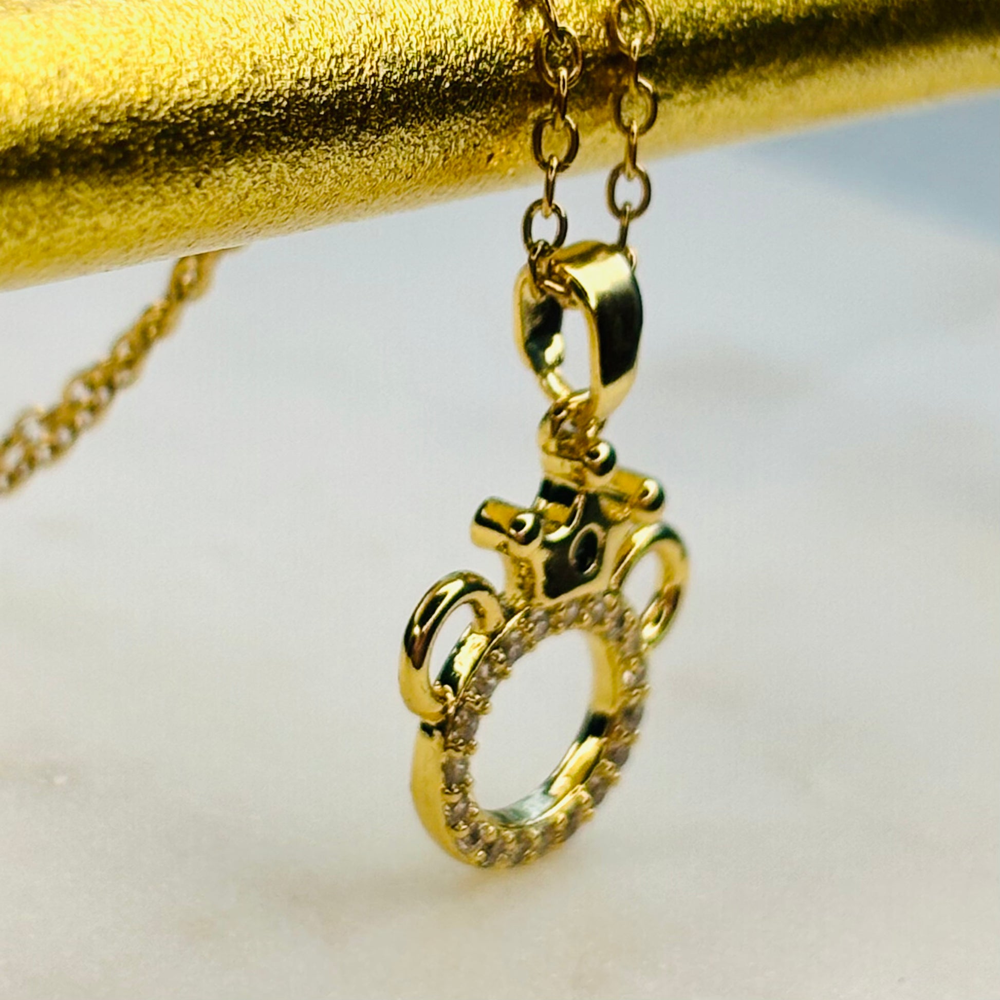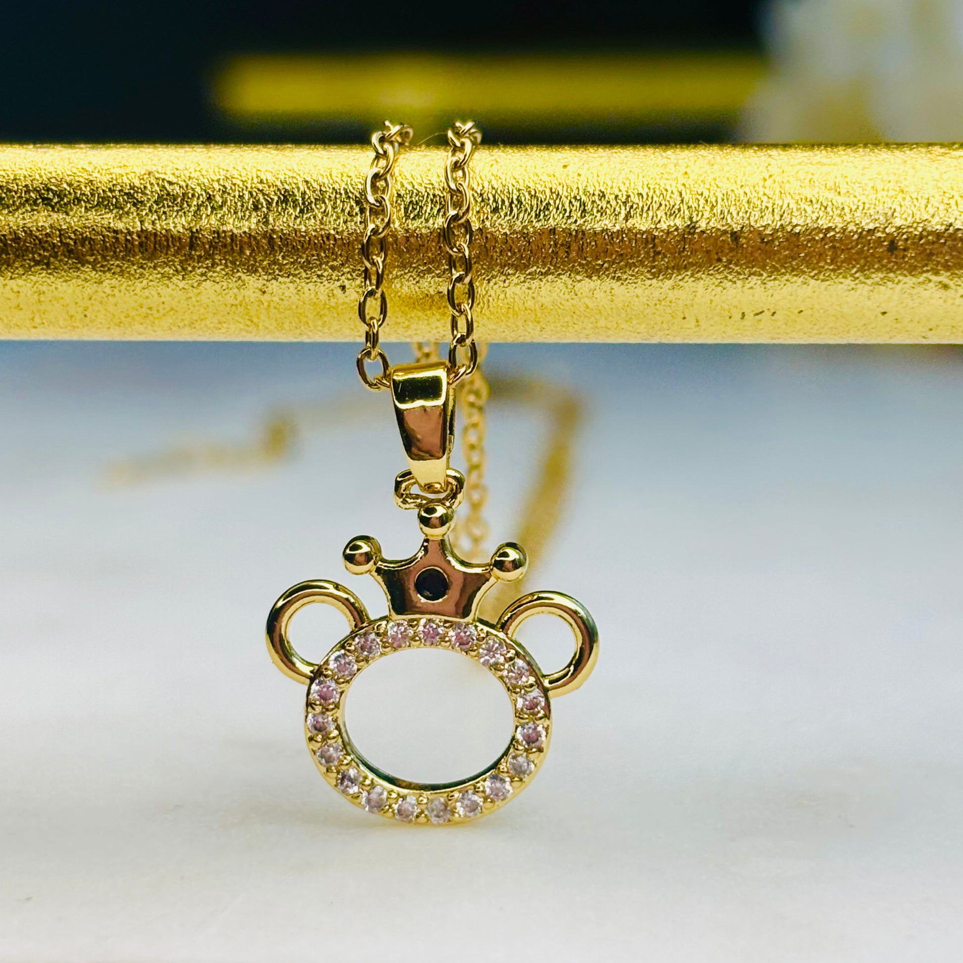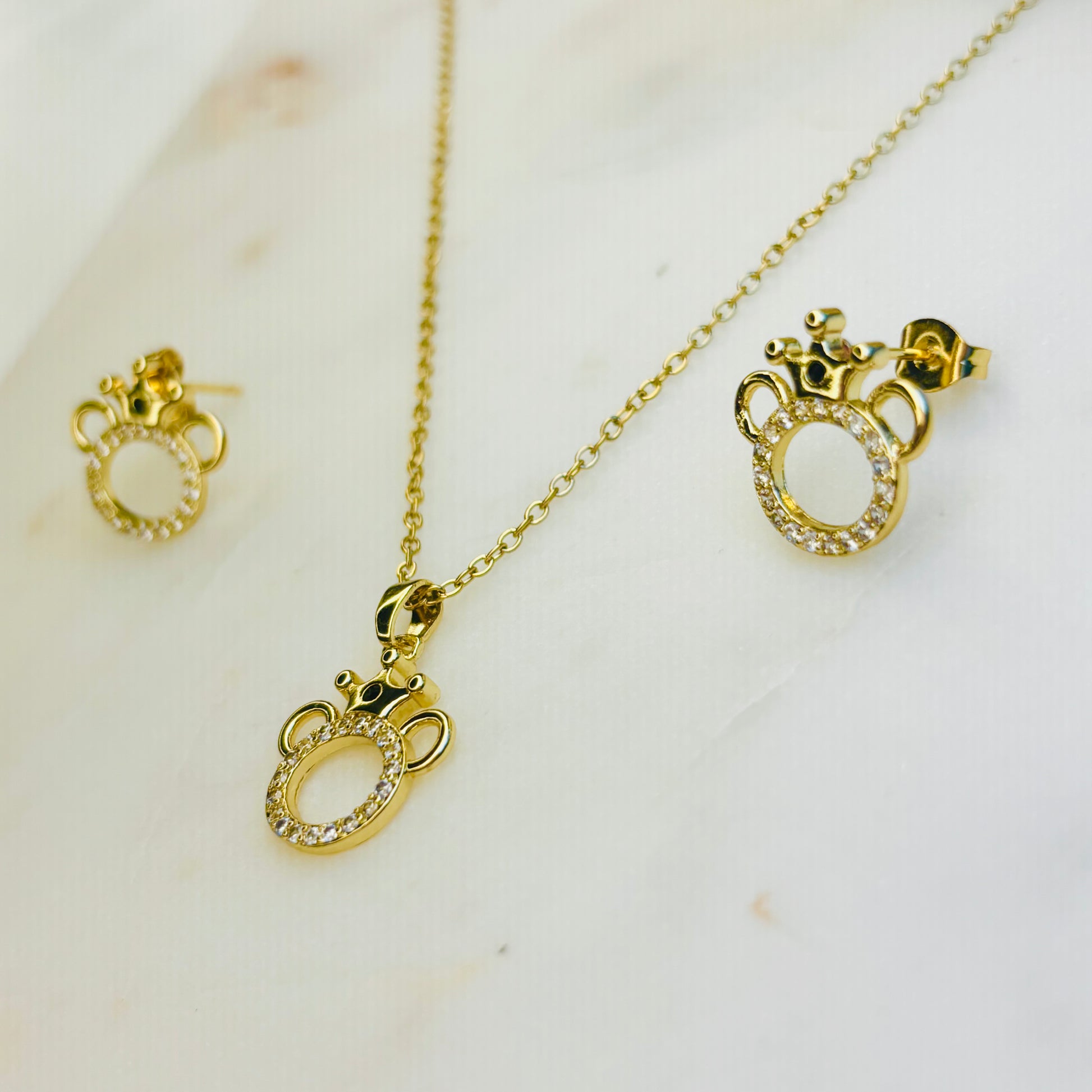 A playful yet refined necklace-and-earring set featuring golden open circles adorned with sparkling cubic zirconia stones. The subtle “teddy ear” crown detail adds a whimsical charm while keeping the design polished enough for everyday wear.