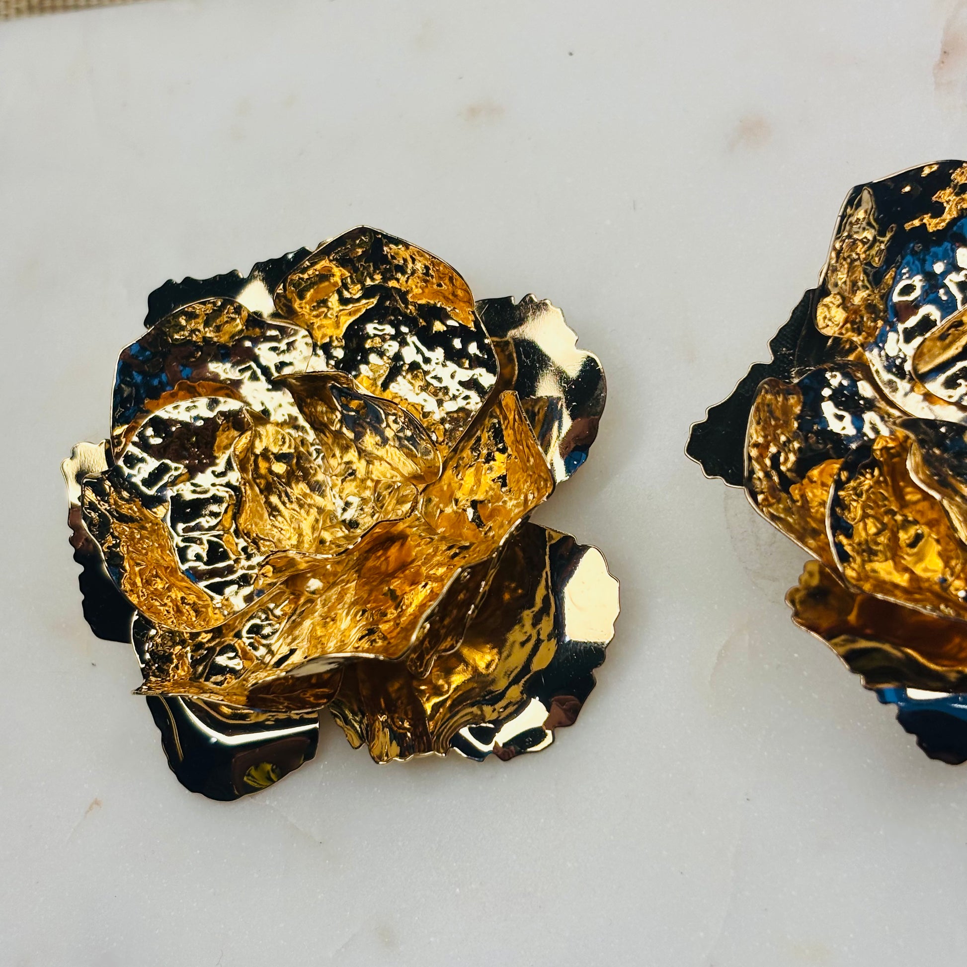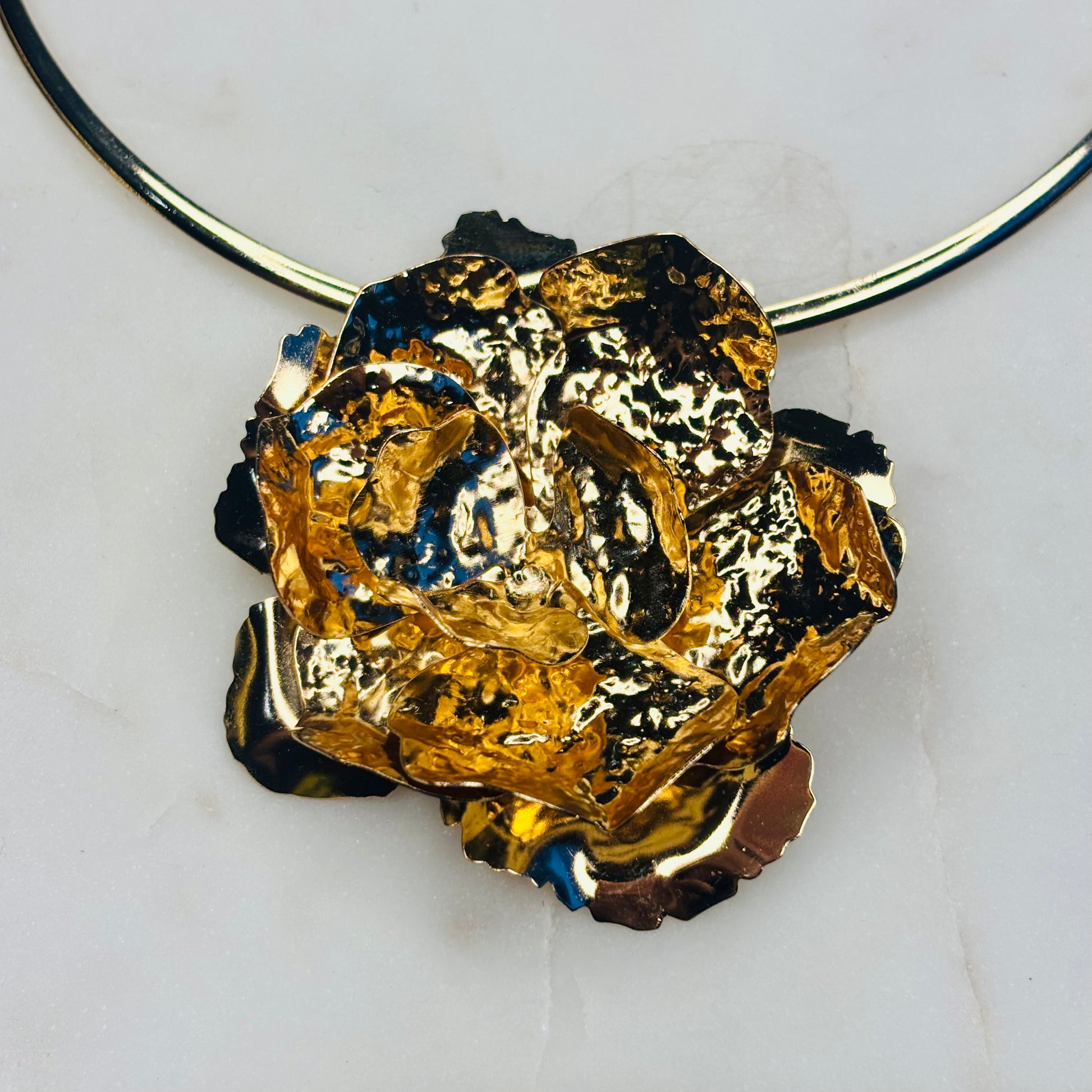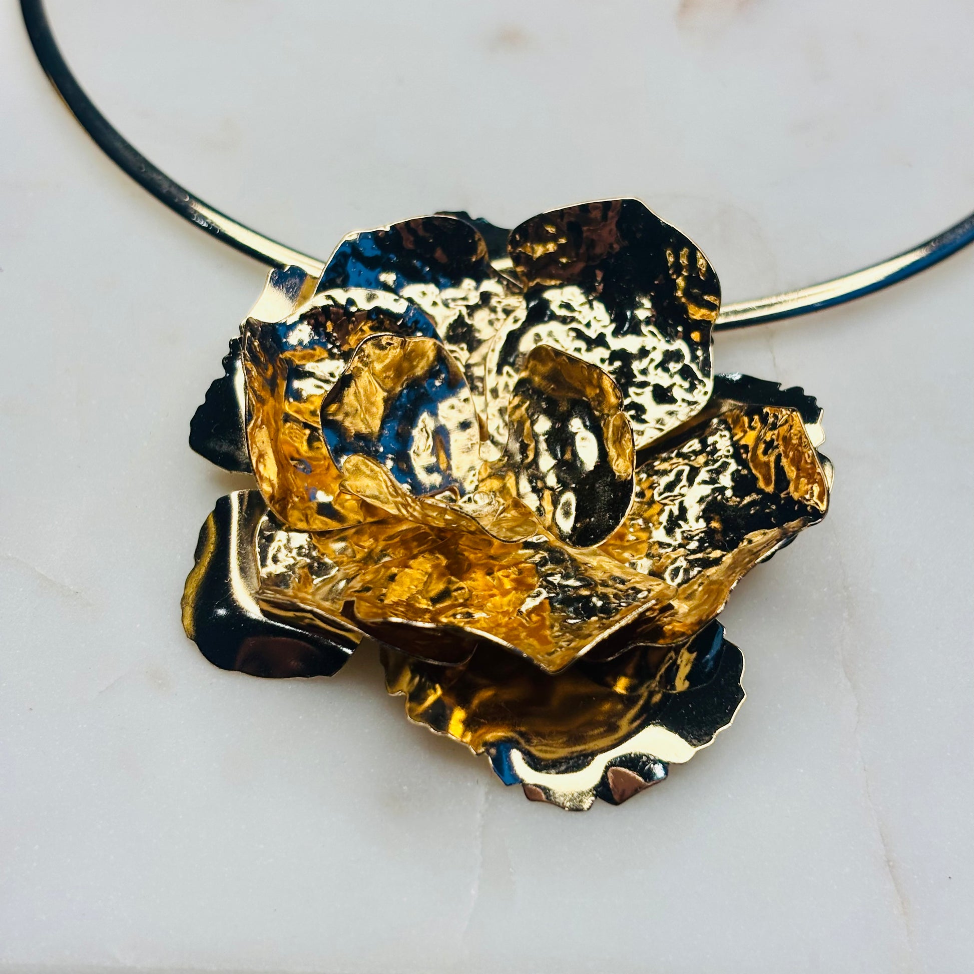 Wear the necklace and earrings with a minimalist, high-quality garment in a stark color like black, white, or deep crimson. The simplicity of the clothing will make the texture and volume of the gold "blooms" truly pop. Wear the choker over a tailored jacket or blazer to add an unexpected, opulent finish to workwear or power dressing. Keep hair styled in a sleek ponytail or updo to showcase the large earrings.