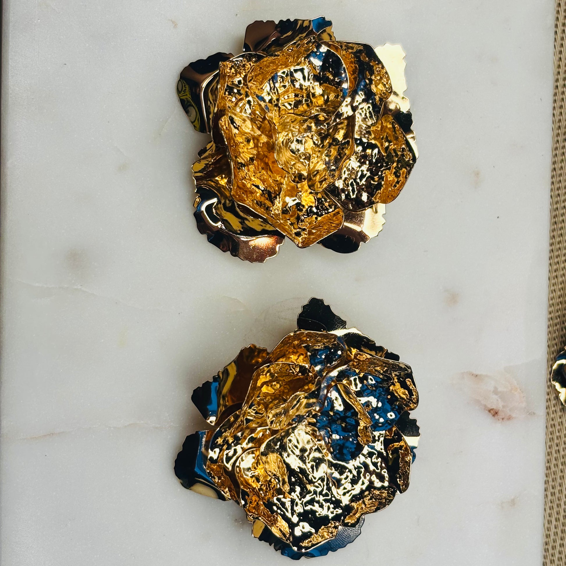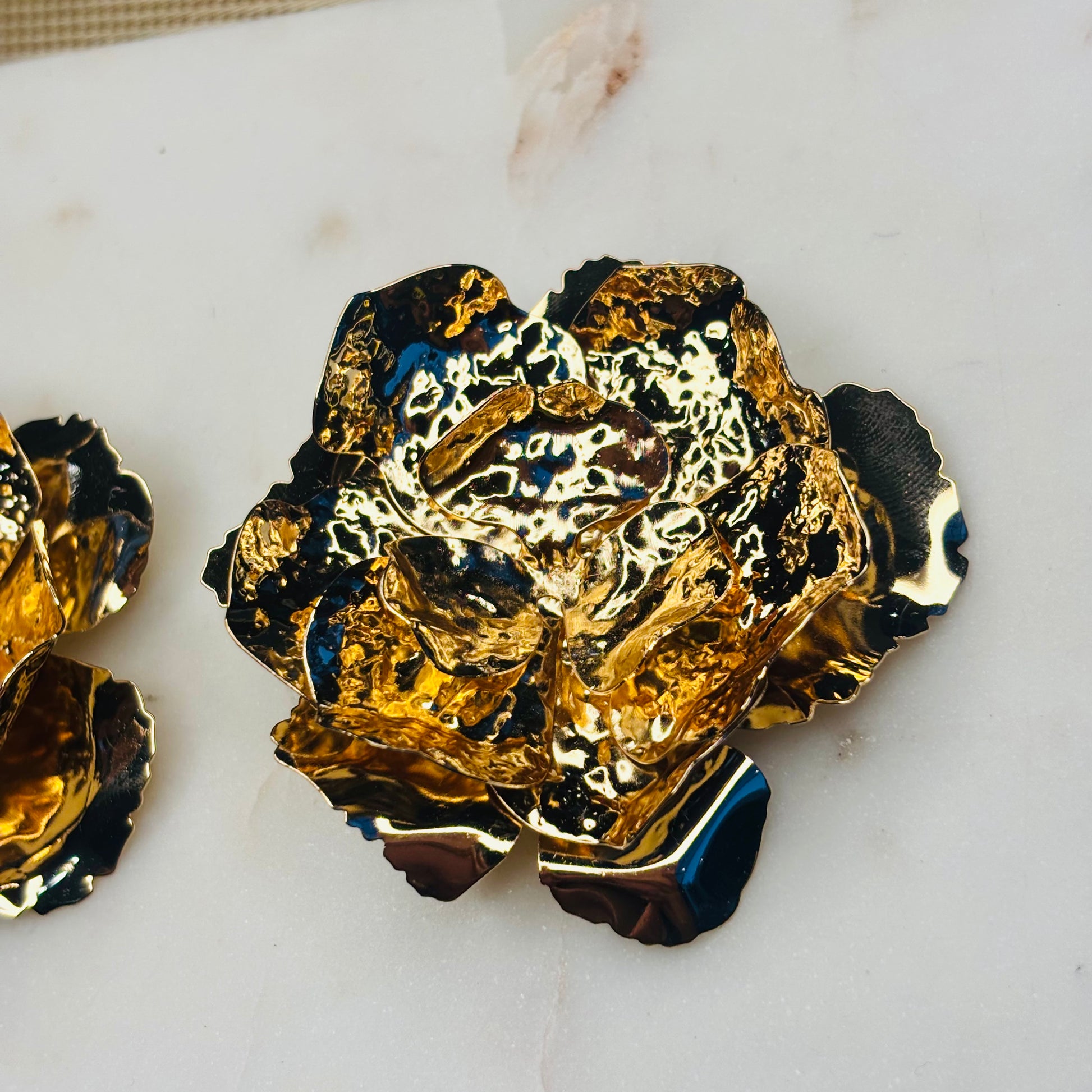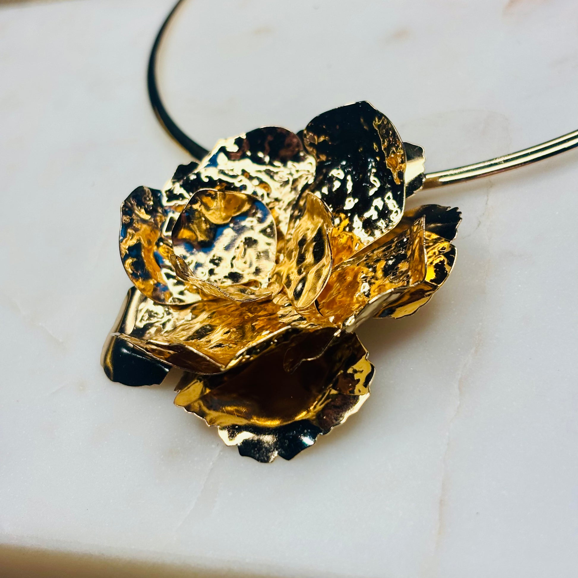 Wear the necklace and earrings with a minimalist, high-quality garment in a stark color like black, white, or deep crimson. The simplicity of the clothing will make the texture and volume of the gold "blooms" truly pop. Wear the choker over a tailored jacket or blazer to add an unexpected, opulent finish to workwear or power dressing. Keep hair styled in a sleek ponytail or updo to showcase the large earrings.