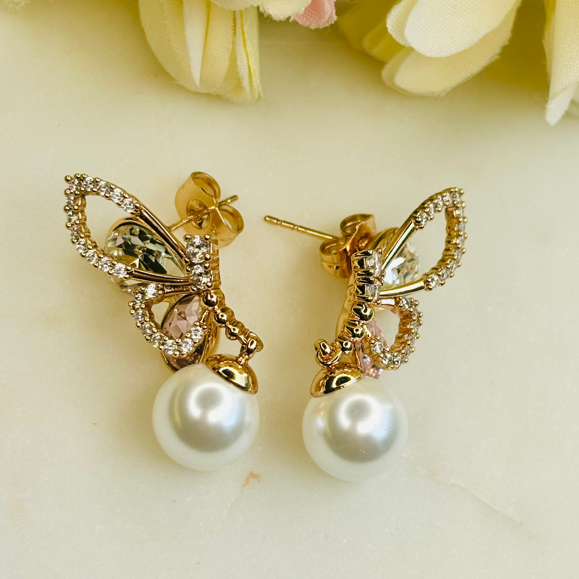 Beautiful gold-tone drop earrings featuring an abstract wing design set with clear and soft pink/champagne cubic zirconia stones, with a luminous white faux pearl dangling from the base.