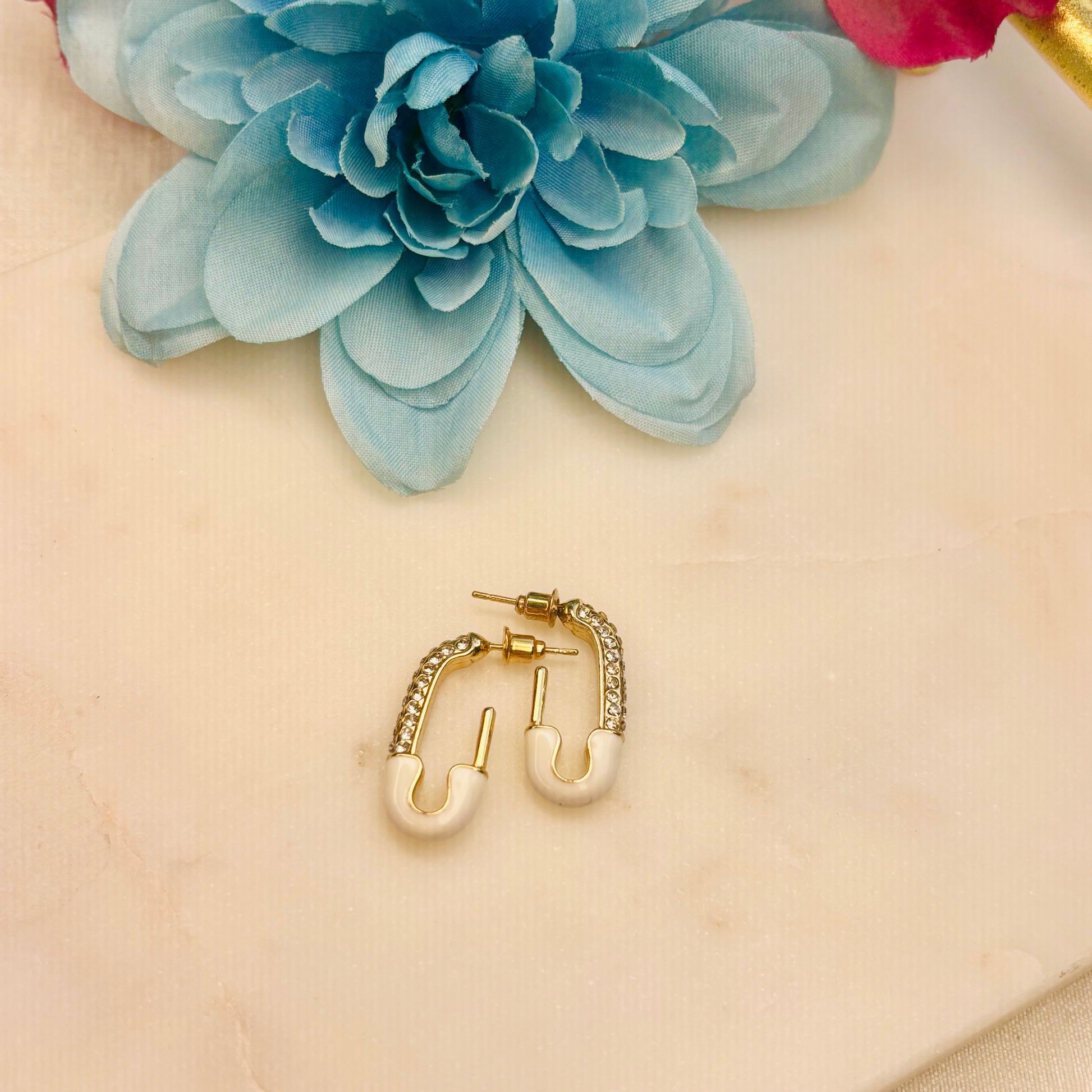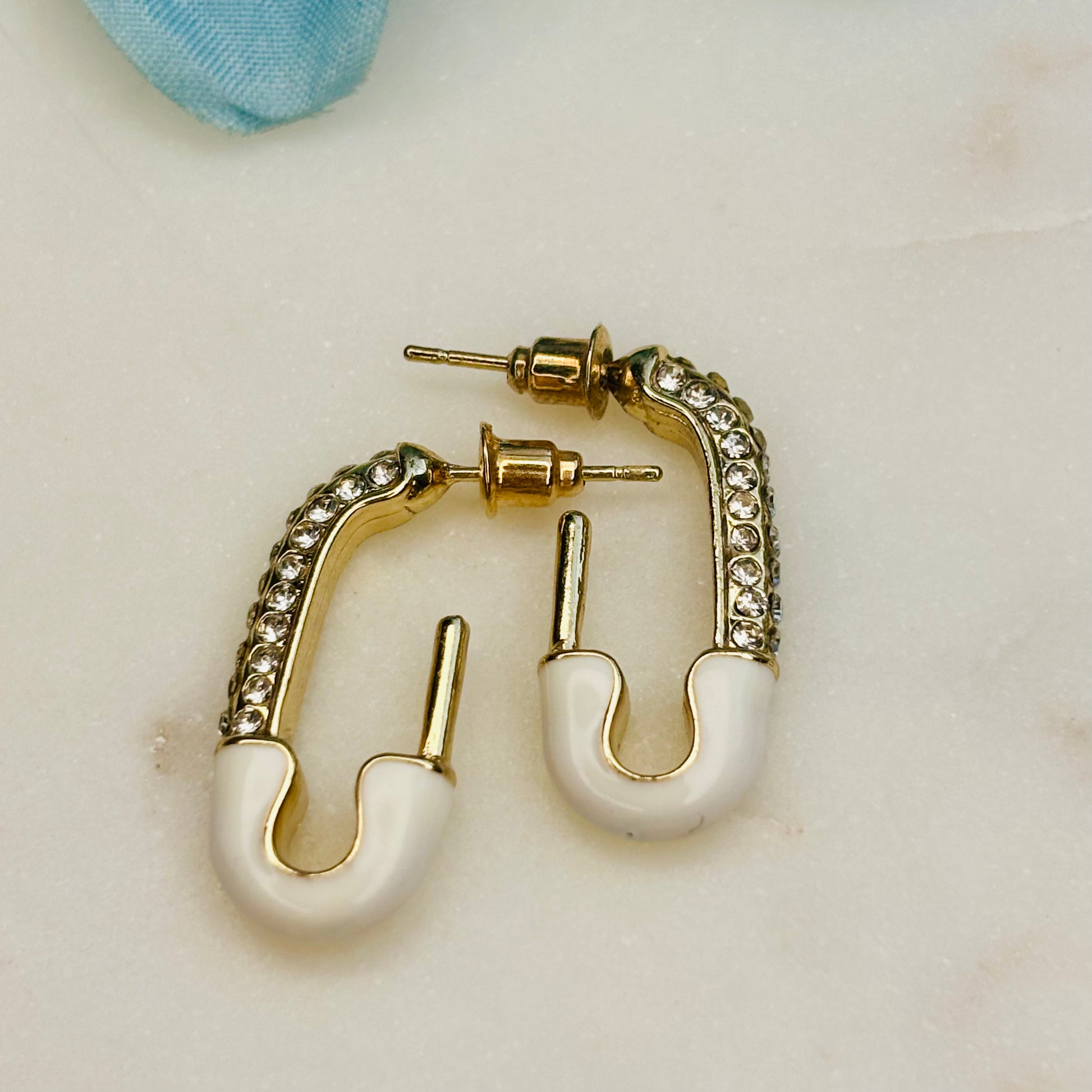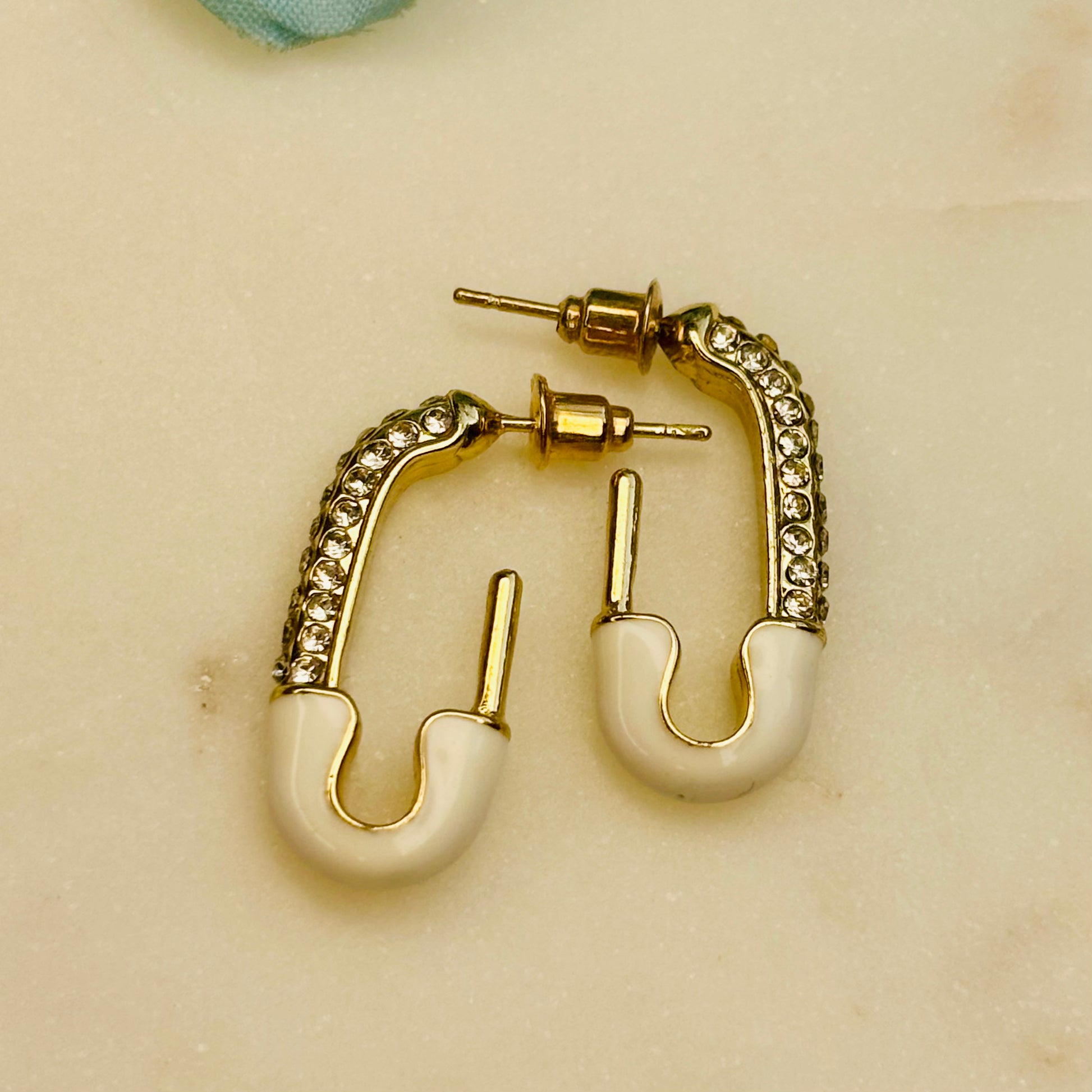 Sleek gold-toned hoops with a half-white enamel finish, topped with a dazzling line of crystals. A clean, modern twist that blends minimalism with playful sparkle.